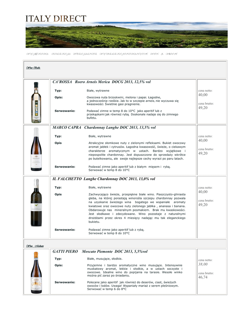WYJĄTKOWA KOLEKCJA SPECJALNIE WYSELEKCJONOWANYCH WIN Z WŁOCH Wino Białe: CA’ROSSA Roero Arneis Merica DOCG 2013, 12,5% vol Typ: Białe, wytrawne Opis: Owocowa nuta brzoskwini, melona i papai. Łagodne, a jednocześnie rześkie. Jak to w szczepie arneis, nie wyczuwa się kwasowości. Świetnie gasi pragnienie. Serwowanie: Podawać zimne w temp 8 do 10°C jako aperitif lub z przekąskami jak również rybą. Doskonale nadaje się do zimnego bufetu. cena netto: 40,00 cena brutto: 49,20 MARCO CAPRA Chardonnay Langhe DOC 2013, 13,5% vol Typ: Białe, wytrawne Opis Atrakcyjne słomkowe nuty z zielonymi refleksami. Bukiet owocowy aromat jabłek i cytrusów. Łagodna kwasowość, świeże, o ciekawym charakterze aromatycznym w ustach. Bardzo wyjątkowe i niepospolite chardonnay. Jest dopuszczone do sprzedaży wkrótce po butelkowaniu, ale swoje najlepsze cechy wyrazi po paru latach. Serwowanie: cena netto: 40,00 cena brutto: 49,20 Podawać zimne jako aperitif lub z białym mięsem i rybą. Serwować w temp 8 do 10°C IL FALCHETTO Langhe Chardonnay DOC 2013, 13,0% vol Typ: Białe, wytrawne Opis Zachwycająco świeże, przepiękne białe wino. Piaszczysto-gliniasta gleba, na której porastają winorośla szczepu chardonnay pozwala na uzyskanie świeżego wina bogatego we wspaniałe aromaty kwiatowe oraz owocowe nuty zielonego jabłka , ananasa i banana. Obdarowuje nas mineralnym posmakiem. Brak mu kwaskowości. Jest słodkawe i zdecydowane. Wino pozostaje z naturalnymi drożdżami przez okres 4 miesięcy nadając mu tak eleganckiego bukietu. Serwowanie: cena netto: 40,00 cena brutto: 49,20 Podawać zimne jako aperitif lub z rybą. Serwować w temp 8 do 10°C Wino Moskato GATTI PIERO Moscato Piemonte DOC 2013, 5,5%vol Typ: Białe, musujące, słodkie. Opis: Przyjemne i bardzo aromatyczne wino musujące. Intensywnie muskatowy aromat, lekkie i słodkie, a w ustach soczyste i owocowe. Idealne wino do popijania na tarasie. Wesołe winko można pić zaraz po śniadaniu. Serwowanie: Polecane jako aperitif jak również do deserów, ciast, świeżych owoców i lodów. Uwaga! Wspaniały mariaż z serem pleśniowym. Serwować w temp 6 do 8°C cena netto: 38,00 cena brutto: 46,74 LA MORANDINA Moscato Piemonte DOCG 2013, 5,5%vol Typ: Białe, musujące, słodkie. Opis: Słodki bukiet świeżości i intensywny aromat miodu, dojrzałych owoców brzoskwini oraz gruszki, a akcent cytrusów uzupełnia całość. Lekkie nieduże, lecz mocne i szybkie bąbelki tańczą w ustach. Pewniak na deser! Serwowanie: cena netto: 38,00 cena brutto: 46,74 Idealne do deserów, ciast i świeżych owoców, polecane również do przekąsek. Fantastyczne do serów z przerostem niebieskiej pleśni. Serwować zimne w temp 6 do 8°C Wino Rose: DESTEFANIS Vino Rosatto Nebbiolo 2013, 13% vol Typ: Różowe, wytrawne Opis: Certyfikowane ekologiczne wino produkowane klasycznym systemem guyot. U ustach rześkie i soczyste, jak to Nebbiolo. Róża i czereśnie z lekką nutą pieprzną. Świeże i przyjazne na podniebieniu. Doskonale dopasowuje się do letniej kuchni. Serwowanie: cena netto: 40,00 cena brutto: 49,20 Świetnie sprawuje się jako aperitif . My polecamy razem z rybami i owocami morza. Serwować zimne w temp 6 do 8°C. LA MORANDINA Rose Spumante DOCG 2014, 12% vol Typ: Opis: Serwowanie: Różowe, musujące, wytrawne. Gwarancja radosnego, udanego i smacznego toastu niezależnie od okazji. Eleganckie różowe wytrawne wino musujące. Bardzo przyjemne i okragłe na podniebieniu z wyczuwalnymi akcentami kwiatów i owoców. To umiejętne połączenie szczepów Chardonnay, Malvasia Freisa nadało mu wyjątkowy charakter. Wspaniale odświeża i gasi pragnienie. cena netto: 38,00 cena brutto: 46,74 Polecane na Sylwestra, jako aperitif oraz do ciast jak również do przekąsek. Serwować zimne w temp 6 do 8°C. Wino Czerwone: LA MORANDINA “5 Vignes” Barbera d’Asti DOCG 2012, 13% vol Typ: Czerwone, wytrawne Opis: Świeże i zwiewne. Fantastyczne wino, które nie potrzebuje specjalnych okazji. Nuty czereśni i jagody. Młodzieńcza werwa nadaje mu świeży aromat. Eleganckie i przyjemne, w spożyciu wyjątkowo aksamitne. Wspaniałe do codziennych prostych posików. Umila każdy dzień! Serwowanie: cena netto: 40,00 cena brutto: 49,20 Idealne do sałatek, makaronów oraz serów. Serwować lekko schłodzone do temp 16°C. LA MORANDINA “Zuchetto” Barbera d’Asti DOCG 2012, 14% vol Typ: Czerwone, wytrawne Opis: Ma w sobie dużo ogłady. Eteryczne oraz bardzo miękkie. Wysublimowane w smaku. Niewiarygodnie bogate i treściwe. Zaskakuje siłą i koncentracją. Urzeka aromat czereśni, wiśni i leśnych owoców. Mocna rubinowa barwa. Finezyjne wino, jego zalety znacznie przekraczają swoją cenę. Posmakuje nawet tym, którzy na winie znają się mniej niż więcej. Serwowanie: Parować z czerwonym mięsem, makaronami lub z czym się chce. Idealne w temp. 16 do 18°C. cena netto: 45,00 cena brutto: 55,35 LA MORANDINA “Varmat” Barbera d’Asti DOCG Superiore 2012, 14,5% vol Typ: Czerwone, wytrawne Opis: Powstaje z wartościowej parceli, bo krzewy mają do 120 lat lat. Limitowana produkcja tylko 3000 butelek rocznie. Trunek od początku jest skoncentrowany i tajemniczy. Ciepłe i przenikliwe uwodzi bogatym bukietem. Wyrażnie czujemy śliwki oraz owoce leśne. Bardzo okrągłe taniny doskonale zbalansowane z kwasowością. Elegancki głęboki kolor. Wino kompletne i mocnym posmaku oraz pięknym finiszu. Serwowanie: cena netto: 95,00 cena brutto: 116,85 Zalecane dekantowanie. Temperatura idealna to 18-19°C w kieliszku burgundzkim. LA MORANDINA “Bricco –Spessa” Barbaresco DOCG 2010, 14,5% vol Typ: Czerwone, wytrawne Opis: Klasyczne wielkie wino z Piedmontu. Ze szczytu wzgórza w Neive. Robione w sposób naturalny. Leżakuje w beczkach przez 2 lata. Paleta bogata, świeża i poukładana ewoluuje w finiszu identyfikując osobowość tego wina. Ma przynajmniej paroletni potencjał rozwoju. Kolor głebokiego owocu granatu z barwam