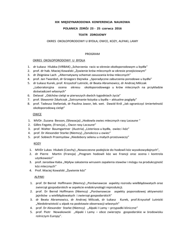 XIX MIĘDZYNARODOWA KONFERENCJA NAUKOWA POLANICA ZDRÓJ 23 - 25 czerwca 2016 TEATR ZDROJOWY OKRES OKOŁOPORODOWY U BYDŁA; OWCE, KOZY, ALPAKI, LAMY PROGRAM OKRES OKOŁOPORODOWY U BYDŁA 1. 2. 3. 4. 5. dr Łukasz Hlubka (VIRBAK) „Schorzenia racic w okresie okołoporodowym u bydła” prof. dr hab. Maciej Kowalski „Żywienie krów mlecznych w okresie przejściowym” dr Zbigniew Lach „Alternatywny schemat zasuszania krów mlecznych” prof. Jan Twardoń, dr Grzegorz Dejneka „Sporadyczne zaburzenia porodowe u bydła” dr Łukasz Kurek, prof. Krzysztof Lutnicki, dr Beata Abramowicz, dr Andrzej Milczak „Laboratoryjna ocena okresu okołoporodowego u krów mlecznych na przykładzie doświadczeń własnych” 6. Delaval „Odchów cieląt w pierwszych dwóch tygodniach życia” 7. prof. Sławomir Zduńczyk „Zatrzymanie łożyska u bydła – aktualne poglądy” 8. prof. Tadeusz Stefaniak, dr Paulina Jawor, lek. wet. Dawid Król „Jak ograniczyć śmiertelność okołoporodową cieląt” OWCE 1. 2. 3. 4. 5. MVDr. Zuzana Besson, (Słowacja) „Hodowla owiec mlecznych rasy Lacaune “ Gilles Fegate, (Francja) „ Owce rasy Lacaune” prof. Walter Baumgartner (Austria) „Listerioza u bydła, owiec i kóz” prof. Dr Alexander Starke (Niemcy) „Zanokcica u owiec” prof. Sobiech Przemysław „Niedobory selenu u małych przeżuwaczy” KOZY 1. MVDr Lukas Hlubek (Czechy) „Nowoczesne podejście do hodowli kóz wysokowydajnych”, 2. dr Pierre Martin (Francja) „Program hodowli kóz we Francji oraz ocena i kontrola użytkowości” 3. prof. Jarosław Kaba „Wpływ zakażenia wirusem zapalenia stawów i mózgu na produkcyjność kóz mlecznych” 4. Prof. Maciej Kowalski „Żywienie kóz” ALPAKI 1. prof. Dr Bernd Hoffmann (Niemcy) „Porównawcze aspekty rozrodu wielbłądowatych oraz zwierząt gospodarskich w aspekcie endokrynologii reprodukcji. 2. prof. Dr Bernd Hoffmann (Niemcy) „Porównawcze aspekty poporodowej aktywności jajników u wielbłądowatych i zwierząt gospodarskich” 3. dr Beata Abramowicz, dr Andrzej Milczak, dr Łukasz Kurek, prof.Krzysztof Lutnicki „Niedokrwistość u alpak na podstawie obserwacji własnych” 4. prof. Dr Alexander Starke (Niemcy) „Alpaki I Lamy – przypadki kliniczne” 5. prof. Piotr Nowakowski „Alpaki i Lamy – obce zwierzęta gospodarskie w środowisku rolniczym Europy”.