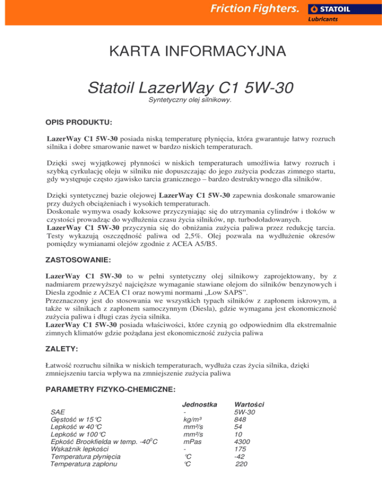 KARTA INFORMACYJNA Statoil LazerWay C1 5W-30 Syntetyczny olej silnikowy. OPIS PRODUKTU: LazerWay C1 5W-30 posiada nisk temperatur płyni cia, która gwarantuje łatwy rozruch silnika i dobre smarowanie nawet w bardzo niskich temperaturach. Dzi ki swej wyj tkowej płynno ci w niskich temperaturach umo liwia łatwy rozruch i szybk cyrkulacj oleju w silniku nie dopuszczaj c do jego zu ycia podczas zimnego startu, gdy wyst puje cz sto zjawisko tarcia granicznego – bardzo destruktywnego dla silników. Dzi ki syntetycznej bazie olejowej LazerWay C1 5W-30 zapewnia doskonale smarowanie przy du ych obci eniach i wysokich temperaturach. Doskonale wymywa osady koksowe przyczyniaj c si do utrzymania cylindrów i tłoków w czysto ci prowadz c do wydłu enia czasu ycia silników, np. turbodoładowanych. LazerWay C1 5W-30 przyczynia si do obni ania zu ycia paliwa przez redukcj tarcia. Testy wykazuj oszcz dno paliwa od 2,5%. Olej pozwala na wydłu enie okresów pomi dzy wymianami olejów zgodnie z ACEA A5/B5. ZASTOSOWANIE: LazerWay C1 5W-30 to w pełni syntetyczny olej silnikowy zaprojektowany, by z nadmiarem przewy szy najci sze wymaganie stawiane olejom do silników benzynowych i Diesla zgodnie z ACEA C1 oraz nowymi normami „Low SAPS”. Przeznaczony jest do stosowania we wszystkich typach silników z zapłonem iskrowym, a tak e w silnikach z zapłonem samoczynnym (Diesla), gdzie wymagana jest ekonomiczno zu ycia paliwa i długi czas ycia silnika. LazerWay C1 5W-30 posiada wła ciwo ci, które czyni go odpowiednim dla ekstremalnie zimnych klimatów gdzie po dana jest ekonomiczno zu ycia paliwa ZALETY: Łatwo rozruchu silnika w niskich temperaturach, wydłu a czas ycia silnika, dzi ki zmniejszeniu tarcia wpływa na zmniejszenie zu ycia paliwa PARAMETRY FIZYKO-CHEMICZNE: SAE G sto w 15°C Lepko w 40°C Lepko w 100°C Epko Brookfielda w temp. -400C Wska nik lepko ci Temperatura płyni cia Temperatura zapłonu Jednostka kg/m³ mm²/s mm²/s mPas °C °C Warto ci 5W-30 848 54 10 4300 175 -42 220 Popiół siarczanowy Wt% 0,4 TESTY I APROBATY: ACEA A5/B5/C1 ; M111 FE > 2,5 % (Fuel economy test) , JASO DL-1 KARTA BEZPIECZE STWA PRODUKTU: Wszystkie informacje dotycz ce Zdrowia, Bezpiecze stwa i rodowiska oraz inne specyficzne informacje powinny by zaczerpni te z Karty Charakterystyki Substancji Niebezpiecznej i Preparatu Niebezpiecznego.