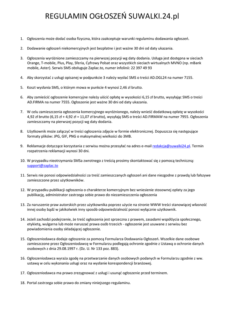 REGULAMIN OGŁOSZEŃ SUWALKI.24.pl 1. Ogłoszenia może dodać osoba fizyczna, która zaakceptuje warunki regulaminu dodawania ogłoszeń. 2. Dodawanie ogłoszeń niekomercyjnych jest bezpłatne i jest ważne 30 dni od daty ukazania. 3. Ogłoszenia wyróżnione zamieszczamy na pierwszej pozycji wg daty dodania. Usługa jest dostępna w sieciach Orange, T-mobile, Plus, Play, Sferia, Cyfrowy Polsat oraz wszystkich sieciach wirtualnych MVNO (np. mBank mobile, Aster). Serwis SMS obsługuje Zaplac.to, numer infolinii: 22 397 49 93 4. Aby skorzystać z usługi opisanej w podpunkcie 3 należy wysłać SMS o treści AD.OGL24 na numer 7155. 5. Koszt wysłania SMS, o którym mowa w punkcie 4 wynosi 2,46 zł brutto. 6. Aby zamieścić ogłoszenie komercyjne należy uiścić opłatę w wysokości 6,15 zł brutto, wysyłając SMS o treści AD.FIRMA na numer 7555. Ogłoszenie jest ważne 30 dni od daty ukazania. 7. W celu zamieszczenia ogłoszenia komercyjnego wyróżnionego, należy wnieść dodatkową opłatę w wysokości 4,92 zł brutto (6,15 zł + 4,92 zł = 11,07 zł brutto), wysyłają SMS o treści AD.FIRMAW na numer 7955. Ogłoszenia zamieszczamy na pierwszej pozycji wg daty dodania. 8. Użytkownik może załączyć w treści ogłoszenia zdjęcie w formie elektronicznej. Dopuszcza się następujące formaty plików: JPG, GIF, PNG o maksymalnej wielkości do 3MB. 9. Reklamacje dotyczące korzystania z serwisu można przesyłać na adres e-mail [email protected]. Termin rozpatrzenia reklamacji wynosi 30 dni. 10. W przypadku nieotrzymania SMSa zwrotnego z treścią prosimy skontaktować się z pomocą techniczną: [email protected] 11. Serwis nie ponosi odpowiedzialności za treść zamieszczanych ogłoszeń ani dane niezgodne z prawdą lub fałszywe zamieszczone przez użytkowników. 12. W przypadku publikacji ogłoszenia o charakterze komercyjnym bez wniesienie stosownej opłaty za jego publikację, administrator zastrzega sobie prawo do niezamieszczenia ogłoszenia 13. Za naruszenie praw autorskich przez użytkownika poprzez użycie na stronie WWW treści stanowiącej własność innej osoby bądź w jakikolwiek inny sposób odpowiedzialność ponosi wyłącznie użytkownik. 14. Jeżeli zachodzi podejrzenie, że treść ogłoszenia jest sprzeczna z prawem, zasadami współżycia społecznego, etykietą, wulgarna lub może naruszać prawa osób trzecich - ogłoszenie jest usuwane z serwisu bez powiadomienia osoby składającej ogłoszenie. 15. Ogłoszeniodawca dodaje ogłoszenie za pomocą Formularza Dodawania Ogłoszeń. Wszelkie dane osobowe zamieszczone przez Ogłoszeniodawcę w Formularzu podlegają ochronie zgodnie z Ustawą o ochronie danych osobowych z dnia 29.08.1997 r. (Dz. U. Nr 133 poz. 883). 16. Ogłoszeniodawca wyraża zgodę na przetwarzanie danych osobowych podanych w Formularzu zgodnie z ww. ustawą w celu wykonania usługi oraz na wysłanie korespondencji branżowej. 17. Ogłoszeniodawca ma prawo zrezygnować z usługi i usunąć ogłoszenie przed terminem. 18. Portal zastrzega sobie prawo do zmiany niniejszego regulaminu.
