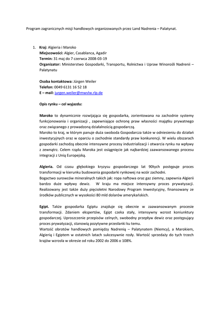 Program zagranicznych misji handlowych organizowanych przez Land Nadrenia – Palatynat. 1. Kraj: Algieria i Maroko Miejscowości: Algier, Casablanca, Agadir Termin: 31 maj do 7 czerwca 2008-03-19 Organizator: Ministerstwo Gospodarki, Transportu, Rolnictwa i Upraw Winorośli Nadrenii – Palatynatu Osoba kontaktowa: Jürgen Weiler Telefon: 0049 6131 16 52 18 E – mail: [email protected] Opis rynku – cel wyjazdu: Maroko to dynamicznie rozwijająca się gospodarka, zorientowana na zachodnie systemy funkcjonowania i organizacji , zapewniające ochronę praw własności majątku prywatnego oraz związanego z prowadzoną działalnością gospodarczą. Maroko to kraj, w którym panuje duża swoboda Gospodarcza także w odniesieniu do działao inwestycyjnych oraz w oparciu o zachodnie standardy praw konkurencji. W wielu obszarach gospodarki zachodzą obecnie intensywne procesy industrializacji i otwarcia rynku na wpływy z zewnątrz. Celem rządu Maroka jest osiągnięcie jak najbardziej zaawansowanego procesu integracji z Unią Europejską. Algieria. Od czasu głębokiego kryzysu gospodarczego lat 90tych postępuje proces transformacji w kierunku budowania gospodarki rynkowej na wzór zachodni. Bogactwo surowców mineralnych takich jak: ropa naftowa oraz gaz ziemny, zapewnia Algierii bardzo duże wpływy dewiz. W kraju ma miejsce intensywny proces prywatyzacji. Realizowany jest także duży pięcioletni Narodowy Program Inwestycyjny, finansowany ze środków publicznych w wysokości 80 mld dolarów amerykaoskich. Egipt. Także gospodarka Egiptu znajduje się obecnie w zaawansowanym procesie transformacji. Zdaniem ekspertów, Egipt czeka stały, intensywny wzrost koniunktury gospodarczej. Uproszczenie przepisów celnych, swobodny przepływ dewiz oraz postępujący proces prywatyzacji, stanowią pozytywne przesłanki ku temu. Wartośd obrotów handlowych pomiędzy Nadrenią – Palatynatem (Niemcy), a Marokiem, Algierią i Egiptem w ostatnich latach sukcesywnie rosły. Wartośd sprzedaży do tych trzech krajów wzrosła w okresie od roku 2002 do 2006 o 108%. 2. Kraj: Kazachstan Miejscowości: Astana, Almaty, Atyrau Termin: 31 sierpnia do 6 września 2008 Organizator: Centrum Europy Środkowo Wschodniej w Nadrenii – Palatynacie (MOEZ) Misja handlowa realizowane we współpracy z Landem Saarland (Kraj Sary) Osoba kontaktowa: Hans – Christian Arlt Telefon: 0049 6543 509 442 E – mail: [email protected] Rynek – cel wyjazdu: Czwarta już z rzędu organizowana przez MOEZ misja handlowa do Kazachstanu koncentrowad się będzie na wizycie w Ałmacie najważniejszym centrum gospodarczy kraju oraz do dwóch innych ważnych ośrodków gospodarczych jakimi są Astana (stolica kraju) oraz Atyrau. Żadne inne paostwo na kontynencie Euroazjatyckim nie rozwija się w tak dynamicznym tempie jak Kazachstan. Poprzednie misje handlowe przyniosły ich uczestnikom nadspodziewanie dobre efekty. Cały kraj jest zagłębiem niewykorzystanych potencjałów, które stwarzają wielkie możliwości biznesowe. 3. Kraj: Chioska Republika Ludowa Miejscowości: Xiamen, Guangzhou, Shanhai Termin: 6 – 14 wrzesieo 2008-03-19 Orgazniator: Ministerstwo Gospodarki, Transportu, Rolnictwa i Upraw Winorośli Nadrenii – Palatynatu Osoba kontaktowa: Julia Golomb Telefon: 0049 6131 162 262 E – mail: [email protected] Rynek – cel wyjazdu: Chioska Republika Ludowa to według oficjalnych danych statystycznych trzecia największa gospodarka świata za USA i Japonią. Chioskie PKB w ciągu ostatnich pięciu lat odnotowywało coroczny wzrost o 10%. Aktualnie nie należy spodziewad się zahamowania tempa wzrostu. Utrzymujące się wysokie tempo wzrostu gospodarczego „Paostwa Środka” powoduje stały wzrost obrotów handlowych z Nadrenią – Palatynatem. W roku 2006 wartośd tych obrotów handlowych wyniosła około 2 mld Euro, co w odniesieniu do roku 2005 oznacza przyrost o 16%. Chiny stanowią tym samym z dużą przewagą największego partnera handlowego dla Nadrenii – Palatynatu w Azji. Oprócz wizyty w Centrum Gospodarczym Chin – Szanghaju delegacja odwiedzi także położoną na północy Chin metropolię Guangzhou. Celem podróży będzie także wizyta w dynamicznie rozwijającym się, położonym na południu Chin regionie Rzeki Perłowej. Geograficzna bliskośd z Hong – Kongiem wpływa bezpośrednio na bardzo wysokie tempo wzrostu gospodarczego miasta i regionu, co stanowi bardzo optymistyczne przesłanki w stronę przyszłych, owocnych kontaktów handlowych. Nie tylko kontakty gospodarcze, lecz także bliskie związki partnerskie pomiędzy Chinami a Nadrenią – Palatynatem kształtują bardzo pozytywny obraz wzajemnych relacji. Misja handlowa wiedzie także do chioskiej Prowincji Fujian z którą Nadrenia – Palatynat zawarte ma od roku 1989 partnerstwo regionów. Tamtejszy port oraz specjalna strefa ekonomiczna Xiamen stwarzają idealne podłożę pod nawiązanie kooperacji gospodarczych i handlowych. Zaproszenie dotyczy uczestników reprezentujących wszystkie gałęzie gospodarki. 4. Kraj: Ukraina Miejscowości: Kijów, Donieck, Dniepropietrowsk Termin: 22 – 26 września 2008 Organizator: Centrum Europy Środkowo Wschodniej w Nadrenii – Palatynacie (MOEZ) Osoba kontaktowa: Franz – Josef Seiβ Telefon: 0049 6543 509 435 E – mail: f.seiβ@moez-rlp.de Rynek – cel wyjazdu Dynamiczny rozwój gospodarczy Ukrainy jest rzeczą nie podważalną, zaznacza się to także w rozwijających się kontaktach handlowych z Nadrenią – Palatynatem. Z 50 mln mieszkaoców Ukraina stanowi obok Rosji największy rynek w tym regionie Europy. Organizowane w ostatnich latach misje handlowe na Ukrainę przynosiły jej uczestnikom dobre efekty biznesowe, które należy dalej rozwijad. Celami podróży są poza stolicą kraju Kijowem, także pozostałe centa gospodarcze to jest Donieck i Dniepropietrowsk na południowym wschodzie kraju. 5. Kraj: Indie, Zjednoczone Emiraty Arabskie Miejscowości: New Delhi, Pune, Mumbai