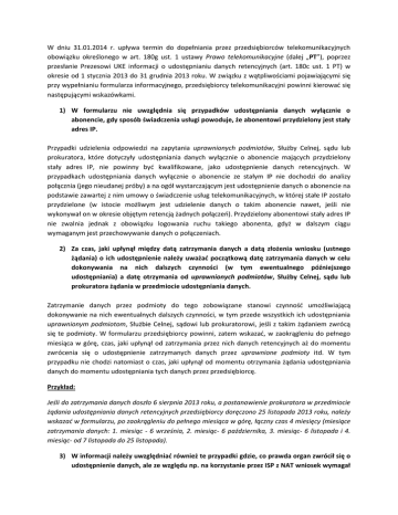 W dniu 31.01.2014 r. upływa termin do dopełniania przez przedsiębiorców telekomunikacyjnych obowiązku określonego w art. 180g ust. 1 ustawy Prawo telekomunikacyjne (dalej „PT”), poprzez przesłanie Prezesowi UKE informacji o udostępnianiu danych retencyjnych (art. 180c ust. 1 PT) w okresie od 1 stycznia 2013 do 31 grudnia 2013 roku. W związku z wątpliwościami pojawiającymi się przy wypełnianiu formularza informacyjnego, przedsiębiorcy telekomunikacyjni powinni kierować się następującymi wskazówkami. 1) W formularzu nie uwzględnia się przypadków udostępniania danych wyłącznie o abonencie, gdy sposób świadczenia usługi powoduje, że abonentowi przydzielony jest stały adres IP. Przypadki udzielenia odpowiedzi na zapytania uprawnionych podmiotów, Służby Celnej, sądu lub prokuratora, które dotyczyły udostępniania danych wyłącznie o abonencie mających przydzielony stały adres IP, nie powinny być kwalifikowane, jako udostępnienie danych retencyjnych. W przypadkach udostępniania danych wyłącznie o abonencie ze stałym IP nie dochodzi do analizy połącznia (jego nieudanej próby) a na ogół wystarczającym jest udostępnienie danych o abonencie na podstawie zawartej z nim umowy o świadczenie usług telekomunikacyjnych, w której stałe IP zostało przydzielone (w istocie możliwym jest udzielenie danych o takim abonencie nawet, jeśli nie wykonywał on w okresie objętym retencją żadnych połączeń). Przydzielony abonentowi stały adres IP nie zwalnia jednak z obowiązku logowania ruchu takiego abonenta, gdyż w dalszym ciągu wymaganym jest przechowywanie danych o połączeniach. 2) Za czas, jaki upłynął między datą zatrzymania danych a datą złożenia wniosku (ustnego żądania) o ich udostępnienie należy uważać początkową datę zatrzymania danych w celu dokonywania na nich dalszych czynności (w tym ewentualnego późniejszego udostępniania) a datę otrzymania od uprawnionych podmiotów, Służby Celnej, sądu lub prokuratora żądania w przedmiocie udostępniania danych. Zatrzymanie danych przez podmioty do tego zobowiązane stanowi czynność umożliwiającą dokonywanie na nich ewentualnych dalszych czynności, w tym przede wszystkich ich udostępniania uprawnionym podmiotom, Służbie Celnej, sądowi lub prokuratorowi, jeśli z takim żądaniem zwrócą się te podmioty. W formularzu przedsiębiorcy powinni, zatem wskazać, w zaokrągleniu do pełnego miesiąca w górę, czas, jaki upłynął od zatrzymania przez nich danych retencyjnych aż do momentu zwrócenia się o udostępnienie zatrzymanych danych przez uprawnione podmioty itd. W tym przypadku nie chodzi natomiast o czas, jaki upłynął od momentu otrzymania żądania udostępniania danych do momentu udostępniania tych danych przez przedsiębiorcę. Przykład: Jeśli do zatrzymania danych doszło 6 sierpnia 2013 roku, a postanowienie prokuratora w przedmiocie żądania udostępniania danych retencyjnych przedsiębiorcy doręczono 25 listopada 2013 roku, należy wskazać w formularzu, po zaokrągleniu do pełnego miesiąca w górę, łączny czas 4 miesięcy (miesiące zatrzymania danych: 1. miesiąc - 6 września, 2. miesiąc- 6 października, 3. miesiąc- 6 listopada i 4. miesiąc- od 7 listopada do 25 listopada). 3) W informacji należy uwzględniać również te przypadki gdzie, co prawda organ zwrócił się o udostępnienie danych, ale ze względu np. na korzystanie przez ISP z NAT wniosek wymagał podania większej ilości danych w celu ustalenia abonenta. Przedsiębiorca wystosował w tym przedmiocie odpowiedź zwrotną do organu, ale dalszych danych od organu, do dnia 31 grudnia 2013 r. już nie otrzymał. Takie przypadki należy uwzględniać w ostatniej z rubryk „Łączna liczba przypadków, w roku poprzednim, w których wniosek lub ustne żądanie nie mogły zostać zrealizowane”.