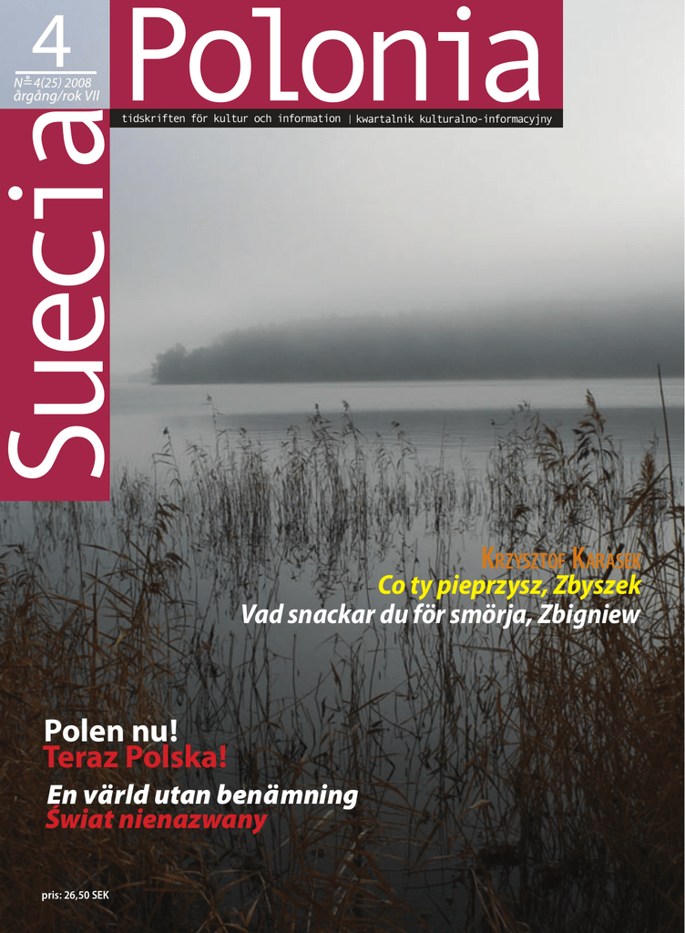 � Polonia Suecia tidskriften för kultur och information | kwartalnik kulturalno-informacyjny ,3;:4;50',"3"4&, $PUZQJFQS[ZT[;CZT[FL 7BETOBDLBSEVGÚSTNÚSKB;CJHOJFX 1PMFOOV 5FSB[1PMTLB &OWÅSMEVUBOCFOÅNOJOH ƯXJBUOJFOB[XBOZ QSJT4&, Polska – ciąg dalszy Polen – fortsättning 90 lat temu, po 123 latach formalnego nieistnienia, Polska powróciła do życia niespodziewanie, nagle i z impetem, który jednym zaimponował, drugich przestraszył, trzecich – zniesmaczył. Oczywiście, nie był to przypadek, bo państwa nie powstają, ani nie odradzają się przypadkiem, ale wydawał się cudem lub czymś z pokrewnej kategorii zdarzeń. Ziemie polskie podzielone były między trzy ościenne pańs twa: Cesarsko królewskie Austro-Węgry, Cesarstwo Niemieckie i Cesarstwo Rosyjskie. Były to, w przededniu pierwszej wojny światowej, niewzruszone opoki porządku europejskiego, gwaranci postanowień Kongresu Wiedeńskiego z 1815 roku (tego samego, który zatwierdził oderwanie od Szwecji Finlandii i dał ją Rosji) największe, obok mocarstw anglosaskich, potęgi, już nie europejskie, tylko światowe. I oto, pod koniec wojny wszystkie te trzy potęgi trafił szlag, zniknęły – jednocześnie i bezapelacyjnie. Austro-Węgry i Niemcy przegrały wojnę i poszły w rozsypkę. Rosja, teoretycznie w obozie zwycięzców, była sparaliżowana rozszerzającą się rewolucją październikową. Efter att formellt inte ha existerat under 123 år återuppstod Po len igen, oväntat och med en kraft så stor att den imponerade på en del, skrämde andra och fyllde somliga med avsky. Naturligtvis var det ingen tillfällighet, stater varken uppstår eller pånyttföds av en tillfällighet, men det hela liknade mest ett mirakel. Polen var delat mellan tre angränsande länder: dubbelmo narkin Österrike-Ungern, Preussen och Tsarryssland. Strax före första världskriget var dessa länder den europeiska ordning ens stöttepelare och skulle garantera föresatserna från Wien kongressen år 1815. Vid samma kongress fastställdes att Sverige skulle avträda Finland som gavs till Ryssland, den största stor makten vid sidan av de anglosachsiska, inte bara i Europa utan i hela världen. Och plötsligt, mot slutet av kriget, upphörde alla tre stormakter att existera, de försvann – samtidigt och oåter kalleligt. Österrike-Ungern och Preussen förlorade kriget och löstes upp. Ryssland som teoretiskt hörde till segrarmakterna var lamslaget av den växande oktoberrevolutionen. Wyglądało na to, że spełniły się modlitwy Polaków i ich poetów o cud i wojnę narodów. Tak modlił się Adam Mickiewicz: O wojnę powszechną za wolność ludów, Prosimy Cię, Panie. O niepodległość, całość i wolność Ojczyzny naszej, Prosimy Cię, Panie. (Księgi narodu i pielgrzymstwa polskiego. Litania pielgrzymska) Det verkade som att polackernas och deras poeters böner om mirakel och nationernas krig hade hörsammats. Så här lät Adam Mickiewicz bön: Om storkrig för folkens frihet Ber vi Dig, Herre Om självständighet, enhetlighet och frihet för vårt Fosterland Ber vi Dig, Herre (ur Polska folkets och det polska pilgrimskapets böcker. Pilgrimslitania) a tak, kilkadziesiąt lat później, Stanisław Wyspiański Błagamy Cię, Boże cudów, o wojnę, o wojnę ludów! (Legion) Tradycja proszenia o wojnę zachowała się w polskim narodzie dłużej, choć już w mniej artystycznej formie, mianowicie anonimowego utworu śpiewanego na ulicach. Po drugiej wojnie światowej, pod rządami sowieckimi, przesiedleńcy ze Lwowa śpiewali na melodię Ślimak, ślimak, wystaw rogi: „Truman, Truman puść ta bania, / bo jest nie do wytrzymania”. Polacy czekali jednak na wolność do 1989 roku, gdyż Truman bomby atomowej nie puścił, chyba słusznie, bo, jak to ujął Marek Hłasko, mogłaby ona rozwiązać zbyt wiele problemów na raz. ciąg dalszy str. 6 ☛ Och Stanisław Wyspiańskis, några år senare: Vi ber Dig, undrens Herre, Om krig, folkens krig! (Legionen) Traditionen att be om krig bevarades länge hos det polska folket, fast i mindre konstnärlig form, nämligen i anonyma visor som sjöngs på gatorna. Efter andra världskriget, under det sov jetiska styret, sjöng de som tvångsförflyttats från Lwów: ”Tru man, Truman, släpp den där bomben till slut, här står man bara inte ut”. Polackerna fick vänta på frihet ända till 1989, eftersom Truman inte släppte någon atombomb, och förmodli fortsättning sid.6 ☛ Foto: Jonas Jörneberg Polen och Gombrowicz tar över Turteatern under säsongen 2008-2009! Turteatern i samarbete med Polska institutet kommer att genomföra en Gombrowiczfestival, seminarier, samarbeten, gästspel, uppläsningar med mera. (ur Polska institutets nyhetsbrev) Premiären av Vigseln på Turteatern ägde rum den 18 oktober. Läs sid. 31 Polska i Gombrowicz przejmują Turteatern w sezonie 2008-2009! Turteatern we współpracy z Instytutem Pol skim organizuje festiwal gombrowiczowski, seminaria, występy gościnne, czytania i inne imprezy. (z ulotki elektronicznej Instytutu Polskiego) Premiera „Ślubu” odbyła się 18 października. Zob. str. 31 Suecia Polonia 4/2008 Innehåll / Spis treści 4 11 14 21 23 31 34 37 Vad snackar du för smörja, Zbigniew?�� –� Krzysztof Karasek om Zbigniew Herbert Co ty pieprzysz, Zbyszek��� – Krzysztof Karasek o Zbigniewie Herbercie Till minne av Zbigniew Herbert In memoriam Zbigniew Herbert | Krzysztof Karasek | Krzysztof Karasek En värld utan benämning | Adam Daniel Rotfeld Świat nienazwany | Adam Daniel Rotfeld Han lämnade skorna | Memento Park nära Budapest Zostawił buty | Memento Park pod Budapesztem Resa iväg med sin fiol. Henryk Kowalski – | Leo Kantor Wyjechać ze skrzypcami. Henryk Kowalski – | Leo Kantor Ett stycke sevärd teater | Tomas Håkansson Kawałek świetnego teatru | Tomas Håkansson Gombrowicz(?!) på Turteatern Gombrowicz(?!) w teatrze TUR | Janina Ludawska | Janina Ludawska } Vigseln på Turt