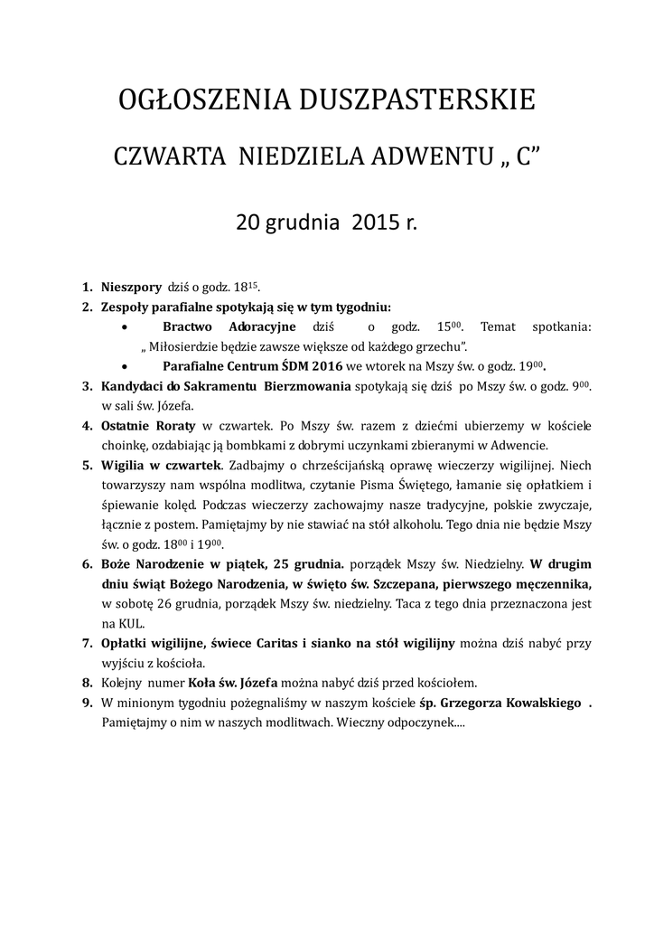 OGŁOSZENIA DUSZPASTERSKIE CZWARTA NIEDZIELA ADWENTU „ C” 20 grudnia 2015 r. 1. Nieszpory dziś o godz. 1815. 2. Zespoły parafialne spotykają się w tym tygodniu: • Bractwo Adoracyjne dziś o godz. • 1500. Temat spotkania: „ Miłosierdzie będzie zawsze większe od każdego grzechu”. Parafialne Centrum ŚDM 2016 we wtorek na Mszy św. o godz. 1900. 3. Kandydaci do Sakramentu Bierzmowania spotykają się dziś po Mszy św. o godz. 900. w sali św. Józefa. 4. Ostatnie Roraty w czwartek. Po Mszy św. razem z dziećmi ubierzemy w kościele choinkę, ozdabiając ją bombkami z dobrymi uczynkami zbieranymi w Adwencie. 5. Wigilia w czwartek. Zadbajmy o chrześcijańską oprawę wieczerzy wigilijnej. Niech towarzyszy nam wspólna modlitwa, czytanie Pisma Świętego, łamanie się opłatkiem i śpiewanie kolęd. Podczas wieczerzy zachowajmy nasze tradycyjne, polskie zwyczaje, łącznie z postem. Pamiętajmy by nie stawiać na stół alkoholu. Tego dnia nie będzie Mszy św. o godz. 1800 i 1900. 6. Boże Narodzenie w piątek, 25 grudnia. porządek Mszy św. Niedzielny. W drugim dniu świąt Bożego Narodzenia, w święto św. Szczepana, pierwszego męczennika, w sobotę 26 grudnia, porządek Mszy św. niedzielny. Taca z tego dnia przeznaczona jest na KUL. 7. Opłatki wigilijne, świece Caritas i sianko na stół wigilijny można dziś nabyć przy wyjściu z kościoła. 8. Kolejny numer Koła św. Józefa można nabyć dziś przed kościołem. 9. W minionym tygodniu pożegnaliśmy w naszym kościele śp. Grzegorza Kowalskiego . Pamiętajmy o nim w naszych modlitwach. Wieczny odpoczynek....