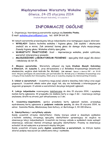 Międzynarodowe Warsztaty Wokalne Gliwice, 24-25 stycznia 2014 Studium Muzyki Kościelnej, Ul. Łużycka 1 INFORMACJE OGÓLNE 1. Organizacją i koordynacją warsztatów zajmuje się Dominika Płonka. E-mail: [email protected], tel.: 604 54 64 39. W ramach warsztatów przewidujemy lekcje indywidualne oraz następujące zajęcia zbiorowe: WYKŁADY: Dobra technika wokalna i higiena głosu; Jak szybko i skutecznie znaleźć sie w mixie; Jak zmieniać barwę głosu do danego stylu muzycznego; Zasady higieny głosu; Wokalne efekty specjalne. WARSZTATY PRAKTYCZNE: Scat - improwizacja wokalna, pieśni cykliczne, warsztat interpretacji piosenki. MŁODZIEŻOWE LABORATORIUM PIOSENKI - specjalny blok zajęć dla dzieci i młodzieży do lat 15. 2. Miejsce warsztatów. Warsztaty odbywać się będą Studium Muzyki Kościelnej w Gliwicach, Ul. Łużycka 1, przy skrzyżowaniu z ul. Bolesława Krzywoustego (miasteczko akademickie, wejście obok kościoła Św. Michała). Jak dotrzeć: Spacer z dworca PKP – ok. 15-20 minut. Miejsce parkingowe dla samochodów jest pod kościołem Św. Michała przy ul. Bolesława Krzywoustego oraz z drugiej strony budynku Kurii Diecezjalnej. Obok, przy ul. Łużyckiej znajduje się również parking strzeżony. 3. Udział w warsztatach – Uczestnicy mogą wziąć udział w dowolnej ilości lekcji oraz zajęć grupowych. Uczestnik układa sobie plan zajęć tak, aby nie kolidowały z interesującymi go zajęciami grupowymi. O udziale w warsztatach decyduje kolejność zgłoszeń. 4. Lekcje indywidualne rezerwujemy telefonicznie do dnia 15 stycznia 2014, i wysyłamy mailem kartę zgłoszenia. W przypadku nie dosłania karty w ciągu 2 dni - rezerwacja zostaje anulowana. Grafik na stronie jest aktualizowany co 2 dni. 5. Uczestnicy niepełnoletni, oprócz przesłania karty zgłoszeń mailem, przesyłają wydrukowaną kartę zgłoszenia z podpisem rodziców pocztą, do dnia 15 stycznia 2014, na adres: Dominika Płonka, Młodzieżowy Dom Kultury, ul. Barlickiego 3, 44-100 Gliwice. 6. Identyfikatory i certyfikaty udziału Każdy uczestnik otrzyma identyfikator. Osoby biorące udział w dowolnym wykładzie z techniki wokalnej otrzymają specjalny identyfikator uprawniający do wejścia na obserwacje lekcji indywidualnych. Uczestnik nie biorący udziału w wykładach może wykupić obserwacje, wówczas również otrzymuje specjalny identyfikator. Prosimy na obserwacje wchodzić do sal wyłącznie w przerwach między lekcjami. Każdy uczestnik otrzyma pusty dyplom uczestnictwa w warsztatach, na którym będzie zbierać podpisy nauczycieli po zakończeniu lekcji i wykładów. Międzynarodowe Warsztaty Wokalne w Gliwicach, 24-25 stycznia 2014 2 7. Przygotowanie do warsztatów o Aby w pełni skorzystać z zajęć wokalnych, proponujemy przygotować: urządzenie do nagrania lekcji indywidualnych, nuty z tekstem, ewentualnie teksty z akordami, nagranie oryginału wykonywanej piosenki na CD audio oraz akompaniament na CD audio (nie mp3!). o W czasie lekcji śpiewu nauczyciel udostępnia uczestnikom odtwarzacz CD audio. o Zalecamy nagrywanie swoich lekcji indywidualnych. o Nagrywanie wykładów jest zabronione, dozwolone jest robienie notatek. o Osoby zapisane na warsztat interpretacji piosenki prosimy o wcześniejszy kontakt z pianistą w celu przesłania nut wybranego na warsztaty utworu. Próba z akompaniatorem odbędzie się w czwartek 23 stycznia 2014 w godzinach 16:00-21:00 w Gliwicach. Szczegółowe informacje u organizatora. 8. Koszt udziału w warsztatach Ceny oraz czas trwania poszczególnych zajęć podane są w karcie zgłoszenia. 9. Warunki finansowe i terminy płatności: – Uczestnicy pokrywają koszt wybranych zajęć, wpłacając wyliczoną w karcie zgłoszenia kwotę na podany tam numer konta. Termin wpłat upływa 20 stycznia. Osoby, których wpłaty nie zostaną zaksięgowane na koncie w dniu 21 stycznia zostaną skreślone z listy uczestników warsztatów. Od dnia 20 stycznia 2014 anulowanie zarezerwowanych zajęć nie będzie możliwe. Po dniu 20 stycznia 2014 nie ma możliwości zwrotu kwot wpłaconych na warsztaty (zalecamy odstąpienie zajęć innej osobie i powiadomienie organizatorów). 10. Wyżywienie i noclegi: – we własnym zakresie. Polecamy zaopatrzyć się w wodę mineralną. W Studium znajduje się automat do kawy. Naprzeciw Studium znajduje się stołówka studencka i bar, a niedaleko - pizzeria. Najtańsze noclegi w Gliwicach oferują: 1) Schronisko Młodzieżowym „Ślązaczek” w Gliwicach, ul. Krakusa 16. http://ww.zsti.gliwice.pl/ptsm/index.html Jak dotrzeć: autobusem z Placu Krakowskiego, z przystanku: Gliwice Wrocławska (to najbliższy przystanek z ul. Łużyckiej) , 2 przystanki autobusem 59, 60, 194, 840, lub 3 przystanki autobusem 156, 617. Dojechać do przystanku: Gliwice Dąbrowskiego (za wiaduktem kolejowym). 2) Hotel – Centrum Noclegowe „Masz” w Łabędach, ul. Narutowicza 23. http://www.centrumnoclegowemasz.pl/ Jak dotrzeć: autobusem z Placu Krakowskiego 20 min. autobusem (nr 32, 126). Dojechać do przystanku: Łabędy Dworzec PKP 1 (koło sklepu Biedronka). Opracowanie: Dominika Płonka www.wokalne-gliwice.pl Partnerzy: Patronat: Prezydent Miasta Gliwice Patronat medialny: