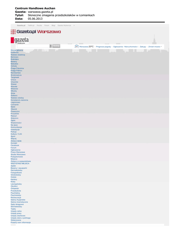Centrum Handlowe Auchan Gazeta: warszawa.gazeta.pl Tytu³: S³oneczne zmagania przedszkolaków w £omiankach Data: 05.06.2013 Gazeta.pl Tokfm.pl Poczta Forum Blogi Gazeta Wyborcza Szukaj Strona główna Dzielnice Wybierz dzielnicę Bemowo Białołęka Bielany Mokotów Ochota Praga Południe Praga Północ Rembertów Śródmieście Targówek Ursus Ursynów Wawer Wesoła Wilanów Włochy Wola Żoliborz Wybierz okolicę Konstancin-Jeziorna Legionowo Łomianki Marki Otwock Piaseczno Pruszków Raszyn Wołomin Ząbki Wiadomości Na żywo Komunikacja Inwestycje Policja Kultura / CJG Sport Więcej Zobacz także Kontakt Facebook Forum Ogłoszenia Praca Warszawa Studia Warszawa Podyplomowe Miejsca Zobacz w województwie WSZYSTKIE MIEJSCA Apteki Baseny i aquaparki Dermatolodzy Fotografowie Ginekolodzy Hotele Kantory Kluby Laryngolodzy Okuliści Ortopedzi Przedszkola Psychiatrzy Psycholodzy Restauracje Salony fryzjerskie Salony kosmetyczne Sądy okręgowe Stomatolodzy Teatry Urzędy celne Urzędy pracy Urzędy skarbowe Urzędy stanu cywilnego Weterynarze Prześlij nam informacje Warszawa 20ºC Prognoza pogody Ogłoszenia - Nieruchomości Zakupy Zmień miasto Centrum Handlowe Auchan Gazeta: warszawa.gazeta.pl Tytu³: S³oneczne zmagania przedszkolaków w £omiankach Data: 05.06.2013 Gazeta.pl Warszawa Zakupy Słoneczne zmagania przedszkolaków w Łomiankach Anna Czuba 05.06.2013 , aktualizacja: 05.06.2013 11:08 A AA Najczę ściej czytane 1. Louis Vuitton otwiera sklep w Warszawie. Torebki po 15 tys. zł 2. Dwie sieci luksusowych delikatesów w Miasteczku Wilanów 3. "Puścimy Cię z torbami". Fałszywe reklamy Louisa Vuittona 4. Galeria Mokotów poszerza swoją ofertę obuwniczą 5. TK Maxx wkrótce w Parku Handlowym Targówek Ogłoszenia Praca Sprzedaż: sprawdź oferty Rozwijaj karierę w IT Praca w finansach STUDIA I SZKOLENIA Liga Przedszkolaka (mat. prasowe) Studia uznane na świecie Pensja 13 300 zł. po... Biznes w PAN Nieruchomości Zobacz zdjęcia (2) W najbliższy czwartek aż 300 maluchów weźmie udział w kolejnej edycji Ligi Przedszkolaka Liga Przedszkolaka to cykliczne wydarzenie sportowe odbywające się od 2011 r. Organizowane jest przez Integracyjne Centrum Dydaktyczno-Sportowe w Łomiankach oraz CH Auchan. Każda edycja Ligi ma inny charakter i motyw przewodni. Poprzednie, marcowe spotkanie odbyło się pod hasłem "Przedszkole Eko", a dzieci zmierzyły się z zadaniami o tematyce ekologicznej. Tym razem zabawa przebiegać będzie w wakacyjnej atmosferze, a zaplanowane konkurencje będą niezwykle słoneczne. Bieg po uśmiech, plażowa sztafeta czy droga na wczasy - to tylko niektóre z zadań, z jakimi 6 czerwca będą się zmagać maluchy z 9 przedszkoli, m.in. z Łomianek, Dąbrowy, Burakowa, Kaliszek i Warszawy. W hali sportowej maluchy będą miały do pokonania slalom, podczas którego będą musiały zebrać jak najwięcej uśmiechniętych buziek, a także zmierzą się z bramką, do której celnie należy trafić piłką. Jednym z zadań będzie również skompletowanie plażowego ekwipunku w jak najkrótszym czasie. Pod okiem policjanta dzieci wcielą się w różne pojazdy poruszające się po wyznaczonych trasach. Na każdego uczestnika czekają drobne upominki. Więcej informacji na: CH Auchan Łomianki oraz Integracyjne Centrum Dydaktyczno-Sportowe w Łomiankach Zakupy w Warszawie - najnowsze artykuły Słoneczne zmagania przedszkolaków w Łomiankach MaMa w Kinie Praha Galeria Mokotów poszerza swoją ofertę obuwniczą TK Maxx wkrótce w Parku Handlowym Targówek Warsztaty ogólnorozwojowe dla dzieci w King Cross Praga Wyślij e-mailem Targówek, 195 m2 Śródmieście, 110 m2 Ochota, 27 m2 Motoryzacja Volkswagen Passat 2009 Auto Łukasza Piszczka Ford Focus 1.8 2008 r Centrum Handlowe Auchan Gazeta: warszawa.gazeta.pl Tytu³: S³oneczne zmagania przedszkolaków w £omiankach Data: 05.06.2013 Dodaj komentarz Na skróty: Gazeta.pl Wiadomości Sport.pl Biznes Gazeta Wyborcza Praca Program TV Polecamy: Miasta Wpadki Policja Program TV Pogoda Tematy Wideo Wyniki Lotto Newsletter Facebook RSS Poczta Copyright (c) Agora SA O nas Staże u nas Reklama Prywatność Wszystkie artykuły Licencje Poleć stronę Zgłoś błąd