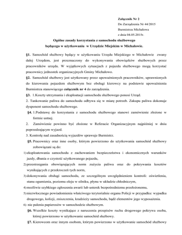 Załącznik Nr 2 Do Zarządzenia Nr 44/2015 Burmistrza Michałowa z dnia 04.05.2015r. Ogólne zasady korzystania z samochodu służbowego będącego w użytkowaniu w Urzędzie Miejskim w Michałowie. §1. Samochód służbowy będący w użytkowaniu Urzędu Miejskiego w Michałowie zwany dalej Urzędem, jest przeznaczony do wykonywania obowiązków służbowych przez pracowników urzędu. W wyjątkowych sytuacjach z pojazdu służbowego mogą korzystać pracownicy jednostek organizacyjnych Gminy Michałowo. §2. Samochód służbowy jest użytkowany przez upoważnionych pracowników, uprawnionych do kierowania pojazdem służbowym bez obsługi kierowcy na podstawie upoważnienia Burmistrza stanowiącego załącznik nr 4 do zarządzenia. §3. 1.Koszty utrzymania i eksploatacji samochodu służbowego ponosi Urząd. 2. Tankowanie paliwa do samochodu odbywa się w miarę potrzeb. Zakupu paliwa dokonuje dysponent samochodu służbowego. §4. 1.Podstawę do korzystania z samochodu służbowego stanowi zamówienie złożone w formie ustnej. 2. Zamówienie powinno być złożone w Referacie Organizacyjnym najpóźniej w dniu poprzedzającym wyjazd. 3. Kontrolę nad zasadnością wyjazdów sprawuje Burmistrz. §5. Pracownicy oraz inne osoby, którym powierzono do użytkowania samochód służbowy zobowiązani są do: 1) eksploatowania samochodu z zachowaniem bezpieczeństwa i ekonomicznych warunków jazdy, dbania o czystość użytkowanego pojazdu, 2) przestrzegania obowiązujących norm zużycia paliwa oraz do pokrywania kosztów wynikających z przekroczeń tych norm, 3) dokonywania obsługi samochodu, ze szczególnym uwzględnieniem kontroli: oświetlenia, stanu ogumienia, poziomu oleju w silniku, płynu w układzie chłodniczym, 4) możliwie szybkiego zgłoszenia awarii lub usterek bezpośredniemu przełożonemu, 5) niezwłocznego powiadomienia właściwego terytorialnie organu Policji w przypadku: wypadku drogowego, kolizji, zniszczenia, kradzieży samochodu, bądź elementów jego wyposażenia. 6) nie palenia papierosów w samochodzie służbowym. §6. Wszelkie koszty wynikające z naruszenia przepisów ruchu drogowego pokrywa osoba, której powierzono w użytkowanie samochód służbowy. §7. Kierowcom oraz innym osobom, którym powierzono w użytkowanie samochód służbowy zabrania się ich udostępniania osobom trzecim. §8. Po zakończeniu użytkowania samochodu w celach służbowych pracownik zobowiązany jest do zaparkowania i zabezpieczenia samochodu na parkingu Urzędu lub w wyznaczonym miejscu. §9. Korzystanie z samochodu służbowego w święta, dni wolne od pracy lub po godzinach pracy, może się odbywać w przypadkach wykonywania obowiązków służbowych wynikających z zakresu kompetencji. §10. W przypadku wczesnych wyjazdów i późnych powrotów, samochód służbowy może być garażowany w miejscu zamieszkania pracownika po uzyskaniu zgody Burmistrza. Użytkownik pojazdu służbowego zobowiązany jest do nadzoru garażowanego pojazdu i ponosi odpowiedzialność za powstałe szkody podczas nadzoru. §11. Pracownik korzystający z samochodu służbowego wypełniają kartę drogową, potwierdzając w ten sposób wykonanie podroży. Pracownik składając podpis obowiązany jest skontrolować rzetelność zapisów w karcie drogowej. §12. Ewidencjonowanie wykorzystania samochodu służbowego dokonywane jest wg poniższych zasad: 1) prowadzone jest przez pracownika na ponumerowanych kartach drogowych, 2) w kartach drogowych wpisuje się daty oraz godziny pracy, liczbę przejechanych kilometrów, daty i ilości kupowanego paliwa, liczbę przejechanych kilometrów w ciągu dnia z podaniem trasy przejazdu, 3) godziny użytkowania samochodu i trasę przejazdu każdorazowo potwierdza pracownik, 4) formularze kart drogowych wydawane są przez wyznaczonego pracownika referatu Księgowości Budżetowej, 5) pracownik, o którym mowa w pkt 4) w okresach miesięcznych dokonuje rozliczenia przebiegu samochodów, zużycia paliwa oraz sprawdza prawidłowość dokonanych w nich zapisów, 6) pracownik odnotowuje fakt wyjazdu w książce wyjazdów samochodem służbowym, 7) pracownik pobiera również druk polecenia wyjazdu służbowego (delegację) jeśli wyjazd służbowy jest dokonywany poza miejscem siedziby pracodawcy.
