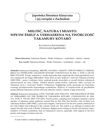Japońska literatura klasyczna i jej związki z Zachodem MIŁOŚĆ, NATURA I MIASTO. WPŁYW ÉMILE’A VERHAERENA NA TWÓRCZOŚĆ TAKAMURY KŌTARŌ KATARZYNA SONNENBERG1 (Uniwersytet Jagielloński) Słowa kluczowe: Takamura Kōtarō – Émile Verhaeren – symbolizm – natura – miasto Key words: Takamura Kōtarō – Émile Verhaeren – symbolism – nature – city Abstrakt: Katarzyna Sonneberg. MIŁOŚĆ, NATURA I MIASTO. WPŁYW ÉMILE’A VERHAERENA NA TWÓRCZOŚĆ TAKAMURY KŌTARŌ. PORÓWNANIA 18, 2016. T. XVIII. S. 135-154. ISSN 1733-165X. Poezja, malarstwo i rzeźba francuska były inspiracją dla wielu japońskich twórców należących do kręgu Miłośników Pana (Pan no kai). Jednym z nich był Takamura Kōtarō (1883-1956) – poeta i rzeźbiarz, który zasłynął przede wszystkim ze swoich liryków miłosnych adresowanych do żony Chieko. Artykuł stanowi próbę analizy wpływów, jakie wywarły na Takamurę życie i twórczość Émile’a Verhaerena, belgijskiego poety piszącego po francusku, ważnego przedstawiciela francuskiego symbolizmu. Wpływy te rozpatrywane na przykładzie poezji miłosnej Takamury (Chieko shō) oraz obrazów natury i miasta w jego twórczości. Abstract: Katarzyna Sonneberg. LOVE, NATURE AND THE CITY. THE INFLUENCE OF ÉMILE VERHAEREN ON THE WORKS OF TAKAMURA KŌTARŌ. COMPARISONS 18, 2016. Vol. XVIII. P. 135-154. ISSN 1733-165X. French poetry, painting and sculpture inspired a great number of Japanese artists gathered around Pan no Kai (The Pan Society). One of them was Takamura Kōtarō (1883-1956), a poet and sculptor, well known for his love poems addressed to his wife Chieko and collected in the volume Chieko shō. The article is an attempt to analyse the impact the life and work of Émile Verhaeren, Belgian poet writing in French and famous representative of French symbolism, had on Takamura’s oeuvre, especially with regards to his love poetry and images of nature and city. ________________ 1 E-mail Address: [email protected] 135 PORÓWNANIA 18, 2016 Poszukiwanie natchnienia w utworach pisarzy francuskich stało się częstsze w Japonii na przełomie wieków XIX i XX za sprawą Uedy Bina (1874-1916) – poety, tłumacza i krytyka literatury. Opublikowany przez niego w 1905 roku tom Kaichōon (Odgłos pływów morza) zawierał wiele przekładów wierszy francuskich i belgijskich twórców, zwłaszcza tych, którzy związani byli z symbolizmem. Tłumaczenia Uedy znalazły szczególne uznanie w kręgu Miłośników Pana (Pan no kai), stowarzyszeniu japońskich artystów – piewców wolności i obyczajowej swobody, sprzeciwiających się postulatom naturalizmu i promujących idee „sztuki dla sztuki”, które są czasem utożsamiane ze „szkołą estetyczną” (tambiha). Jeden ze współtwórców Pan no kai – poeta i dramatopisarz Kinoshita Mokutarō (1885-1945) – przyznał, że pod wpływem tych tłumaczeń wielu młodych twórców japońskich marzyło o życiu w stylu paryskich artystów, będących dla nich niedościgłym wzorem swobody.2 Należący do Miłośników Pana poeta Takamura Kōtarō (1883-1956) postanowił zrobić wszystko, by te będące także jego udziałem marzenia mogły się ziścić. Szczególne miejsce w wydanym przez Uedę Bina tomie zajmował Émile Verhaeren (1855-1916), który mimo że był Belgiem, pisał po francusku i stał się ważną postacią panteonu pisarzy francuskich, chociaż – co zauważył nie bez odcienia humoru Stefan Zweig – żaden Francuz nie zdołałby wymówić poprawnie jego nazwiska (Zweig 15). Zdaniem Ezry Pounda, „uznawany był [on] na równi z najwybitniejszymi poetami narodowości francuskiej” (Pound 259). Jego wyjątkową pozycję łączono nierzadko z dostrzegalną u niego mieszanką różnych cech narodowych. „Od Francuzów ma język i jego formę, od Niemców instynktowne poszukiwanie Boga, szczerość i powagę, potrzebę metafizyki i tendencje do panteizmu” – stwierdził S. Zweig w swej słynnej biografii poświęconej belgijskiemu poecie, która w przekładzie angielskim oczarowała młodego Takamurę Kōtarō (Zweig 24). Celem tej pracy jest prześledzenie wpływów, jakie osoba i twórczość Verhaerena wywarły na dzieło Takamury, który w przeciwieństwie do wielu jemu współczesnych japońskich poetów miał możliwość poznać pisane po francusku wiersze w oryginale. Owocem jego fascynacji belgijskim twórcą są nie tylko tłumaczenia jego wierszy, zwłaszcza poezji miłosnej, na język japoński, ale również inspirowane ich prozodią i tematyką własne utwory traktujące o miłości do żony, naturze i mieście jako symbolu nowoczesności. Spotkanie z belgijskim poetą Takamura Kōtarō w 1906 roku wyruszył w podróż, która była dla niego przede wszystkim okazją do doskonalenia umiejętności i technik rzeźbiarskich pod ________________ 2 Zob.: J. Angles. “The Heritage of Symbolism: The Aesthetic Style of Kitahara Hakushū and Murayama Kaita”. Proceedings of the Association for Japanese Literary Studies 4. Japanese Poeticity and Narrativity Revisited (2003). S. 238-239. 136 Katarzyna Sonnenberg, Miłość, natura i miasto. Wpływ Émile’a Verhaerena na twórczość Takamury Kōtarō okiem mistrzów najpierw w Nowym Jorku, a później w Londynie i Paryżu. Takamura fascynował się w tym czasie rzeźbą zachodnią, którą studiował wcześniej w Tokijskiej Szkole Sztuk Pięknych (Tōkyō Bijutsu Gakkō), gdzie wykładowcą był jego ojciec, Takamura Kōun (1852-1934), ceniony wówczas w Japonii rzeźbiarz3. Obserwacje z Nowego Jorku, Londynu i Paryża stały się dla młodego artysty dodatkowo inspiracją do tworzenia poezji w nowej formie. Takamura napisał wówczas pierwszy wiersz w stylu nowoczesnym (kindaishi) opublikowany w „Myōjō” (Gwiazda Poranna), wydawanym od 1900 roku czasopiśmie poświęconym sztuce, które promowało nowe prądy w poezji4. Szczególne znaczenie miał dla Takamury trwający od czerwca 1908 do m
