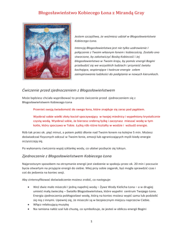 Błogosławieństwo Kobiecego Łona z Mirandą Gray Jestem szczęśliwa, że weźmiesz udział w Błogosławieństwie Kobiecego Łona. Intencją Błogosławieństwa jest nie tylko uzdrowienie I połączenie z Twoim własnym łonem i kobiecością. Zostało ono stworzone, by zakotwiczyć Boską Kobiecość i Jej błogosławieństwo w Twoim kraju, by pomóc energii Bogini przebudzić się we wszystkich ludziach i przynieść światu kochające, wspierające i twórcze energie celem zainspirowania ludzkości do podążania w nowych kierunkach. Ćwiczenie przed zjednoczeniem z Błogosławieństwem Może będziesz chciała wypróbować to proste ćwiczenie przed zjednoczeniem się z Błogosławieństwem Kobiecego Łona Przenieś swoją świadomość do swego łona, które znajduje się zaraz pod pępkiem. Wyobraź sobie wielki złoty kocioł spoczywający w twojej miednicy i wypełniony krystalicznie czystą wodą. Wyobraź sobie, że bierzesz srebrną łyżkę i zaczynasz mieszać wodę w tym kotle, który spoczywa w Tobie. Łyżką rób różne kształty w wodzie i wzbudź energie. Rób tak przez ok. pięć minut, a potem połóż dłonie nad Twoim łonem na kolejne 5 min. Możesz doświadczać fizycznych odczuć w Twoim łonie, emocji lub ograniczających myśli kiedy energie oczyszczają się. Po wykonaniu ćwiczenia wypij szklankę wody, co ułatwi pozbycie się toksyn. Zjednoczenie z Błogosławieństwem Kobiecego Łona Najprostszym sposobem na otrzymanie energii jest siedzenie w spokoju przez ok. 20 min i poczucie bycia otwartym na przyjęcie energii do siebie. Miej przy sobie zegarek, byś mogła sprawdzić czas i coś do jedzenia na koniec sesji. Aby zintensyfikować doświadczenie możesz zrobić, co następuje: Weź dwie małe miseczki I jedną napełnij wodą – Żywe Wody Kielicha Łona – a w drugiej umieść małą świeczkę – Światło Błogosławieństwa, które wypełni centrum Twojego Łona. Energia zjednoczenia pobłogosławi wodę, którą na koniec możesz wypić sama lub podzielić się nią z innymi. Upewnij się, że miseczki są w bezpiecznym miejscu naprzeciw Ciebie. Włącz relaksującą muzykę Na ramiona nałóż szal lub chustę, co symbolizuje, że jesteś w obliczu energii Bogini 1 Błogosławieństwo Kobiecego Łona z Mirandą Gray W czasie medytacji czytaj poniższy tekst i wyobrażaj sobie, że dzieje się to, o czym czytasz. Jeśli jesteście w grupie, jedna z Was może czytać na głos dla wszystkich. W czasie Zjednoczenia z Błogosławieństwem czytaj tekst medytacji i siedź wygodnie z prostymi plecami i otwartymi dłońmi na udach. Zrelaksuj się i po prostu przyjmuj. Po zjednoczeniu: Możesz albo kontynuować dalej przechodząc do poniższej medytacji “Dzielenie się Błogosławieństwem”, albo zakończyć sesję. Zakończenie sesji: Na koniec wypij “Żywe wody” ze swojej miseczki I zjedz coś. Pij dużo w ciągu tego dnia, aby wspomóc ewentualną detoksykację. Medytacja Zjednoczenia z Błogosławieństwem Kobiecego Łona Zacznij czytać tę medytację o godzinie, którą wybrałas. Zamknij oczy i przenieś świadomość do swego ciała. Czuj swój ciężar na poduszce, ciężar swoich ramion na udach. Weź głęboki oddech i czuj się scentrowana w nim. Przenieś świadomość do swego łona; zobacz, wiedz, czuj lub wyobraź sobie, że Twoje łono jest jak drzewo z dwoma głównymi odgałęzieniami, które pokryte są pięknymi liśćmi, a na ich końcach są czerwone jak klejnoty owoce. Poczuj lub wyobraź sobie, że korzenie drzewa wrastają głęboko w ciemność ziemi, łącząc Cię i zakotwiczając Cię, pozwalając Ci przyjąć złotą energię do Twego łona. Czuj się ugruntowana I zbalansowana. A teraz pozwól, by obraz Drzewa Twojego Łona urósł do momentu, aż dwa główne rozgałęzienia dojdą do poziomu serca. Jak połączysz się już z tym obrazem, zobacz lub poczuj jak centrum Twojego serca otwiera się i jak energia przepływa w dół przez ramiona, i wpływa do dłoni i palców u rąk. Czuj połączenie miłości między ziemią, Twoim łonem i Twoim sercem. Będąc cały czas w świadomości swego serca, spójrz w górę i zobacz lub poczuj, że rozgałęzienia Drzewa rosną w górę i sięgają do Księżyca w Pełni ponad Twoją głową. Piękno Księżyca w Pełni kąpie Cię w czystym srebrno-białym świetle, które spływa przez Twoja aurę na Twoją skórę. 2 Błogosławieństwo Kobiecego Łona z Mirandą Gray Otwórz się na przyjęcie światła Księżyca. Pozwól, by wpłynęło ono przez czakrę korony i wypełniło Twój mózg światłem. Zrelaksuj się jeszcze bardziej i przyjmij światło do swego serca. Wejdź jeszcze głębiej w relaks i otwórz swe łono i pozwól, by światło wpłynęło i pobłogosławiło Twe łono. Możesz odczuwać ciepło, mrowienie lub napięcie w twoim łonie, a nawet przebudzenie energii seksualnej. Teraz ciesz się energiami przez 20 minut. Medytacja “Dzielenie się Błogosławieństwem” Może będziesz chciała wkonać tę opcjonalną medytację bezpośrednio po 20-minutowym zjednoczeniu się z Błogosławieństwem Kobiecego Łona – to zajmie ok. 15 minut. Jeszcze raz bądź świadoma Księżyca ponad Twoją głową I pozwól, by jego energia kąpała Cię w świetle. Czuj, jak światło wypełnia Twoją głowę i Twoje serce i spływa do ramion i dłoni. Pozwól energii przepływać z serca I dłoni do Świata. Czuj, jak płynie ona do innych krajów zmieniając wibracje na Boską Kobiecość. Czuj, jak energia uzdrawia, kocha, koi i pielęgnuje cały świat. Czuj obecność wszystkich kobiet z całego świata, które łączą się z tą energią w tym samym czasie. Wyślij ją do nich i przyjmij ją od nich w Miłości, Wspólnocie i Komunii. (długa przerwa) Teraz pozwól, by energia z Księżyca ponad Tobą przepłynęła z głowy do serca, dalej do łona I w dół do Twojego kraju. Pozwól energii się przebudzić i uzdrowić świętość twego kraju i jeg