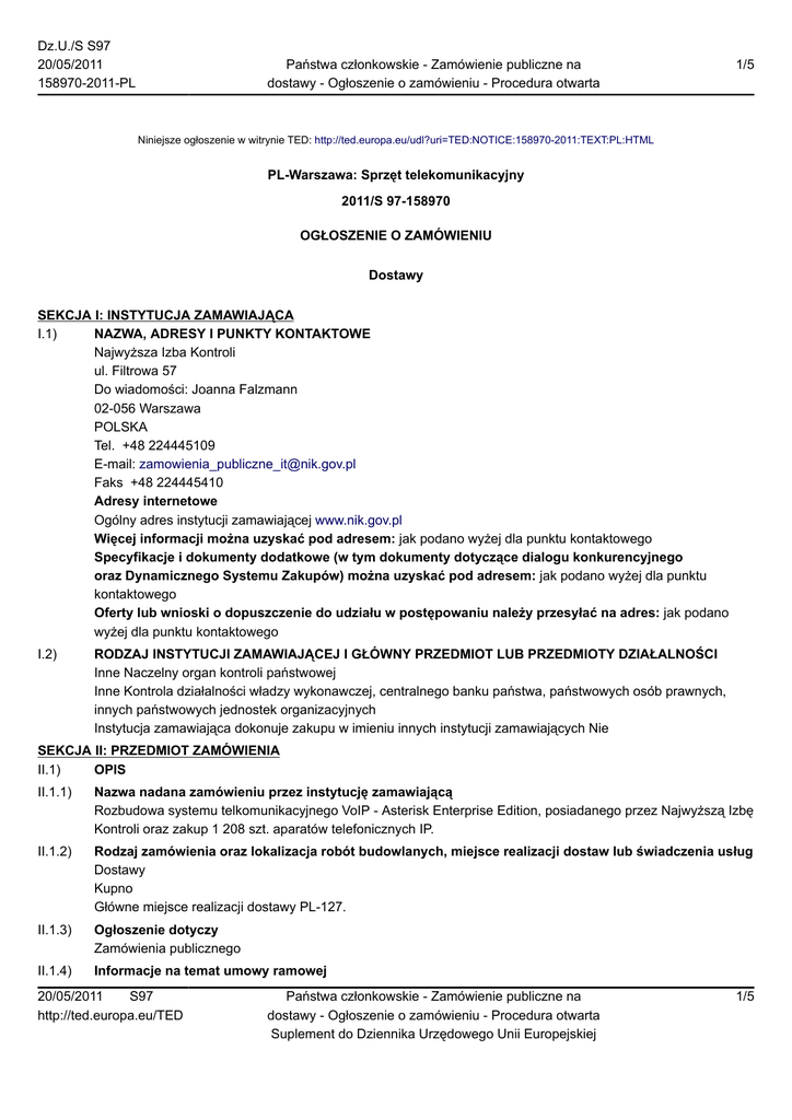 Dz.U./S S97 20/05/2011 158970-2011-PL Państwa członkowskie - Zamówienie publiczne na dostawy - Ogłoszenie o zamówieniu - Procedura otwarta 1/5 Niniejsze ogłoszenie w witrynie TED: http://ted.europa.eu/udl?uri=TED:NOTICE:158970-2011:TEXT:PL:HTML PL-Warszawa: Sprzęt telekomunikacyjny 2011/S 97-158970 OGŁOSZENIE O ZAMÓWIENIU Dostawy SEKCJA I: INSTYTUCJA ZAMAWIAJĄCA I.1) NAZWA, ADRESY I PUNKTY KONTAKTOWE Najwyższa Izba Kontroli ul. Filtrowa 57 Do wiadomości: Joanna Falzmann 02-056 Warszawa POLSKA Tel. +48 224445109 E-mail: [email protected] Faks +48 224445410 Adresy internetowe Ogólny adres instytucji zamawiającej www.nik.gov.pl Więcej informacji można uzyskać pod adresem: jak podano wyżej dla punktu kontaktowego Specyfikacje i dokumenty dodatkowe (w tym dokumenty dotyczące dialogu konkurencyjnego oraz Dynamicznego Systemu Zakupów) można uzyskać pod adresem: jak podano wyżej dla punktu kontaktowego Oferty lub wnioski o dopuszczenie do udziału w postępowaniu należy przesyłać na adres: jak podano wyżej dla punktu kontaktowego I.2) RODZAJ INSTYTUCJI ZAMAWIAJĄCEJ I GŁÓWNY PRZEDMIOT LUB PRZEDMIOTY DZIAŁALNOŚCI Inne Naczelny organ kontroli państwowej Inne Kontrola działalności władzy wykonawczej, centralnego banku państwa, państwowych osób prawnych, innych państwowych jednostek organizacyjnych Instytucja zamawiająca dokonuje zakupu w imieniu innych instytucji zamawiających Nie SEKCJA II: PRZEDMIOT ZAMÓWIENIA II.1) OPIS II.1.1) Nazwa nadana zamówieniu przez instytucję zamawiającą Rozbudowa systemu telkomunikacyjnego VoIP - Asterisk Enterprise Edition, posiadanego przez Najwyższą Izbę Kontroli oraz zakup 1 208 szt. aparatów telefonicznych IP. II.1.2) Rodzaj zamówienia oraz lokalizacja robót budowlanych, miejsce realizacji dostaw lub świadczenia usług Dostawy Kupno Główne miejsce realizacji dostawy PL-127. II.1.3) Ogłoszenie dotyczy Zamówienia publicznego II.1.4) Informacje na temat umowy ramowej 20/05/2011 S97 http://ted.europa.eu/TED Państwa członkowskie - Zamówienie publiczne na dostawy - Ogłoszenie o zamówieniu - Procedura otwarta Suplement do Dziennika Urzędowego Unii Europejskiej 1/5 Dz.U./S S97 20/05/2011 158970-2011-PL Państwa członkowskie - Zamówienie publiczne na dostawy - Ogłoszenie o zamówieniu - Procedura otwarta 2/5 II.1.5) Krótki opis zamówienia lub zakupu(ów) Dostawa i przeniesienie na Zamawiającego własności 12 szt. serwerów wraz z wykonaniem usług obejmujących instalację systemu telekomunikacyjnego Asterisk oraz skonfigurowanie serwerów. Dostawa i przeniesienie na Zamawiającego własności 155 szt. aparatów telefonicznych IP z panelami, dostawa i przeniesienie na Zamawiającego własności 1 053 szt. aparatów telefonicznych IP. Przeprowadzenie szkolenia z obsługi i zmian w konfiguracji systemu telekomunikacyjnego Asterisk dla 13 administratorów w jednostkach organizacyjnych NIK na terenie kraju. Przygotowanie dokumentacji powykonawczej z wszystkich przeprowadzonych czynności instalacyjnych i konfiguracyjnych. II.1.6) Wspólny Słownik Zamówień (CPV) 32522000, 32524000 II.1.7) Zamówienie jest objęte Porozumieniem w sprawie zamówień rządowych (GPA) Nie II.1.8) Podział na części Nie II.1.9) Dopuszcza się składanie ofert wariantowych Nie II.2) WIELKOŚĆ LUB ZAKRES ZAMÓWIENIA II.2.1) Całkowita wielkość lub zakres Miejscem dostawy 12 szt. serwerów i 1 208 szt. aparatów telefonicznych IP będzie 13 jednostek organizacyjnych NIK na terenie kraju. Miejscem realizacji szkolenia będzie 12 jednostek organizacyjnych NIK na terenie kraju. Minimalny okres gwarancji serwerów, aparatów telefonicznych i skonfigurowanego systemu Asterisk wynosi 36 miesięcy. II.2.2) Opcje Nie II.3) CZAS TRWANIA ZAMÓWIENIA LUB TERMIN REALIZACJI Okres w dniach 84 (od udzielenia zamówienia): SEKCJA III: INFORMACJE O CHARAKTERZE PRAWNYM, EKONOMICZNYM, FINANSOWYM I TECHNICZNYM III.1) WARUNKI DOTYCZĄCE ZAMÓWIENIA III.1.1) Wymagane wadia i gwarancje 25000 PLN III.1.2) Główne warunki finansowania i płatności i/lub odniesienie do odpowiednich przepisów je regulujących Wykonawca musi znajdować się w odpowiedniej sytuacji ekonomicznej i finansowej, tj. posiadać środki finansowe lub zdolność kredytową na kwotę nie mniejszą 1 000 000 PLN (słownie: jeden milion złotych). III.1.3) Forma prawna, jaką musi przyjąć grupa wykonawców, której zostanie udzielone zamówienie 6.6. Wykonawcy mogą wspólnie ubiegać się o udzielenie przedmiotowego Zamówienia. W takim przypadku Wykonawcy ustanawiają pełnomocnika do reprezentowania w postępowaniu albo do reprezentowania w postępowaniu i zawarcia umowy w sprawie zamówienia. W przypadku wspólnego ubiegania się Wykonawców o udzielenie zamówienia do oferty należy dołączyć dokument ustanawiający pełnomocnika do reprezentowania ich w postępowaniu o udzielenie zamówienia albo do reprezentowania w postępowaniu i zawarcia umowy w sprawie zamówienia. 6.8. Jeżeli zostanie wybrana oferta Wykonawców wspólnie ubiegających się o udzielenie zamówienia, Zamawiający, przed zawarciem umowy w sprawie zamówienia publicznego, będzie żądał umowy regulującej współpracę tych Wykonawców. 20/05/2011 S97 http://ted.europa.eu/TED Państwa członkowskie - Zamówienie publiczne na dostawy - Ogłoszenie o zamówieniu - Procedura otwarta Suplement do Dziennika Urzędowego Unii Europejskiej 2/5 Dz.U./S S97 20/05/2011 158970-2011-PL Państwa członkowskie - Zamówienie publiczne na dostawy - Ogłoszenie o zamówieniu - Procedura otwarta 3/5 III.1.4) Inne szczególne warunki, którym podlega realizacja zamówienia Nie III.2) WARUNKI UDZIAŁU III.2.1) Sytuacja podmiotowa wykonawców, w tym wymogi dotyczące wpisu do rejestru zawodowego lub handlowego Informacje i formalności konieczne do dokonania oceny spełniania wymogów: Wykonawca musi posiadać uprawnienia do wykonywania określonej działalności lub czynności, jeżeli przepisy prawa nakładają obowi