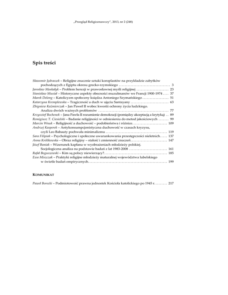 „Przegląd Religioznawczy”, 2013, nr 2 (248) Spis treści Sławomir Jędraszek – Religijne znacznie sztuki koroplastów na przykładzie zabytków pochodzących z Egiptu okresu grecko-rzymskiego . . . . . . . . . . . . . . . . . . . . . . . . . . . . . . . . . . . 3 Jarosław Moskałyk – Problem herezji w prawosławnej myśli religijnej . . . . . . . . . . . . . . . . . . . . . . 23 Stanisław Musiał – Historyczne aspekty obecności muzułmanów we Francji 1900-1974 . . . . 37 Marek Delong – Katolicyzm społeczny księdza Antoniego Szymańskiego . . . . . . . . . . . . . . . . . . 51 Katarzyna Kremplewska – Tragiczność a duch w ujęciu Santayany . . . . . . . . . . . . . . . . . . . . . . . . . . 63 Zbigniew Kaźmierczak – Jan Paweł II wobec kwestii ochrony życia ludzkiego. Analiza dwóch ważnych problemów . . . . . . . . . . . . . . . . . . . . . . . . . . . . . . . . . . . . . . . . . . . . . . . . 77 Krzysztof Bochenek – Jana Pawła II rozumienie demokracji (pomiędzy akceptacją a krytyką) . . 89 Remigiusz T. Ciesielski – Badanie religijności w odniesieniu do metod jakościowych . . . . . . . 99 Marcin Wnuk – Religijność a duchowość – podobieństwa i różnice. . . . . . . . . . . . . . . . . . . . . . . . 109 Andrzej Kasperek – Antykonsumpcjonistyczna duchowość w czasach kryzysu, czyli Leo Babauty pochwała minimalizmu . . . . . . . . . . . . . . . . . . . . . . . . . . . . . . . . . . . . . . . . . . 119 Sara Filipiak – Psychologiczne i społeczne uwarunkowania przestępczości nieletnich . . . . . 137 Anna Królikowska – Obraz religijny – stałość i zmienność znaczeń . . . . . . . . . . . . . . . . . . . . . . . . . 147 Józef Baniak – Wizerunek kapłana w wyobrażeniach młodzieży polskiej. Socjologiczna analiza na podstawie badań z lat 1983-2008 . . . . . . . . . . . . . . . . . . . . . . . . . . 161 Rafał Boguszewski – Kim są polscy niewierzący? . . . . . . . . . . . . . . . . . . . . . . . . . . . . . . . . . . . . . . . . . . . 185 Ewa Miszczak – Praktyki religijne młodzieży maturalnej województwa lubelskiego w świetle badań empirycznych. . . . . . . . . . . . . . . . . . . . . . . . . . . . . . . . . . . . . . . . . . . . . . . . . . . . . . 199 KOMUNIKAT Paweł Borecki – Podmiotowość prawna jednostek Kościoła katolickiego po 1945 r. . . . . . . . . 217 „Przegląd Religioznawczy”, 2013, nr 2 (248) Contents Sławomir Jędraszek – The religious significance of terracottas based on the example of objects coming from Graeco-Roman Egypt . . . . . . . . . . . . . . . . . . . . . . . . . . . . . . . . . . . . . . . . . 3 Jarosław Moskałyk – Problem of heresy in the orthodox religious thought . . . . . . . . . . . . . . . . . . 23 Stanisław Musiał – Historical aspects of the presence of Muslims in France in the years 1900-1974 . . . . . . . . . . . . . . . . . . . . . . . . . . . . . . . . . . . . . . . . . . . . . . . . . . . . . . . . . . . . . . . . 37 Marek Delong – Social Catholicism of the priest Antoni Szymański . . . . . . . . . . . . . . . . . . . . . . . . . 51 Katarzyna Kremplewska – The tragic and the spirit in the perspective of Santayana . . . . . . . . . 63 Zbigniew Kaźmierczak – Pope John Paul II on the question of protection of human life. An analysis of two important problems . . . . . . . . . . . . . . . . . . . . . . . . . . . . . . . . . . . . . . . . . . . . . . 77 Krzysztof Bochenek – Pope John Paul's II understanding of democracy . . . . . . . . . . . . . . . . . . . . . 89 Remigiusz T. Ciesielski – Religiosity research with reference to qualitative methods . . . . . . . . 99 Marcin Wnuk – Religiosity and spirituality – similarities and differences. . . . . . . . . . . . . . . . . . 109 Andrzej Kasperek – Anti-consumerist spirituality in the time of crisis or Leo Babauta's praise of minimalism . . . . . . . . . . . . . . . . . . . . . . . . . . . . . . . . . . . . . . . . . . . . . . 119 Sara Filipiak – Psychological and social conditioning of criminality of minors . . . . . . . . . . . . . 137 Anna Królikowska – Religious picture: the permanence and changes of meanings . . . . . . . . . 147 Józef Baniak – The image of the priest in the imagination of the Polish youth. Sociological analysis on the basis of research made in the years 1983-2008 . . . . . . . . . . 161 Rafał Boguszewski – Who are Polish non-believers . . . . . . . . . . . . . . . . . . . . . . . . . . . . . . . . . . . . . . . . . 185 Ewa Miszczak – Religious practices of the high school graduates in Lublin voivodship in the empirical research . . . . . . . . . . . . . . . . . . . . . . . . . . . . . . . . . . . . . . . . . . . . . . . . . . . . . . . . . . . . 199 BULLETIN Paweł Borecki – Legal subjectivity of the units of the Catholic Church after 1945. . . . . . . . . . . 217