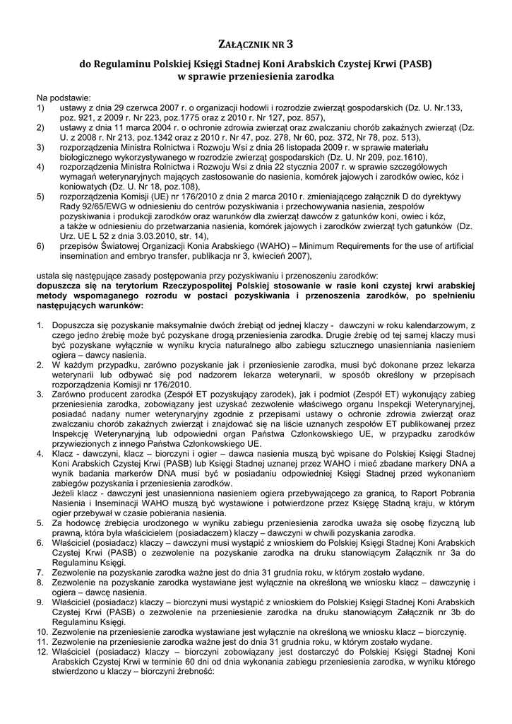 ZAŁĄCZNIK NR 3 do Regulaminu Polskiej Księgi Stadnej Koni Arabskich Czystej Krwi (PASB) w sprawie przeniesienia zarodka Na podstawie: 1) ustawy z dnia 29 czerwca 2007 r. o organizacji hodowli i rozrodzie zwierząt gospodarskich (Dz. U. Nr.133, poz. 921, z 2009 r. Nr 223, poz.1775 oraz z 2010 r. Nr 127, poz. 857), 2) ustawy z dnia 11 marca 2004 r. o ochronie zdrowia zwierząt oraz zwalczaniu chorób zakaźnych zwierząt (Dz. U. z 2008 r. Nr 213, poz.1342 oraz z 2010 r. Nr 47, poz. 278, Nr 60, poz. 372, Nr 78, poz. 513), 3) rozporządzenia Ministra Rolnictwa i Rozwoju Wsi z dnia 26 listopada 2009 r. w sprawie materiału biologicznego wykorzystywanego w rozrodzie zwierząt gospodarskich (Dz. U. Nr 209, poz.1610), 4) rozporządzenia Ministra Rolnictwa i Rozwoju Wsi z dnia 22 stycznia 2007 r. w sprawie szczegółowych wymagań weterynaryjnych mających zastosowanie do nasienia, komórek jajowych i zarodków owiec, kóz i koniowatych (Dz. U. Nr 18, poz.108), 5) rozporządzenia Komisji (UE) nr 176/2010 z dnia 2 marca 2010 r. zmieniającego załącznik D do dyrektywy Rady 92/65/EWG w odniesieniu do centrów pozyskiwania i przechowywania nasienia, zespołów pozyskiwania i produkcji zarodków oraz warunków dla zwierząt dawców z gatunków koni, owiec i kóz, a także w odniesieniu do przetwarzania nasienia, komórek jajowych i zarodków zwierząt tych gatunków (Dz. Urz. UE L 52 z dnia 3.03.2010, str. 14), 6) przepisów Światowej Organizacji Konia Arabskiego (WAHO) – Minimum Requirements for the use of artificial insemination and embryo transfer, publikacja nr 3, kwiecień 2007), ustala się następujące zasady postępowania przy pozyskiwaniu i przenoszeniu zarodków: dopuszcza się na terytorium Rzeczypospolitej Polskiej stosowanie w rasie koni czystej krwi arabskiej metody wspomaganego rozrodu w postaci pozyskiwania i przenoszenia zarodków, po spełnieniu następujących warunków: 1. Dopuszcza się pozyskanie maksymalnie dwóch źrebiąt od jednej klaczy - dawczyni w roku kalendarzowym, z czego jedno źrebię może być pozyskane drogą przeniesienia zarodka. Drugie źrebię od tej samej klaczy musi być pozyskane wyłącznie w wyniku krycia naturalnego albo zabiegu sztucznego unasienniania nasieniem ogiera – dawcy nasienia. 2. W każdym przypadku, zarówno pozyskanie jak i przeniesienie zarodka, musi być dokonane przez lekarza weterynarii lub odbywać się pod nadzorem lekarza weterynarii, w sposób określony w przepisach rozporządzenia Komisji nr 176/2010. 3. Zarówno producent zarodka (Zespół ET pozyskujący zarodek), jak i podmiot (Zespół ET) wykonujący zabieg przeniesienia zarodka, zobowiązany jest uzyskać zezwolenie właściwego organu Inspekcji Weterynaryjnej, posiadać nadany numer weterynaryjny zgodnie z przepisami ustawy o ochronie zdrowia zwierząt oraz zwalczaniu chorób zakaźnych zwierząt i znajdować się na liście uznanych zespołów ET publikowanej przez Inspekcję Weterynaryjną lub odpowiedni organ Państwa Członkowskiego UE, w przypadku zarodków przywiezionych z innego Państwa Członkowskiego UE. 4. Klacz - dawczyni, klacz – biorczyni i ogier – dawca nasienia muszą być wpisane do Polskiej Księgi Stadnej Koni Arabskich Czystej Krwi (PASB) lub Księgi Stadnej uznanej przez WAHO i mieć zbadane markery DNA a wynik badania markerów DNA musi być w posiadaniu odpowiedniej Księgi Stadnej przed wykonaniem zabiegów pozyskania i przeniesienia zarodków. Jeżeli klacz - dawczyni jest unasienniona nasieniem ogiera przebywającego za granicą, to Raport Pobrania Nasienia i Inseminacji WAHO muszą być wystawione i potwierdzone przez Księgę Stadną kraju, w którym ogier przebywał w czasie pobierania nasienia. 5. Za hodowcę źrebięcia urodzonego w wyniku zabiegu przeniesienia zarodka uważa się osobę fizyczną lub prawną, która była właścicielem (posiadaczem) klaczy – dawczyni w chwili pozyskania zarodka. 6. Właściciel (posiadacz) klaczy – dawczyni musi wystąpić z wnioskiem do Polskiej Księgi Stadnej Koni Arabskich Czystej Krwi (PASB) o zezwolenie na pozyskanie zarodka na druku stanowiącym Załącznik nr 3a do Regulaminu Księgi. 7. Zezwolenie na pozyskanie zarodka ważne jest do dnia 31 grudnia roku, w którym zostało wydane. 8. Zezwolenie na pozyskanie zarodka wystawiane jest wyłącznie na określoną we wniosku klacz – dawczynię i ogiera – dawcę nasienia. 9. Właściciel (posiadacz) klaczy – biorczyni musi wystąpić z wnioskiem do Polskiej Księgi Stadnej Koni Arabskich Czystej Krwi (PASB) o zezwolenie na przeniesienie zarodka na druku stanowiącym Załącznik nr 3b do Regulaminu Księgi. 10. Zezwolenie na przeniesienie zarodka wystawiane jest wyłącznie na określoną we wniosku klacz – biorczynię. 11. Zezwolenie na przeniesienie zarodka ważne jest do dnia 31 grudnia roku, w którym zostało wydane. 12. Właściciel (posiadacz) klaczy – biorczyni zobowiązany jest dostarczyć do Polskiej Księgi Stadnej Koni Arabskich Czystej Krwi w terminie 60 dni od dnia wykonania zabiegu przeniesienia zarodka, w wyniku którego stwierdzono u klaczy – biorczyni źrebność: a) zaświadczenie o przeniesieniu zarodka potwierdzające datę i miejsce wykonania zabiegu. Zaświadczenie o przeniesieniu zarodka wystawia bezpośrednio po wykonaniu zabiegu podmiot (Zespół ET) dokonujący tego zabiegu, zgodnie ze wzorem określonym w załączniku nr 12 do rozporządzenia Ministra Rolnictwa i Rozwoju Wsi w sprawie materiału biologicznego wykorzystywanego w rozrodzie zwierząt gospodarskich. b) świadectwo źrebności klaczy sporządzone i podpisane przez lekarza weterynarii. Oryginał zaświadczenia o przeniesieniu zarodka otrzymuje właściciel (posiadacz) klaczy – biorczyni, przy czym jedną kopię tego zaświadczenia podmiot dokonujący zabiegu przekazuje podmiotowi, który dostarczył zarodek wykorzystany do zabiegu, a drugą kopię zaświadczenia pozostawia się w dokumentacji prowadzonej przez ten podmiot. Podmiot dokonu
