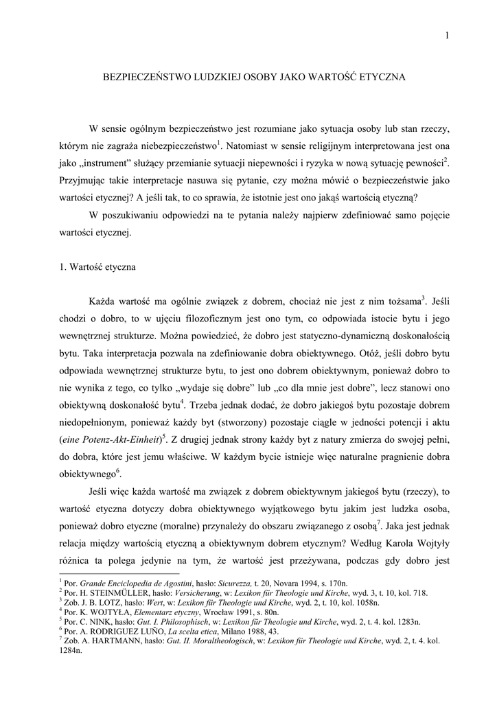1 BEZPIECZEŃSTWO LUDZKIEJ OSOBY JAKO WARTOŚĆ ETYCZNA W sensie ogólnym bezpieczeństwo jest rozumiane jako sytuacja osoby lub stan rzeczy, którym nie zagraża niebezpieczeństwo1. Natomiast w sensie religijnym interpretowana jest ona jako „instrument” służący przemianie sytuacji niepewności i ryzyka w nową sytuację pewności2. Przyjmując takie interpretacje nasuwa się pytanie, czy można mówić o bezpieczeństwie jako wartości etycznej? A jeśli tak, to co sprawia, że istotnie jest ono jakąś wartością etyczną? W poszukiwaniu odpowiedzi na te pytania należy najpierw zdefiniować samo pojęcie wartości etycznej. 1. Wartość etyczna Każda wartość ma ogólnie związek z dobrem, chociaż nie jest z nim tożsama3. Jeśli chodzi o dobro, to w ujęciu filozoficznym jest ono tym, co odpowiada istocie bytu i jego wewnętrznej strukturze. Można powiedzieć, że dobro jest statyczno-dynamiczną doskonałością bytu. Taka interpretacja pozwala na zdefiniowanie dobra obiektywnego. Otóż, jeśli dobro bytu odpowiada wewnętrznej strukturze bytu, to jest ono dobrem obiektywnym, ponieważ dobro to nie wynika z tego, co tylko „wydaje się dobre” lub „co dla mnie jest dobre”, lecz stanowi ono obiektywną doskonałość bytu4. Trzeba jednak dodać, że dobro jakiegoś bytu pozostaje dobrem niedopełnionym, ponieważ każdy byt (stworzony) pozostaje ciągle w jedności potencji i aktu (eine Potenz-Akt-Einheit)5. Z drugiej jednak strony każdy byt z natury zmierza do swojej pełni, do dobra, które jest jemu właściwe. W każdym bycie istnieje więc naturalne pragnienie dobra obiektywnego6. Jeśli więc każda wartość ma związek z dobrem obiektywnym jakiegoś bytu (rzeczy), to wartość etyczna dotyczy dobra obiektywnego wyjątkowego bytu jakim jest ludzka osoba, ponieważ dobro etyczne (moralne) przynależy do obszaru związanego z osobą7. Jaka jest jednak relacja między wartością etyczną a obiektywnym dobrem etycznym? Według Karola Wojtyły różnica ta polega jedynie na tym, że wartość jest przeżywana, podczas gdy dobro jest 1 Por. Grande Enciclopedia de Agostini, hasło: Sicurezza, t. 20, Novara 1994, s. 170n. Por. H. STEINMÜLLER, hasło: Versicherung, w: Lexikon für Theologie und Kirche, wyd. 3, t. 10, kol. 718. 3 Zob. J. B. LOTZ, hasło: Wert, w: Lexikon für Theologie und Kirche, wyd. 2, t. 10, kol. 1058n. 4 Por. K. WOJTYŁA, Elementarz etyczny, Wrocław 1991, s. 80n. 5 Por. C. NINK, hasło: Gut. I. Philosophisch, w: Lexikon für Theologie und Kirche, wyd. 2, t. 4. kol. 1283n. 6 Por. A. RODRIGUEZ LUÑO, La scelta etica, Milano 1988, 43. 7 Zob. A. HARTMANN, hasło: Gut. II. Moraltheologisch, w: Lexikon für Theologie und Kirche, wyd. 2, t. 4. kol. 1284n. 2 2 realizowane przez czyny człowieka: „Człowiek bowiem przeżywa różne wartości, ale realizuje swymi czynami dobro”8. Dobro osoby różnicuje się ze względu na wewnętrzną strukturę ludzkiego bytu, ze względu na jego społeczny charakter oraz ze względu na jego relację do innych obszarów rzeczywistości9. Zróżnicowane dobro sprawia, że człowiek jako osoba przeżywa i doświadcza różnych wartości. Podstawową wartością jest samo istnienie osoby, jej życie. Zwraca na to uwagę św. Tomasz z Akwinu, określając samo istnienie bytu jako realny warunek możliwości osiągnięcia przez ten byt jakiejkolwiek doskonałości10. Pozostałe wartości etyczne tworzą pewną hierarchię. Najważniejsze w niej są wartości duchowe, ponieważ wprowadzają one ludzką osobę o wiele gruntowniej w obiektywne dobro11. Oznacza to, że wartości duchowe, o ile są przeżywane coraz bardziej przez ludzką osobę, o tyle pełniej urzeczywistniają to, co stanowi jej istotę12. Jednak wybór tych wartości wymaga ze strony człowieka większego wysiłku, a nawet wyrzeczenia. Karol Wojtyła twierdzi, że te wartości, które więcej kosztują ludzki podmiot, z pewnością są wartościami wyższymi13. Zastanawiając się nad nimi, zauważa on jeszcze jedną prawidłowość, która wydaje się paradoksalna. Otóż wartości duchowe, które mają swoje źródło w ludzkim duchu, okazują się słabsze od wartości materialnych, ponieważ człowiek mocniej, bardziej bezpośrednio odczuwa to, co materialne, to, co podpada pod zmysły i przynosi im zadowolenie14. W konsekwencji człowiekowi jako istocie duchowo-cielesnej trudniej jest na co dzień dostrzec, rozpoznać i wybrać wyższe, duchowe wartości. Przyciąga go bardziej to, co cielesne i materialne. Dlatego, zdaniem Karola Wojtyły, konieczna jest asceza, która porządkuje hierarchię wartości15. Nieporządek w hierarchii wartości, trudności w ujęciu i poznaniu wartości duchowych i materialnych wpływają niewątpliwie na stan dzisiejszej aksjologii. Jest on określany ogólnie jako stan impasu16. Dlatego stawianie pytań o wartości i próba ich definiowania jest dziś jak najbardziej zasadna i wskazana. Jednak punktem odniesienia w szukaniu odpowiedzi na pytania o wartości musi pozostać człowiek i jego wartość. 8 K. WOJTYŁA, Elementarz etyczny, Wrocław 1991, s. 80. Zob. A. HARTMANN, hasło: Gut. II. Moraltheologisch, w: Lexikon für Theologie und Kirche, wyd. 2, t. 4. kol. 1284n. 10 Zob. T. STYCZEŃ, hasło: Aksjologia, w: Encyklopedia katolicka, t. 1., kol. 256-260, 257. 11 Por. K. WOJTYŁA, Elementarz etyczny, Wrocław 1991, s. 81. 12 Zob. T. STYCZEŃ, hasło: Aksjologia, w: Encyklopedia katolicka, t. 1., kol. 256-260, 260. 13 Por. K. WOJTYŁA, Elementarz etyczny, Wrocław 1991, s. 81. 14 TAMŻE, s. 85. 15 „Asceza służy do tego, aby wszystkie wartości rzetelnie uporządkowane wysiłkiem człowieka znalazły się w prawidłowym stosunku do Dobra Najwyższego”: K. WOJTYŁA, Elementarz etyczny, Wrocław 1991, s. 88. 16 Zob. T. STYCZEŃ, hasło: Aksjologia, w: Encyklopedia katolicka, t. 1., kol. 256-260, 259. 9 3 2. Wartość bytu ludzkiego Człowiek sam w sobie jako cielesno-duchowy byt posiada największą wartość.