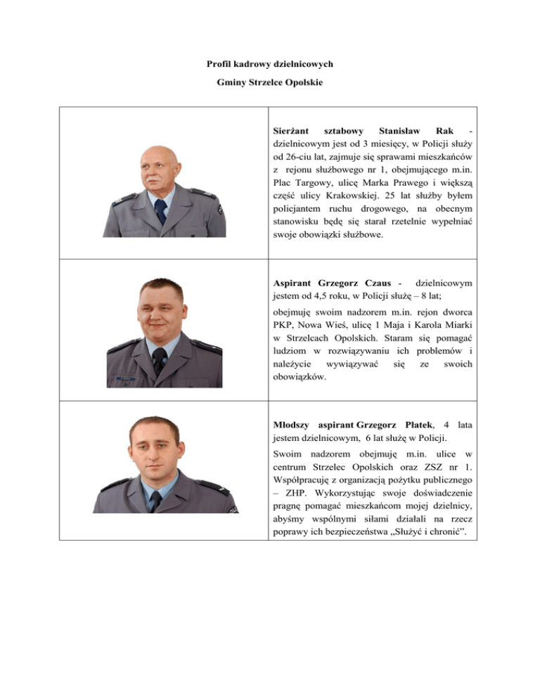 Profil kadrowy dzielnicowych Gminy Strzelce Opolskie SierŜant sztabowy Stanisław Rak dzielnicowym jest od 3 miesięcy, w Policji słuŜy od 26-ciu lat, zajmuje się sprawami mieszkańców z rejonu słuŜbowego nr 1, obejmującego m.in. Plac Targowy, ulicę Marka Prawego i większą część ulicy Krakowskiej. 25 lat słuŜby byłem policjantem ruchu drogowego, na obecnym stanowisku będę się starał rzetelnie wypełniać swoje obowiązki słuŜbowe. Aspirant Grzegorz Czaus - dzielnicowym jestem od 4,5 roku, w Policji słuŜę – 8 lat; obejmuję swoim nadzorem m.in. rejon dworca PKP, Nowa Wieś, ulicę 1 Maja i Karola Miarki w Strzelcach Opolskich. Staram się pomagać ludziom w rozwiązywaniu ich problemów i naleŜycie wywiązywać się ze swoich obowiązków. Młodszy aspirant Grzegorz Płatek, 4 lata jestem dzielnicowym, 6 lat słuŜę w Policji. Swoim nadzorem obejmuję m.in. ulice w centrum Strzelec Opolskich oraz ZSZ nr 1. Współpracuję z organizacją poŜytku publicznego – ZHP. Wykorzystując swoje doświadczenie pragnę pomagać mieszkańcom mojej dzielnicy, abyśmy wspólnymi siłami działali na rzecz poprawy ich bezpieczeństwa „SłuŜyć i chronić”. SierŜant Piotr Klimek - dzielnicowym jestem 2 lata, policjantem od 5. Obejmuję swoim nadzorem m.in. ulice w Strzelcach Opolskich w rejonie marketu Kaufland, Wyszyńskiego, Strzelców Bytomskich. Staram się rzetelnie i sumiennie wykonywać swoją pracę. Aspirant Andrzej Bogusz - w Policji słuŜę 11 lat, od 8 lat jestem dzielnicowym. Swoim nadzorem obejmuję m.in. Osiedle Piastów Śląskich oraz ulice Bursztynową i Wł. Łokietka w Strzelcach Opolskich. Staram się rzetelnie wykonywać swoje obowiązki i w miarę moŜliwości pomagać ludziom oraz łagodzić spory sąsiedzkie wykorzystując zdobyte doświadczenie. Młodszy aspirant Ireneusz Nemś - prawie 1,5 roku jestem dzielnicowym, a w Policji słuŜę 11 lat. Swoim nadzorem obejmuję m.in. ulicę Rychla, Mickiewicza, Kozielską, Ujazdowską w Strzelcach Opolskich. Staram się pomagać ludziom w mojej dzielnicy, którzy zwracają się do mnie z róŜnymi problemami. Aspirant Dariusz Marszałek, od 8 lat jestem dzielnicowym, od prawie dwóch lat na terenie pozamiejskim. Policjantem jestem prawie 9 lat. SłuŜę mieszkańcom rejonu słuŜbowego nr 7 (Grodzisko, Rozmierz, Sucha, Szymiszów, RoŜniątów, Kalinów, Kalinowice, Ligota Dolna, Ligota Górna, Niwki). Staram się swoją pracę wykonywać sumiennie i naleŜycie. Wykorzystując swoje doświadczenie zawodowe i Ŝyciowe staram się pomagać mieszkańcom rozwiązywać problemy czy teŜ łagodzić spory sąsiedzkie. Młodszy aspirant Dariusz Popanda policjantem jest od 6,5 roku, jako dzielnicowy słuŜy mieszkańcom od 3,5 roku, swoim nadzorem obejmuje miejscowości: - Kadłub, Osiek, Jędrynie, Rozmierka, Szczepanek, Dziewkowice, Warmątowice, Błotnica Strzelecka, PłuŜnica, Brzezina. Obecnie przebywa na misji pokojowej w Kosowie.