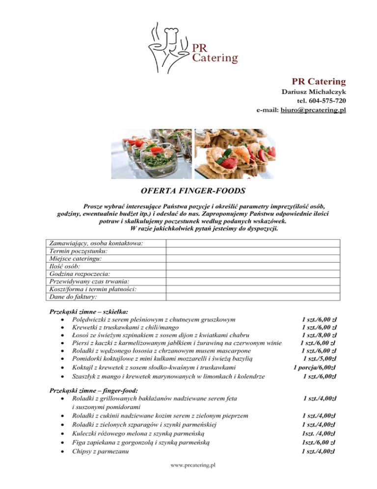 PR Catering Dariusz Michalczyk tel. 604-575-720 e-mail: [email protected] OFERTA FINGER-FOODS Prosze wybrać interesujące Państwa pozycje i określić parametry imprezy(ilość osób, godziny, ewentualnie budżet itp.) i odesłać do nas. Zaproponujemy Państwu odpowiednie ilości potraw i skalkulujemy poczestunek według podanych wskazówek. W razie jakichkolwiek pytań jesteśmy do dyspozycji. Zamawiający, osoba kontaktowa: Termin poczęstunku: Miejsce cateringu: Ilość osób: Godzina rozpoczecia: Przewidywany czas trwania: Koszt/forma i termin płatności: Dane do faktury: Przekąski zimne – szkiełka: Polędwiczki z serem pleśniowym z chutneyem gruszkowym Krewetki z truskawkami z chili/mango Łosoś ze świeżym szpinakiem z sosem dijon z kwiatkami chabru Piersi z kaczki z karmelizowanym jabłkiem i żurawiną na czerwonym winie Roladki z wędzonego łososia z chrzanowym musem mascarpone Pomidorki koktajlowe z mini kulkami mozzarelli i świeżą bazylią Koktajl z krewetek z sosem słodko-kwaśnym i truskawkami Szaszłyk z mango i krewetek marynowanych w limonkach i kolendrze Przekąski zimne – finger-food: Roladki z grillowanych bakłażanów nadziewane serem feta i suszonymi pomidorami Roladki z cukinii nadziewane kozim serem z zielonym pieprzem Roladki z zielonych szparagów i szynki parmeńskiej Kuleczki różowego melona z szynką parmeńską Figa zapiekana z gorgonzolą i szynką parmeńską Chipsy z parmezanu www.prcatering.pl 1 szt./6,00 zł 1 szt./6,00 zł 1 szt./8,00 zł 1 szt./6,00 zł 1 szt./6,00 zł 1 szt./5,00zł 1 porcja/6,00zł 1 szt./6,00zł 1 szt./4,00zł 1 szt./4,00zł 1 szt./4,00zł 1szt. /4,00zł 1szt./6,00 zł 1 szt./4,00zł Paluszki grisini z rucolą i szynką szwarcwaldzką Mini tatar wołowy na grzance z jajkiem przepiórczym Mini tatar z łososia surowego i wędzonego na grzance z kaparami „ Salami Chips” plasterki salami zapiekane z kozim serem, przekładane guacamole z avocado Zielone naleśnikowe roladki z cytrynowym mascarpone, świeżym ogórkiem i wędzonym łososiem Thai Rollsy (w papierze ryżowym) z pieczonym łososiem w teryaki i warzywami z pieczonym kurczakiem w sosie słodko-kwaśnym z marynowanymi krewetkami i warzywami 1 szt./4,00zł 1szt./5,00zł 1 porcja/5,00zł 1 szt.4,00zł 1 szt./4,00zł 1 porcja/5,00zł Japońskie omlety z algami i sosem teryiaki 1szt./4,00zł Vol-au-vent (mi ciasteczka francuskie w kształcie oczka) z duszonymi w śmietanie i tymianku borowikami z delikatnym musem z wędzonego pstrąga z ricottą i wędzonym łososiem 1 szt./3,50zł Tartoletki (mini kruche babeczki) z tepenade /pasta z czarnych oliwek z migdałami i anchovies/ z hoummusem /pasta z ciecierzycy z czosnkiem, sokiem z cytryny i sezamem/ z melizanosalata /pasta z pieczonego bakłażana z pomidorami i orzechami z guacamole /pasta z avocado z oliwą, chili, kolendrą, czosnkiem i pomidorami/ z mascarpone, suszonymi pomidorami i oliwkami z bryndzą owczą miodem gryczanym i orzechami 1 szt./3,50zł Szaszłyki serowe z różnych gatunków serów z bakaliami piklami owocami 1 szt./3,00zł Kuleczki serowe (cheeseballsy) z ziołami, orzechami, żurawiną 1 szt./3,00zł Tartinki: (z różnego pieczywa tostowego: z ziarnami, pszennego, żytniego) 1 szt./4,00zł Kanapki koktajlowe (z bagietki) sezamowe z wędzonym łososiem i pikantnym musem mascarpone z kremem cytrynowym i krewetką z tatarem z wołowiny i piklami z tatarem z łososia, szalotkami i kaparami z marynowaną wołowiną (carpaccio) i marynowanymi w balsamico szalotkami 1 szt./4,00zł www.prcatering.pl z serem camembert , masłem orzechowym i bakaliami z szynką parmeńską i rucolą z serkiem fromage z warzywami z jakiem przepiórczym i anchovies mozzarellą, pomidorkami cherry i bazylią z wędzonym łososiem i pikantnym mascarpone z pepperoni i piklami z bryndzą owczą orzechami i żurawiną Sałatki: (podane w mini koszyczkach z tortilli) porcja sałatki/12,00zł Sałatka tabule z kus-kus, ciecierzycą, natką pietruszki i miętą /z ciecierzycą, sezamem, czosnkiem, sokiem z cytryny i natką pietruszki/ Oryginalna sałatka „Ceasar” z sałaty rzymskiej z pieczonym kurczakiem, grzankami i sosem z parmezanu, anchovies i oliwy Sałatka „Ceasar” z krewetkami z sosem z parmezanu , oliwy i anchovies Bukiet sałat z wędzoną kaczką, filetowanymi pomarańczami i żurawiną, podany z cytrusowym sosem vinnaigrette Sałatka z młodych listków szpinaku z grillowaną katalońską Chorizzo z suszonymi pomidorami , z sosem vinnaigette miodowo-musztardowym Bukiet sałat z kurczakiem pieczonym w miodzie i orzechach włoskich z miodowo musztardowym sosem vinnaigrette Sałatka „Szopska” ze świeżych warzyw z serem feta i oliwkami z sosem vinnaigrette Sałatka z rucoli z grillowanym oscypkiem i żurawiną z malinową vinnaigrettą Sałatka z kozim serem, suszonymi pomidorami i cebulkami marynowanymi w balsamico, podana z balsamiczną vinnaigrettą Sałatka z pieczonym łososiem marynowanym w sosie Teriyaki, z marynowanym imbirem i chrupiącymi kiełkami fasolki Sałatka „Rozmaitości” z grillowanym kurczakiem i serem feta Bukiet sałat z krabami, filetowanymi pomarańczami i parmezanem Bukiet sałat z drobiową wątróbką, karmelizowanymi wiśniami i owocami Przekąski gorące: (w podgrzewaczach lub roznoszone na tacach) Pieczone małe ziemniaczki zapiekane z serem gorgonzola Łódeczki z ziemniaków opiekane z ziołami i bekonem Pikantne tiftele (kulki mięsne) Śliwka kalifornijska zapiekana w boczku Polędwiczki z kurczaka zapiekane w szynce parmeńskiej Polędwiczki z kurczaka w pikantnych płatkach kukurydzianych Roladki z kurczaka nadziewane szpinakiem www.prcatering.pl 1 szt./4,00zł 1szt./4,00zł 1szt./3,50zł 1szt./3,50zł 1szt./5,00zł 1szt./4,50zł 1szt./5,50zł Medaliony z polędwiczek wieprzowych zapiekane w szynce westfalskiej Medaliony z polędwiczek wieprzowych nadziewane wędzonym łososiem Szaszłyczki z grillowanym serem halloumi , pieczoną papryką i cukinią Paniero