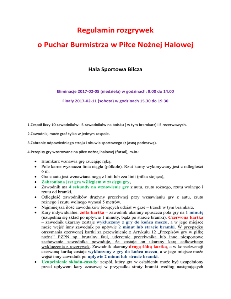 Regulamin rozgrywek o Puchar Burmistrza w Piłce Nożnej Halowej Hala Sportowa Bilcza Eliminacje 2017-02-05 (niedziela) w godzinach: 9.00 do 14.00 Finały 2017-02-11 (sobota) w godzinach 15.30 do 19.30 1.Zespół liczy 10 zawodników: 5 zawodników na boisku ( w tym bramkarz) i 5 rezerwowych. 2.Zawodnik, może grać tylko w jednym zespole. 3.Zabranie odpowiedniego stroju i obuwia sportowego (z jasną podeszwą). 4.Przepisy gry wzorowane na piłce nożnej halowej (futsal), m.in.: Bramkarz wznawia grę rzucając ręką, Pole karne wyznacza linia ciągła (półkole). Rzut karny wykonywany jest z odległości 6 m. Gra z autu jest wznawiana nogą z linii lub zza linii (piłka stojąca), Zabroniona jest gra wślizgiem w zasięgu gry, Zawodnik ma 4 sekundy na wznowienie gry z autu, rzutu rożnego, rzutu wolnego i rzutu od bramki, Odległość zawodników drużyny przeciwnej przy wznawianiu gry z autu, rzutu rożnego i rzutu wolnego wynosi 5 metrów, Najmniejsza ilość zawodników biorących udział w grze – trzech w tym bramkarz. Kary indywidualne: żółta kartka – zawodnik ukarany opuszcza pola gry na 1 minutę (uzupełnia się skład po upływie 1 minuty, bądź po stracie bramki). Czerwona kartka – zawodnik ukarany zostaje wykluczony z gry do końca meczu, a w jego miejsce może wejść inny zawodnik po upływie 2 minut lub stracie bramki. W przypadku otrzymania czerwonej kartki za przewinienie z Artykułu 12 „Przepisów gry w piłkę nożną” PZPN np. brutalny faul, uderzenie przeciwnika lub inne niesportowe zachowanie zawodnika powoduje, że zostaje on ukarany karą całkowitego wykluczenia z rozgrywek. Zawodnik ukarany drugą żółtą kartką, a w konsekwencji czerwoną kartką zostaje wykluczony z gry do końca meczu, a w jego miejsce może wejść inny zawodnik po upływie 2 minut lub stracie bramki. Uzupełnienie składu-zasady: zespół, który gra w osłabieniu może być uzupełniony przed upływem kary czasowej w przypadku straty bramki według następujących zasad: a) jeżeli 5 zawodników gra przeciwko 4 zawodnikom i zespół z większa liczbą zawodników zdobędzie bramkę to drużyna z 4 zawodnikami może uzupełnić skład. b) jeżeli obie drużyny mają po 4 zawodników i padnie bramka to oba zespoły nie uzupełniają składu c) jeżeli 5 zawodników gra przeciw 3-em zawodnikom lub 4-ech przeciw 3-em i zespół z większa ilością zawodników zdobędzie bramkę to zespół z 3ką zawodników może uzupełnić skład tylko o jednego zawodnika d) jeżeli obie drużyny mają po 3 zawodników i padnie bramka to zespoły nie uzupełniają składów e) jeżeli drużyna grająca w osłabieniu zdobędzie bramkę, to nadal gra w osłabieniu, aż do końca kary czasowej nałożonej na zawodnika lub straty bramki. 5.O kolejności w grupie (eliminacje i finały) decydują kolejno: punkty, bramki, bezpośredni pojedynek, losowanie. 6.Awanse, podział na grupy w finałach: a) Do finałów, które są przewidziane na 11 lutego awansują: z grupy A: 3 najlepsze zespoły; z grup B i C: 2 najlepsze zespoły i zespół z lepszym bilansem z trzecich miejsc (decydują: punkty, bramki, gdy bramki równo – więcej zdobytych goli, losowanie). b) Do półfinałów awansują po dwa najlepsze zespoły z grup finałowych i mecze grane będą „na krzyż” A1-B2 i B2-A1. c) Podział na grupy finałowe: Grupa A: zespoły z grup eliminacyjnych: A1, B2, C2 i A3. Grupa B: zespoły z grup eliminacyjnych: B1, C1, A2 i B3/C3. d) Rzuty karne, w przypadku wystąpienia remisu w półfinale, finale i meczu o III miejsce – po 3 w każdej drużynie lub do skutku. 7.Czas gry: a) eliminacje: 10 minut (bez zmiany stron), kolejność meczy w grupie 2-3, 4-5, 1-2, 3-4, 5-1, 2-4, 3-5, 1-4, 5-2, 1-3 w grupie pięciozespołowej. 12 minut (bez zmiany stron), kolejność meczy w grupach 1-4, 2-3, 3-1, 4-2, 3-4, 2-1 w grupie czterozespołowej. b) finały: 12 minut (bez zmiany stron), kolejność meczy w grupach 1-4, 2-3, 3-1, 4-2, 3-4, 2-1. Grupy grają na przemian 2 mecze z grupy A, potem dwa mecze z grupy B. Czas gry. Zatrzymywany jest gdy: w ostatniej minucie meczu przy wyniku remisowym lub gdy jedna z drużyn ma przewagę jednej bramki, kiedy piłka opuści pole gry (wypadnie na trybuny, korytarz) kiedy jeden z sędziów prowadzących zawody zarządzi zatrzymanie czasu gry. 8.Zgłoszenia wg druku zamieszczonego na stronie internetowej (osoby niepełnoletnie dodatkowo wypełniają druk „Zgoda rodziców na uczestnictwo”- bez spełnienia tego warunku brak możliwości uczestnictwa w turnieju). Osoba niepełnoletnia mogąca wystąpić w Turnieju musi mieć ukończone 15 lat. 9. Podczas całego turniej będzie zapewniona opieka medyczną. 10.Za drużynę odpowiedzialny jest kapitan lub opiekun zespołu. 11.Każdy uczestnik zobowiązany jest posiadać dokument tożsamości: dowód osobisty, paszport lub legitymację szkolną (dotyczy niepełnoletnich). W każdym zespole MUSI być co najmniej trzech zawodników z terenu Gminy Morawica (wytyczne: przed zawodami lista jest weryfikowana wg zgłoszenia – jeżeli zespół nie spełnia warunku, to nie zostaje dopuszczony do rozgrywek; jeżeli w trakcie turnieju zgłoszony zostanie oficjalny protest przez inny zespół a wcześniej zespół poświadczył nieprawdę – zostaje wykluczony z rozgrywek). 11. Zespól jest zobowiązany do zapoznania się z regulaminem rozgrywek i regulaminem „Hali Bilcza” 12.Nagrody: Puchary: dla najlepszych 4 zespołów turnieju; Piłka do Futsalu: dla najlepszych 4 zespołów turnieju; Statuetka: dla najlepszego zawodnika i bramkarza turnieju (wybierani z grona ścisłego finału); Dyplomy: dla 8 finalistów turnieju; Upominki (gadżety) Miasta i Gminy Morawica: dla zwycięzców turnieju oraz najlepszego bramkarza i zawodnika turnieju. 13.Inne informacje i sprawy organizacyjne na miejscu podczas turnieju. O sprawach nie ujętych w w/w regulaminie decyduje organizator oraz sędzia główny zawodów. UWAGA!!! Zawodnicy biorą