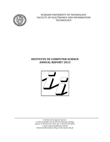 WARSAW UNIVERSITY OF TECHNOLOGY FACULTY OF ELECTRONICS AND INFORMATION TECHNOLOGY INSTITUTE OF COMPUTER SCIENCE ANNUAL REPORT 2013 Institute of Computer Science ul. Nowowiejska 15/19, 00-665 Warsaw, Poland phone: (+48 22) 234 7432, fax: (+48 22) 234 6091 e-mail: [email protected] Internet Information: http://www.ii.pw.edu.pl From the Director The Institute of Computer Science is one of the very few academic institutions in Poland with the longest tradition in computer research & development, as well as in education. The history of the Institute goes back to the year 1953 when the Division of Communications and Radio Equipment was established at the Faculty of Communications (was so called then). In 1960, the Division has designed and built one of the first industrially produced electronic computers in Poland, called UMC1. Teaching in the field of computing and computers has started early in 60's, so that the first few M.Sc. degrees in Computer Science were granted in 1962. From then on, the regular curricula in the field have been proposed. The main activities of the Institute of Computer Science concentrate around teaching of undergraduate and graduate computer science students, as well as, doing research in the field of computer science. The Institute’s main areas for both, i.e. the teaching and research activities, concentrate around computer graphics, information systems, data and text mining, artificial intelligence, computer systems’ architectures, dependable computing and software engineering. This Annual Report summarizes both types of the activities of the Institute in the academic year 2012/2013. Our staffs provides courses in English for the track in Electrical and Computer Engineering, offered by the Faculty of Electronics and Information Technology. Since 1995 the Institute has been running Evening Undergraduate Studies in Computer Engineering, with their own curriculum approved by the authorities of the Faculty. From 1999 on, the graduate level of evening studies is provided, and in 2001 first MSc degrees were granted. Also, since 1990 the Institute has organised (together with the Faculty’s Institute of Telecommunications) a study for postgraduate students, which offers courses in computer science, telecommunications and system management, called CITCOM. In 1994 the Institute’s postgraduate studies in computer science for high school teachers have been organized. They are hold continuously up till now. In 2013 we have also started a new postgraduate studies focused on business intelligence. Now, each year some 80 students receive their BSc degrees and more than 100 students are awarded with MSc degrees. Additionally, we are proud of our PhD students. In 2013, two PhD students have completed their theses and have been awarded with PhD degrees, both with honours. The last year was for the Institute very successful in all the fields of our activities. Two our professors were nominated by the President of Poland with the scientific title of state professor. Particular significance should be given to new investments in our infrastructure. The former server room has been reconstructed and equipped with a modern installation, now being used for the Institute servers. Additionally with the Faculty project FOTEH, new premises for computational laboratory have been prepared. In the research area, in 2013 we have been working on 19 projects. In particular, we have been continuing our very successful work on the strategic project SYNAT, which is devoted to building infrastructure for scientific research community. We have implemented the research results of the project at the level of Warsaw University of Technology in the form of University Knowledge Base, which is now in regular use by all the faculties of the University. We have also continued cooperation with industry, being involved in 10 new projects for our industrial partners. Our co-operation with industry involves not only the Institute’s academic staff but also our PhD and MSc students, who participate in the research projects. In June we have hosted Professor Grzegorz Rozenberg from Leiden University, The Netherlands, who presented a series of lectures on “Natural Computing, Informatics, and Models of the Functioning of Living Cells” for the University staff and PhD students. In September and October we have also hosted Professor Janusz Zalewski from Dept. of Software Engineering Florida Gulf Coast University. The outcome of the research run by the Institute staff is well reflected in our publication record. In 2013 our staff have authored and co-authored 108 publications, (one authored books, two co-edited books, and 105 papers in international scientific journals, and conference proceedings, as well as chapters in the books). Additionally, 10 Institute’s reports have been issued. Our staff have been involved in organizing Internationl Workshop on New Frontiers in Mining Complex Patterns (NFMCP 2013) held at ECML-PKDD in Prague. In 2013 the Institute was also involved in organizing a consecutive nation-wide technical workshop that was devoted to the research being performed within SYNAT. The workshop turned out to be a very successful event. The research achievements of the Institute’s staff are well recognized in the academic community. Our colleagues are invited to the programme and organizing committees of international conferences. They are also often invited for reviewing papers for renowned international journals. It is my pleasure to express my appreciation to the Institute’s staff for their efforts and contributions in the Institute’s achievements in teaching and research. Warsaw, January 2014 Henryk Rybiński 1 GENERAL INFORMATION .................................................................................................................................................... 5 1.1 Mission of the Institute .....................................................................................