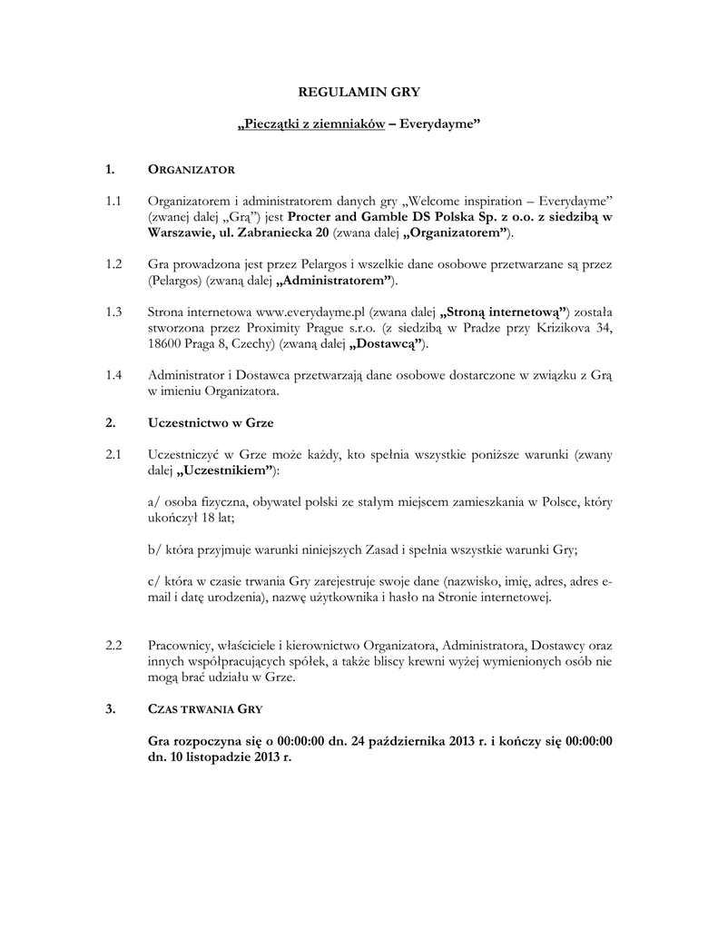 REGULAMIN GRY „Pieczątki z ziemniaków – Everydayme” 1. ORGANIZATOR 1.1 Organizatorem i administratorem danych gry „Welcome inspiration – Everydayme” (zwanej dalej „Grą”) jest Procter and Gamble DS Polska Sp. z o.o. z siedzibą w Warszawie, ul. Zabraniecka 20 (zwana dalej „Organizatorem”). 1.2 Gra prowadzona jest przez Pelargos i wszelkie dane osobowe przetwarzane są przez (Pelargos) (zwaną dalej „Administratorem”). 1.3 Strona internetowa www.everydayme.pl (zwana dalej „Stroną internetową”) została stworzona przez Proximity Prague s.r.o. (z siedzibą w Pradze przy Krizikova 34, 18600 Praga 8, Czechy) (zwaną dalej „Dostawcą”). 1.4 Administrator i Dostawca przetwarzają dane osobowe dostarczone w związku z Grą w imieniu Organizatora. 2. Uczestnictwo w Grze 2.1 Uczestniczyć w Grze może każdy, kto spełnia wszystkie poniższe warunki (zwany dalej „Uczestnikiem”): a/ osoba fizyczna, obywatel polski ze stałym miejscem zamieszkania w Polsce, który ukończył 18 lat; b/ która przyjmuje warunki niniejszych Zasad i spełnia wszystkie warunki Gry; c/ która w czasie trwania Gry zarejestruje swoje dane (nazwisko, imię, adres, adres email i datę urodzenia), nazwę użytkownika i hasło na Stronie internetowej. 2.2 Pracownicy, właściciele i kierownictwo Organizatora, Administratora, Dostawcy oraz innych współpracujących spółek, a także bliscy krewni wyżej wymienionych osób nie mogą brać udziału w Grze. 3. CZAS TRWANIA GRY Gra rozpoczyna się o 00:00:00 dn. 24 października 2013 r. i kończy się 00:00:00 dn. 10 listopadzie 2013 r. 4. ZASADY GRY 4.1 Osoby, które pragną uczestniczyć w Grze, muszą zarejestrować się na Stronie internetowej zgodnie z ust. 2.1 Regulaminu Gry, a następnie wziąć udział w grze zatytułowanej „Pieczątki z ziemniaków” znajdującej się na Stronie internetowej. Po rejestracji Uczestnicy będą identyfikowani za pomocą nazwy użytkownika i hasła podanych podczas rejestracji. Aby uczestniczyć w grze, wymagana jest rejestracja przez gracza na http://www.everydayme.pl/ oraz opublikowanie zdjęcia dekoracji wykonanej własnoręcznie przy użyciu pieczątek z ziemniaków (zainspirowanej artykułem: http://www.everydayme.pl/artykul/zrob-pieczatke-zziemniaka) przez moduł UGC na http://www.everydayme.pl/dzie%C5%84/pieczotki-z-ziemniaka . Opublikowanie zdjęcia i opisu oznacza akceptację Regulaminu Gry przez każdego uczestnika. 4.2 Zwycięzca Gry (zwany dalej „Zwycięzcą”) zostanie wybrany przez Jury z bazy danych zarejestrowanych użytkowników, którzy opublikują zdjęcie dekoracji wykonanej własnoręcznie przy użyciu pieczątek z ziemniaków (zainspirowanej artykułem: http://www.everydayme.pl/artykul/zrob-pieczatke-zziemniaka) przez moduł UGC na http://www.everydayme.pl/ podczas Gry. Jury wybierze 10 zwycięzców, którzy otrzymają nagrodę z 10 najbardziej LUBIANYCH postów. Jury wybierze zwycięskie posty, biorąc pod uwagę następujące kryteria: - Oryginalność własnoręcznie wykonanej dekoracji - Inne kryteria: zabawne, emocjonalne, interesujące, niezwykłe dekoracje - W opisie postów nie powinien się znaleźć tekst “bla-bla-bla” lub wypełniacz Lorem Ipsum - Posty nie powinny składać jedynie z przypadkowych liter, niemających znaczenia 5. NAGRODY 5.1 Do wygrania przez Uczestników dostępne są następujące nagrody (zwane dalej „Nagrodą”): - każdy zwycięzca dostanie 1×paczkę wymienionych poniżej produktów P&G: - 1×Fairy Platinum 720 ml (koszt: 7,29 PLN) - 1×Head & Shoulders Szampon 400ml (koszt: 13,29 PLN) - 1×Ariel Żelowe kapsułki piorące (15 sztuk) (koszt: 19,39 PLN) Całkowita wartość nagrody zdefiniowanej w niniejszym ustępie wynosi: 39,97 PLN. 5.2 Administrator skontaktuje się ze Zwycięzcą w ciągu 5 dni roboczych za pomocą adresu e-mail dostarczonego przez Zwycięzcę podczas rejestracji. Administrator spróbuje skontaktować się ze Zwycięzcą najwyżej 3 razy pocztą elektroniczną. Jeżeli Zwycięzca nie odpowie na powyższe próby Administratora w ciągu 5 dni roboczych od dnia wysłania ostatniej wiadomości e-mail, Zwycięzca utraci prawo do Nagrody. Administrator nie zapewni Zwycięzcy kolejnej możliwości odbioru Nagrody. Zwycięzca (oraz zwycięzca dodatkowy) zobowiązani są do współpracy z Organizatorem i Administratorem w celu prawidłowego odbioru Nagrody. 5.3 Organizator/Administrator skontaktuje się ze Zwycięzcą w celu sprawdzenia, czy spełnia on wszystkie wymagania określone w niniejszych Zasadach oraz w celu potwierdzenia danych. Nagrody nie mogą zostać przeniesione na inną osobę ani wymienione na gotówkę. Administrator przekaże Nagrody Zwycięzcom drogą pocztową w ciągu 30 dni od udanej próby powiadomienia danego Zwycięzcy. Jeżeli Zwycięzca nie odbierze Nagrody z powodu, który nie jest zależny wyłącznie od Organizatora lub Administratora, nie będzie on miał prawa do Nagrody, a jego miejsce zajmie zwycięzca dodatkowy wspomniany powyżej. 5.4 Organizator nie ponosi odpowiedzialności z tytułu szkody, straty lub zniszczenia Nagrody podczas procesu dostawy opisanego powyżej. Organizator nie ponosi odpowiedzialności za przydatność Nagrody lub możliwość jej wykorzystania przez Zwycięzców. Uczestnicy w sposób jednoznaczny przyjmują do wiadomości, że Organizator/Administrator nie mogą przyjmować próśb Zwycięzców o dokonanie zmian w czasie lub metodzie wykorzystania Nagród. 5.5 Jeżeli czas wykorzystania Nagrody nie odpowiada Zwycięzcy, nie może on zaproponować innego czasu, a jego miejsce zajmie zwycięzca dodatkowy wspomniany powyżej. 6. PODATKI Organizator zobowiązuje się zapłacić wszelkie podatki związane z nagrodami w imieniu zwycięzców. Wszelkie inne powiązane koszty ponosi wyłącznie Zwycięzca. 7. OCHRONA DANYCH 7.1 Organizator publikuje dane osobowe Uczestników wyłącznie do celów, na terytorium i w czasie określonych w Regulaminie Gry. Organizator nie 