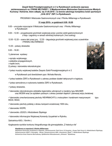 Zespół Szkół Ponadgimnazjalnych nr 2 w Rydułtowach serdecznie zaprasza zainteresowanych na I PIKNIK MILITARNY i II Międzynarodowe Mistrzostwa Gastronomiczne Młodych Kucharzy i Kelnerów, które odbędą się 31.05.2016 r. na terenie szkolnego kompleksu boisk sportowych „Orlik 2012” ZSP 2 w Rydułtowach. PROGRAM II Mistrzostw Gastronomicznych oraz I Pikniku Militarnego w Rydułtowach: 31 maja 2016 r. w godzinach 9.00 -16.00 9.00 – uroczyste rozpoczęcie II Mistrzostw Gastronomicznych oraz I Pikniku Militarnego w Rydułtowach 9.00 – 12.00 – przygotowanie grochówki wojskowej przez uczniów szkół gastronomicznych z kraju i zagranicy w ramach eliminacji kulinarnych ( live cooking) 12.00 -12.20 – ocena dań przez jury , 12.30 – degustacja grochówki wojskowej przez uczestników I PIKNIKU MILITARNEGO 13.30 – pokazy strażackie 9.00 – 16.00 : 1) plenerowe wystawy: sprzętu wojskowego, plakatów propagandowych, repliki broni, 2) pokazy i stanowiska rekonstrukcyjne: pokaz musztry wojskowej kadetów Zespołu Szkół Ponadgimnazjalnych nr 2 w Rydułtowach pod dowództwem ppor. Michała Marcola, pokaz kadetów ZSP2 w Rydułtowach z zakresu podstaw działań taktycznych w logistyce, pokaz samoobrony w wykonaniu kadetów ZSP2 w Rydułtowach, pokazy strażackie, stanowisko rekonstrukcyjne oddziałów legionistów uzbrojonych w karabiny typu MAUSER oraz MOSIN wraz ze szpitalem polowym z okresu powstań śląskich i pierwszej wojny światowej stanowisko zmechanizowanej piechoty WEHRMACHTU z motocyklem i karabinami maszynowymi MG34, MG42, typu stanowisko piechoty polskiej z okresu kampanii wrześniowej 1939 roku, stanowisko WOPR, stanowisko JS2023 z Wodzisławia Śląskiego stanowisko informacyjne Wojskowej Komendy Uzupełnień w Rybniku. 3)strzelnica ASG ( 15m/4m ) 4)ogłoszenie wyników konkursu fotograficznego dla gimnazjalistów „Z historią w tle” Współpraca w organizacji I Pikniku Militarnego: Wojskowa Komenda Uzupełnień w Rybniku, Stowarzyszenie Task Force 13 Scorpion, ,Grupa Task Force 6 z Wodzisławia Śląskiego, Stowarzyszenie GROT z Jastrzębia - Zdroju ,Stowarzyszenie GRH „Powstaniec Śląski” z Wodzisławia Śląskiego Ochotnicza Straż Pożarna Biertułtowy, Spółdzielnia Mieszkaniowa „Orłowiec” Rydułtowy.