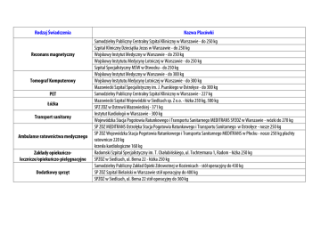 Rodzaj Świadczenia Rezonans magnetyczny Tomograf Komputerowy PET Łóżka Transport sanitarny Ambulanse ratownictwa medycznego Zakłady opiekuńczolecznicze/opiekuńczo-pielęgnacyjne Dodatkowy sprzęt Nazwa Placówki Samodzielny Publiczny Centralny Szpital Kliniczny w Warszawie - do 250 kg Szpital Kliniczny Dzieciątka Jezus w Warszawie - do 250 kg Wojskowy Instytut Medyczny w Warszawie - do 250 kg Wojskowy Instytutu Medycyny Lotniczej w Warszawie - do 250 kg Szpital Specjalistyczny MSW w Otwocku - do 250 kg Wojskowy Instytut Medyczny w Warszawie - do 300 kg Wojskowy Instytutu Medycyny Lotniczej w Warszawie - do 300 kg Mazowiecki Szpital Specjalistyczny im. J. Psarskiego w Ostrołęce - do 300 kg Samodzielny Publiczny Centralny Szpital Kliniczny w Warszawie - 227 kg Mazowiecki Szpital Wojewódzki w Siedlcach sp. Z o.o. - łóżka 250 kg, 500 kg SPZ ZOZ w Ostrowii Mazowieckiej - 371 kg Instytut Kardiologii w Warszawie - 300 kg Wojewódzka Stacja Pogotowia Ratunkowego i Transportu Sanitarnego MEDITRANS SPZOZ w Warszawie - wózki do 270 kg SP ZOZ MEDITRANS Ostrołęka Stacja Pogotowia Ratunkowego i Transportu Sanitarnego w Ostrołęce - nosze 250 kg SP ZOZ Wojewódzka Stacja Pogotowia Ratunkowego i Transportu Sanitarnego MEDITRANS w Płocku - nosze 250 kg płachty ratownicze 220 kg krzesła kardiologiczne 160 kg Radomski Szpital Specjalistyczny im. T. Chałubińskiego, ul. Tochtermana 1, Radom - łóżka 250 kg SPZOZ w Siedlcach, ul. Bema 22 - łóżka 250 kg Samodzielny Publiczny Zakład Opieki Zdrowotnej w Kozienicach - stół operacyjny do 430 kg SP ZOZ Szpital Bielański w Warszawie stół operacyjny do 400 kg SPZOZ w Siedlcach, ul. Bema 22 stół operacyjny do 360 kg