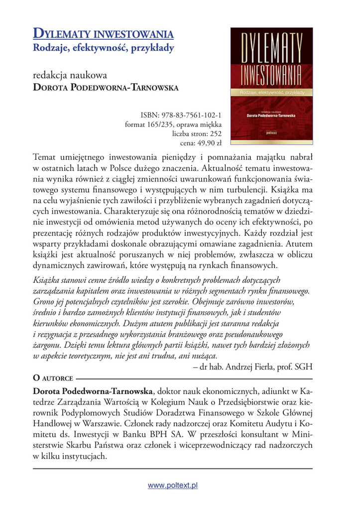 Dylematy inwestowania Rodzaje, efektywność, przykłady redakcja naukowa Dorota Podedworna-Tarnowska ISBN: 978-83-7561-102-1 format 165/235, oprawa miękka liczba stron: 252 cena: 49,90 zł Temat umiejętnego inwestowania pieniędzy i pomnażania majątku nabrał w ostatnich latach w Polsce dużego znaczenia. Aktualność tematu inwestowania wynika również z ciągłej zmienności uwarunkowań funkcjonowania światowego systemu finansowego i występujących w nim turbulencji. Książka ma na celu wyjaśnienie tych zawiłości i przybliżenie wybranych zagadnień dotyczących inwestowania. Charakteryzuje się ona różnorodnością tematów w dziedzinie inwestycji od omówienia metod używanych do oceny ich efektywności, po prezentację różnych rodzajów produktów inwestycyjnych. Każdy rozdział jest wsparty przykładami doskonale obrazującymi omawiane zagadnienia. Atutem książki jest aktualność poruszanych w niej problemów, zwłaszcza w obliczu dynamicznych zawirowań, które występują na rynkach finansowych. Książka stanowi cenne źródło wiedzy o konkretnych problemach dotyczących zarządzania kapitałem oraz inwestowania w różnych segmentach rynku finansowego. Grono jej potencjalnych czytelników jest szerokie. Obejmuje zarówno inwestorów, średnio i bardzo zamożnych klientów instytucji finansowych, jak i studentów kierunków ekonomicznych. Dużym atutem publikacji jest staranna redakcja i rezygnacja z przesadnego wykorzystania branżowego oraz pseudonaukowego żargonu. Dzięki temu lektura głównych partii książki, nawet tych bardziej złożonych w aspekcie teoretycznym, nie jest ani trudna, ani nużąca. – dr hab. Andrzej Fierla, prof. SGH O autorce Dorota Podedworna-Tarnowska, doktor nauk ekonomicznych, adiunkt w Katedrze Zarządzania Wartością w Kolegium Nauk o Przedsiębiorstwie oraz kierownik Podyplomowych Studiów Doradztwa Finansowego w Szkole Głównej Handlowej w Warszawie. Członek rady nadzorczej oraz Komitetu Audytu i Komitetu ds. Inwestycji w Banku BPH SA. W przeszłości konsultant w Ministerstwie Skarbu Państwa oraz członek i wiceprzewodniczący rad nadzorczych w kilku instytucjach. www.poltext.pl Dylematy inwestowania Spis treści Wprowadzenie . . . . . . . . . . . . . . . . . . . . . . . . . . . . . . . . . . . . . . . . . . . . . . . . . . . . . . . . . . . . . . . . . . . . . . . . . . . . 11 Rozdział 1 Stan i perspektywy rozwoju private banking w Polsce (Katarzyna Smolińska-Twardokęs, Piotr Twardokęs) . . . . . . . . . . . . . . . . . . . . . . . . . . . . . . . . 15 Wstęp . . . . . . . . . . . . . . . . . . . . . . . . . . . . . . . . . . . . . . . . . . . . . . . . . . . . . . . . . . . . . . . . . . . . . . . . . . . . . . . . . . . . . . . . 1.1. Istota usług private banking i ich rola we współczesnym świecie . . . . . . . . . . . 1.2. Klienci i rynek private banking na świecie . . . . . . . . . . . . . . . . . . . . . . . . . . . . . . . . . . . . . 1.3. Klienci i rynek private banking w Polsce . . . . . . . . . . . . . . . . . . . . . . . . . . . . . . . . . . . . . . . . 1.4. Oferta produktów i usług dla klientów private banking . . . . . . . . . . . . . . . . . . . . . . 1.5. Oferta pivate banking na przykładzie BRE Private Banking & Wealth Management . . . . . . . . . . . . . . . . . . . . . . . . . . . . . . . . . . . . . . . . . . . . . . . . . . . . . . . . . . . . . . . . . . . . . . . . . . 1.6. Determinanty rozwoju rynku private banking w Polsce . . . . . . . . . . . . . . . . . . . . . Zakończenie . . . . . . . . . . . . . . . . . . . . . . . . . . . . . . . . . . . . . . . . . . . . . . . . . . . . . . . . . . . . . . . . . . . . . . . . . . . . . . . . Bibliografia . . . . . . . . . . . . . . . . . . . . . . . . . . . . . . . . . . . . . . . . . . . . . . . . . . . . . . . . . . . . . . . . . . . . . . . . . . . . . . . . . 15 16 20 23 29 33 38 42 43 Rozdział 2 Efektywność inwestycji w oferty prywatyzacyjne spółek Skarbu Państwa na Giełdzie Papierów Wartościowych w Warszawie (Łukasz Maślej) . . . . . . . . 45 Wstęp . . . . . . . . . . . . . . . . . . . . . . . . . . . . . . . . . . . . . . . . . . . . . . . . . . . . . . . . . . . . . . . . . . . . . . . . . . . . . . . . . . . . . . . . 2.1. Prywatyzacje spółek Skarbu Państwa w Polsce . . . . . . . . . . . . . . . . . . . . . . . . . . . . . . . . . 2.1.1. Pojęcie i formy prywatyzacji przedsiębiorstw państwowych . . . . . . . . 2.1.2. Dynamika procesu prywatyzacji w Polsce po 1989 r. . . . . . . . . . . . . . . . . . 2.1.3. Prywatyzacje spółek Skarbu Państwa w drodze pierwszej oferty publicznej . . . . . . . . . . . . . . . . . . . . . . . . . . . . . . . . . . . . . . . . . . . . . . . . . . . . . . . . . . . . . . . . . . . . . . www.poltext.pl 45 46 46 49 52 Dylematy inwestowania 6 Dylematy inwestowania 2.2. Stopy zwrotu z inwestycji w wybrane oferty publiczne spółek Skarbu Państwa na GPW w latach 1997–2010 . . . . . . . . . . . . . . . . . . . . . . . . . . . . . . . . . 2.2.1. Charakterystyka metody badawczej . . . . . . . . . . . . . . . . . . . . . . . . . . . . . . . . . . . . . . 2.2.2. Podstawowe informacje o badanych ofertach prywatyzacyjnych spółek Skarbu Państwa . . . . . . . . . . . . . . . . . . . . . . . . . . . . . . . . . . . . . . . . . . . . . . . . . . . . . . 2.2.3. Badanie stóp zwrotu z IPO spółek Skarbu Państwa . . . . . . . . . . . . . . . . . . . . Zakończenie . . . . . . . . . . . . . . . . . . . . . . . . . . . . . . . . . . . . . . . . . . . . . . . . . . . . . . . . . . . . . . . . . . . . . . . . . . . . . . . . Bibliografia . . . . . . . . . . . . . . . . . . . . . . . . . . . . . . . . . . . . . . . . . . . . . . . . . . . . . . . . . . . . . . . . . . . . . . . . . . . . . . . . . 54 54 56 58 64 64 Rozdział 3 Analiza efektywności i rentowności funduszy inwestycyjnych w Polsce (na przykładzie KBC TFI) (Łukasz Babiarz) . . . . . . . . . . . . . . . . . . . . . . . . . . . . . 