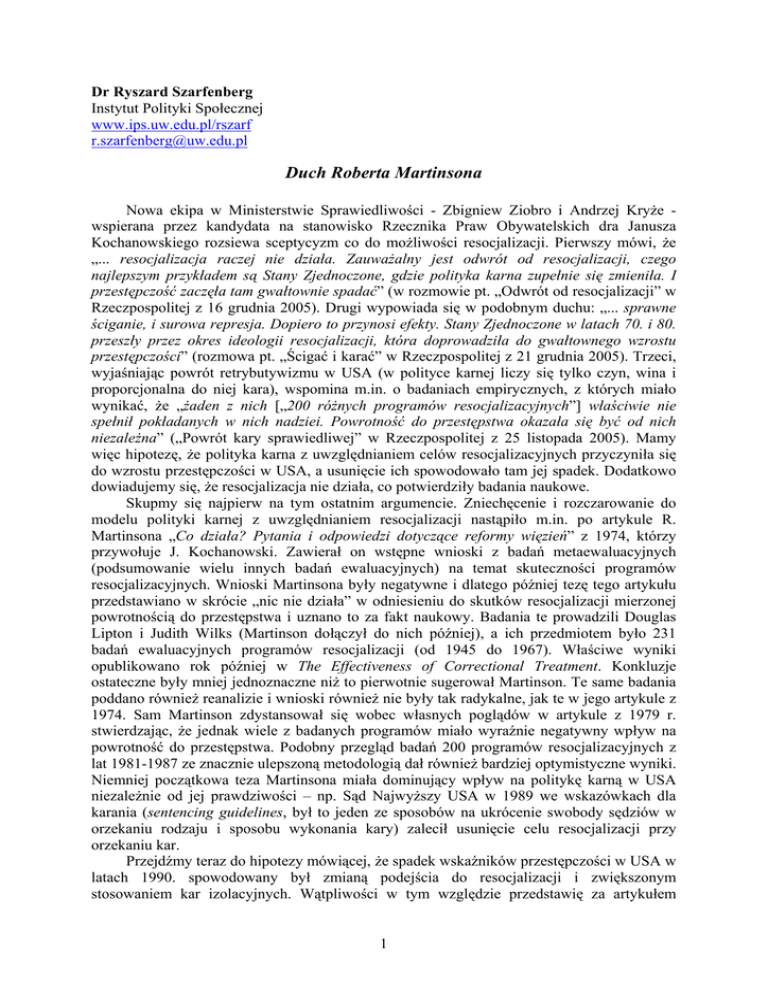 Dr Ryszard Szarfenberg Instytut Polityki Społecznej www.ips.uw.edu.pl/rszarf [email protected] Duch Roberta Martinsona Nowa ekipa w Ministerstwie Sprawiedliwości - Zbigniew Ziobro i Andrzej Kryże wspierana przez kandydata na stanowisko Rzecznika Praw Obywatelskich dra Janusza Kochanowskiego rozsiewa sceptycyzm co do możliwości resocjalizacji. Pierwszy mówi, że „... resocjalizacja raczej nie działa. Zauważalny jest odwrót od resocjalizacji, czego najlepszym przykładem są Stany Zjednoczone, gdzie polityka karna zupełnie się zmieniła. I przestępczość zaczęła tam gwałtownie spadać” (w rozmowie pt. „Odwrót od resocjalizacji” w Rzeczpospolitej z 16 grudnia 2005). Drugi wypowiada się w podobnym duchu: „... sprawne ściganie, i surowa represja. Dopiero to przynosi efekty. Stany Zjednoczone w latach 70. i 80. przeszły przez okres ideologii resocjalizacji, która doprowadziła do gwałtownego wzrostu przestępczości” (rozmowa pt. „Ścigać i karać” w Rzeczpospolitej z 21 grudnia 2005). Trzeci, wyjaśniając powrót retrybutywizmu w USA (w polityce karnej liczy się tylko czyn, wina i proporcjonalna do niej kara), wspomina m.in. o badaniach empirycznych, z których miało wynikać, że „żaden z nich [„200 różnych programów resocjalizacyjnych”] właściwie nie spełnił pokładanych w nich nadziei. Powrotność do przestępstwa okazała się być od nich niezależna” („Powrót kary sprawiedliwej” w Rzeczpospolitej z 25 listopada 2005). Mamy więc hipotezę, że polityka karna z uwzględnianiem celów resocjalizacyjnych przyczyniła się do wzrostu przestępczości w USA, a usunięcie ich spowodowało tam jej spadek. Dodatkowo dowiadujemy się, że resocjalizacja nie działa, co potwierdziły badania naukowe. Skupmy się najpierw na tym ostatnim argumencie. Zniechęcenie i rozczarowanie do modelu polityki karnej z uwzględnianiem resocjalizacji nastąpiło m.in. po artykule R. Martinsona „Co działa? Pytania i odpowiedzi dotyczące reformy więzień” z 1974, którzy przywołuje J. Kochanowski. Zawierał on wstępne wnioski z badań metaewaluacyjnych (podsumowanie wielu innych badań ewaluacyjnych) na temat skuteczności programów resocjalizacyjnych. Wnioski Martinsona były negatywne i dlatego później tezę tego artykułu przedstawiano w skrócie „nic nie działa” w odniesieniu do skutków resocjalizacji mierzonej powrotnością do przestępstwa i uznano to za fakt naukowy. Badania te prowadzili Douglas Lipton i Judith Wilks (Martinson dołączył do nich później), a ich przedmiotem było 231 badań ewaluacyjnych programów resocjalizacji (od 1945 do 1967). Właściwe wyniki opublikowano rok później w The Effectiveness of Correctional Treatment. Konkluzje ostateczne były mniej jednoznaczne niż to pierwotnie sugerował Martinson. Te same badania poddano również reanalizie i wnioski również nie były tak radykalne, jak te w jego artykule z 1974. Sam Martinson zdystansował się wobec własnych poglądów w artykule z 1979 r. stwierdzając, że jednak wiele z badanych programów miało wyraźnie negatywny wpływ na powrotność do przestępstwa. Podobny przegląd badań 200 programów resocjalizacyjnych z lat 1981-1987 ze znacznie ulepszoną metodologią dał również bardziej optymistyczne wyniki. Niemniej początkowa teza Martinsona miała dominujący wpływ na politykę karną w USA niezależnie od jej prawdziwości – np. Sąd Najwyższy USA w 1989 we wskazówkach dla karania (sentencing guidelines, był to jeden ze sposobów na ukrócenie swobody sędziów w orzekaniu rodzaju i sposobu wykonania kary) zalecił usunięcie celu resocjalizacji przy orzekaniu kar. Przejdźmy teraz do hipotezy mówiącej, że spadek wskaźników przestępczości w USA w latach 1990. spowodowany był zmianą podejścia do resocjalizacji i zwiększonym stosowaniem kar izolacyjnych. Wątpliwości w tym względzie przedstawię za artykułem 1 Marc’a Ouimeta „Explaining the American and Canadian Crime Drop in the 1990’s.” (2004). Należy pamiętać, że wyjaśnianie za pomocą tylko jednego czynnika wieloletnich zmian trendów jest niezbyt rozsądne. W przypadku spadku przestępczości w USA są jeszcze co najmniej cztery sposoby wyjaśniania tego fenomenu – demograficzne (udział ludzi młodych w populacji), ekonomiczne (poprawa sytuacji gospodarczej i perspektyw na zatrudnienie), związane ze zmianami w działaniu policji oraz ze zmianami w świadomości społecznej i w dominujących wartościach. Spadek przestępczości w tym samym czasie w Kanadzie był podobny, ale przy jednoczesnym niewielkim spadku wskaźników liczby więźniów na 100 tys. mieszkańców oraz braku zmian w działalności policji. W USA ten wskaźnik wzrósł o 43% w okresie 1991-1999, a w Kanadzie zmniejszył się o 6%. Z kolei w obu krajach nastąpił wyraźny i podobny spadek udziału ludzi w wieku 20-34 w populacji o 18% w latach 19901999. W obu krajach w latach 1990. zmniejszyło się też wyraźnie bezrobocie i poprawiła sytuacja gospodarcza. Lata 1960. i 1970. były okresem rewolucji kulturowej z akcentowaniem wolności jednostki, wyzwolenia ludzi młodych, swobody seksualnej i eksperymentów z różnymi stylami życia. Ten właśnie czynnik mógł również odpowiadać zarówno za wzrost przestępczości, jak i za bardziej permisywną politykę karną. Konkludując, badania naukowe nie potwierdzają tezy, że resocjalizacja nie działa, nie potwierdzają też tego, aby głównym czynnikiem decydującym o spadku przestępczości w USA w latach 1990. była polityka, w której zrezygnowano z resocjalizacji. W praktyce wcale z niej nie zrezygnowano, gdyż różnego rodzaju programy edukacyjne prowadziło w 2000 r. 100% więzień federalnych, 91% stanowych i 88% prywatnych. Wskaźniki te od 1995 wzrosły w przypadku więzień stanowych i prywatnych. To z czego zrezygnowano, to branie pod uwagę perspektyw resocjalizacji przy orzekaniu kary. Negatywnym skutk