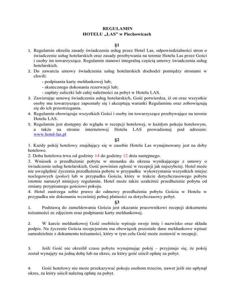 REGULAMIN HOTELU „LAS” w Piechowicach §1 1. Regulamin określa zasady świadczenia usług przez Hotel Las, odpowiedzialności stron o świadczenie usług hotelarskich oraz zasady przebywania na terenie Hotelu Las przez Gości i osoby im towarzyszące. Regulamin stanowi integralną częścią umowy świadczenia usług hotelarskich. 2. Do zawarcia umowy świadczenia usług hotelarskich dochodzi pomiędzy stronami w chwili: - podpisania karty meldunkowej lub; - skutecznego dokonania rezerwacji lub; - zapłaty zaliczki lub całej należności za pobyt w Hotelu LAS. 3. Zawierając umowę świadczenia usług hotelarskich, Gość potwierdza, iż on oraz wszystkie osoby mu towarzyszące zapoznały się i akceptują warunki Regulaminu oraz zobowiązują się do ich przestrzegania. 4. Regulamin obowiązuje wszystkich Gości i osoby im towarzyszące przebywające na terenie Hotelu LAS. 5. Regulamin jest dostępny do wglądu w recepcji hotelowej, w każdym pokoju hotelowym, a także na stronie internetowej Hotelu LAS prowadzonej pod adresem: www.hotel-las.pl §2 1. Każdy pokój hotelowy znajdujący się w zasobie Hotelu Las wynajmowany jest na doby hotelowe. 2. Doba hotelowa trwa od godziny 14 do godziny 12 dnia następnego. 3. Wniosek o przedłużenie pobytu w stosunku do okresu wynikającego z umowy o świadczenie usług hotelarskich, Gość powinien zgłosić w recepcji jak najszybciej. Hotel może nie uwzględnić życzenia przedłużenia pobytu w przypadku wykorzystania wszystkich miejsc noclegowych (pokoi) lub w przypadku Gościa, który w trakcie dotychczasowego pobytu istotnie naruszył niniejszy regulamin. Hotel może także uzależnić przedłużenie pobytu od zmiany przypisanego gościowi pokoju. 4. Hotel zastrzega sobie prawo do odmowy przedłużenia pobytu Gościa w Hotelu w przypadku nie dokonania wcześniej pełnej płatności za dotychczasowy pobyt. §3 1. Podstawą do zameldowania Gościa jest okazanie pracownikowi recepcji dokumentu tożsamości ze zdjęciem oraz podpisanie karty meldunkowej. W karcie meldunkowej Gość osobiście wpisuje swoje imię i nazwisko oraz składa podpis. Na życzenie Gościa recepcjonista ma obowiązek pozostałe dane meldunkowe wpisać samodzielnie z dokumentu tożsamości, który w tym celu Gość może zostawić w recepcji. 2. Jeśli Gość nie określił czasu pobytu wynajmując pokój – przyjmuje się, że pokój został wynajęty na jedną dobę lub na okres, za który gość uiścił opłatę za pobyt. 3. Gość hotelowy nie może przekazywać pokoju osobom trzecim, nawet jeśli nie upłynął okres, za który uiścił należną opłatę za pobyt. 4. Osoby niezameldowane w Hotelu mogą gościnnie przebywać w pokoju hotelowym od godziny 7:00 do godziny 23:00. 5. Hotel może odmówić przyjęcia Gościa, który podczas poprzedniego pobytu, w okresie ostatnich pięciu lat, istotnie naruszył niniejszy regulamin, a w szczególności wyrządził szkodę w hotelu lub mieniu innych Gości, jak również spowodował szkodę na osobie Gościa, pracowników Hotelu lub innych osobach przebywających w Hotelu lub popełnił na terenie Hotelu czyn zabroniony. 6. W przypadku nieodwołania rezerwacji lub w przypadku niedotarcia Gościa w zaplanowanym terminie do Hotelu, zaliczka lub opłata za pobyt nie zostaje zwrócona. 7. W przypadku rezygnacji Gościa z pobytu w trakcie trwania doby hotelowej, Hotel nie zwraca opłaty za doby z których goście zrezygnowali 8. §4 1. Hotel świadczy usługi hotelarskie zgodnie ze swoją kategorią i standardem. 2. Hotel obowiązuje się zapewnić Gościom: - warunki do pełnego i nieskrępowanego wypoczynku, - sprzątanie pokoju i wykonywanie niezbędnych napraw urządzeń podczas nieobecności Gościa – w terminach i sposobie określonym kategorią Hotelu - a w jego obecności tylko wówczas, gdy wyrazi na to zgodę. - bezpieczeństwo pobytu, w tym bezpieczeństwo zachowania w tajemnicy informacji o Gościu i osobach mu towarzyszących, - profesjonalną obsługę w zakresie wszystkich usług świadczonych w Hotelu Las, 3. Śniadanie i obiadokolacje są spożywane w wyznaczonych miejscach i ustalonych godzinach -śniadania 7.00- 10.00 -obiadokolacja 17.00-19.00 4. W hotelu obowiązuje zakaz wynoszenia posiłków z miejsc wyznaczonych do ich spożywania . 5. Gość zobowiązuje się do: - przestrzegania niniejszego regulaminu i innych przepisów porządkowych obowiązujących na terenie Hotelu; - wyłączania urządzenia elektryczne, zgaszenia światła, zakręcenia kranów oraz zamknięcia okien oraz zamknięcia drzwi na klucz lub kartę magnetyczną – przy każdym opuszczeniu pokoju; - nie dokonywania jakichkolwiek zmian w pokojach hotelowych i ich wyposażeniu, poza nieznacznym przestawianiem mebli i wyposażenia, nie naruszającym ich funkcjonalność i bezpieczeństwa korzystania. - szanowania prawo innych Gości Hotelu do spokojnego wypoczynku, a w szczególności do unikania nadmiernie głośnego zachowania; - nie prowadzenia na terenie Hotelu akwizycji i sprzedaży obnośnej. - nie przechowywania na terenie Hotelu ładunków niebezpiecznych – broni i amunicji, materiałów łatwopalnych, wybuchowych oraz takich, których posiadanie jest zabronione przez polskie prawo. 6. W Hotelu obowiązuje cisza nocna od godziny 22:00 do godziny 7:00 rano. W godzinach ciszy nocnej Goście i osoby im towarzyszące mają obowiązek takiego zachowania, by w żaden sposób nie zakłócało ono spokoju pobytu innych osób. Dopuszczalne są odstępstwa od zachowania ciszy nocnej –w przypadku organizowania przez hotel imprez okolicznościowych tzn. wesela, bakiety, imprezy plenerowe , o czym będą poinformowani goście hotelowi w dniu imprezy w formie ogłoszenia na tablicy informacyjnej 7. Na terenie Hotelu, w tym - w pokojach hotelowych, zgodnie z ustawą z dnia 8 kwietnia 2010 roku o zmianie ustawy o ochronie zdrowia przed następstwami używania tytoniu i wyrobów tytoniowych oraz ustawy o Państwowej Inspekcji Sanita