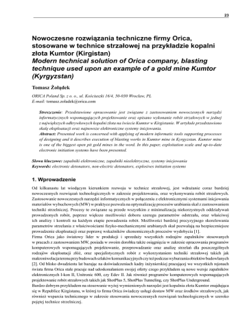 Nowoczesne rozwiązania techniczne firmy Orica, stosowane w technice strzałowej... 23 Nowoczesne rozwiązania techniczne firmy Orica, stosowane w technice strzałowej na przykładzie kopalni złota Kumtor (Kirgistan) Modern technical solution of Orica company, blasting technique used upon an example of a gold mine Kumtor (Kyrgyzstan) Tomasz Żołądek ORICA Poland Sp. z o. o., ul. Kościuszki 16/4, 50-030 Wrocław, PL E-mail: [email protected] Streszczenie: Przedstawione opracowanie jest związane z zastosowaniem nowoczesnych narzędzi informatycznych wspomagających projektowanie oraz opisano wykonanie robót strzałowych w jednej z największych odkrywkowych kopalni złota na świecie Kumtor w Kirgistanie. W artykule przedstawiono skalę eksploatacji oraz najnowsze elektroniczne systemy inicjowania. Abstract: Presented work is concerned with applying of modern informatic tools supporting processes of designing and it describes execution of blasting works in Kumtor mine in Kyrgyzstan. Kumtor mine is one of the biggest open pit gold mines in the word. In this paper, exploitation scale and up-to-date electronic initiation systems have been presented. Słowa kluczowe: zapalniki elektroniczne, zapalniki nieelektryczne, systemy inicjowania Keywords: electronic detonators, non-electric detonators, explosives initiation systems 1. Wprowadzenie Od kilkunastu lat wiodącym kierunkiem rozwoju w technice strzałowej, jest wdrażanie coraz bardziej nowoczesnych rozwiązań technologicznych w zakresie projektowania, oraz wykonywania robót strzałowych. Zastosowanie nowoczesnych narzędzi informatycznych w połączeniu z elektronicznymi systemami inicjowania materiałów wybuchowych (MW) w praktyce pozwala na optymalizację procesów urabiania skał z zastosowaniem techniki strzelniczej. Procesy te związane są przede wszystkim z minimalizacją niekorzystnych oddziaływań prowadzonych robót, poprzez większe możliwości doboru szeregu parametrów odstrzału, oraz właściwej ich analizy i kontroli na każdym etapie powadzenia robót. Możliwości bardziej precyzyjnego skorelowania parametrów strzelania z właściwościami fizyko-mechanicznymi urabianych skał pozwalają na bezpieczniejsze prowadzenie eksploatacji oraz poprawę wskaźników ekonomicznych procesów wydobycia [1]. Firma Orica jako światowy lider w produkcji i sprzedaży wszystkich rodzajów zapalników stosowanych w pracach z zastosowaniem MW, posiada w swoim dorobku także osiągnięcia w zakresie opracowania programów komputerowych wspomagających projektowanie, przeprowadzanie oraz analizę strzelań dla poszczególnych rodzajów eksploatacji złóż, oraz specjalistycznych robót z wykorzystaniem techniki strzałowej takich jak makroniwelacja terenu przy budowach szlaków komunikacyjnych czy też podczas wyburzania obiektów budowlanych [2]. Od blisko dwudziestu lat bazując na doświadczeniach kadry inżynierskiej pracującej we wszystkich rejonach świata firma Orica stale pracuje nad udoskonalaniem swojej oferty czego przykładem są nowe wersje zapalników elektronicznych I-kon II, Unitronic 600, czy Edev II. Jak również programów komputerowych wspomagających projektowanie robót strzałowych takich jak ShotPlus 5, ShotPlus Tunneling, czy ShotPlus Underground. Bardzo dobrym przykładem na stosowanie wyżej wymienionych narzędzi jest kopalnia złota Kumtor znajdująca się w Republice Kirgistanu, w której to firma Orica świadczy usługi dostaw MW oraz środków strzałowych, jak również wsparcia technicznego w zakresie stosowania nowoczesnych rozwiązań technologicznych w szeroko pojętej technice strzelniczej. 24 T. Żołądek 2. Prezentacja kopalni Kumtor Kopalnia złota „Kumtor Gold Mine” znajduje się w Azji Środkowej w Republice Kirgistanu, w obwodzie IssykKulskim, w odległości od 350 km na południowy wschód od stolicy Biszkeku i 80 km na południe od jeziora Issyk-Kul i jest własnością kanadyjskiej firmy Centerra Gold. Jest to jedna z najwyżej położonych kopalni świata - leży w górach Tien-Szan na wysokości ponad 4000 m n.p.m. oraz stanowi największą kopalnię złota w Azji Środkowej (rys. 1). Kumtor legitymuje się drugim najlepszym wynikiem wydobycia złota na świecie, po kopalni złota Yanacocha w Peru. Od początku funkcjonowania, czyli od 1997 roku, do końca 2012 roku kopalnia wyprodukowała ponad 8,6 milionów uncji złota, zatrudniając w chwili obecnej blisko 3500 pracowników. O tym jakie znaczenie dla gospodarki Kirgistanu ma omawiane przedsięwzięcie świadczy fakt, że działalność kopalni to 10% PKB, oraz 46% całej produkcji przemysłowej kraju. Rys. 1. Kopalnia złota Kumtor 2.1. Stosowane technologie oraz wielkości wydobycia Eksploatacja prowadzona jest w wyrobisku stokowo-wgłębnym, wielopoziomowym systemem ścianowym z równoległym postępem frontów eksploatacyjnych jednocześnie na kilku poziomach, których wysokość wynosi do 12 m (rys. 2). Masy skalne urabiane są poprzez zastosowanie robót wiertniczo-strzałowych. Nadkład usuwany jest przez koparki przedsiębierne i następnie wywożony jest na zwałowisko zewnętrzne transportem kołowym, pojazdami technologicznymi CAT 789C i D, o pojemności skrzyni ładunkowej 128 ton. Otrzymana złotonośna ruda przewożona jest do zakładu kruszenia wstępnego, skąd trafia przenośnikiem taśmowym na młyny i po odpowiednim rozdrobnieniu do huty, gdzie poddawana jest procesowi flotacji. Rys. 2. Transport urobku z wyrobiska Nowoczesne rozwiązania techniczne firmy Orica, stosowane w technice strzałowej... 25 W procesie eksploatacji złoża kluczową rolę odgrywa prowadzenie robót strzałowych. Roboty wiertniczostrzałowe stanowią pierwszy etap rozdrabniania i przeróbki kopaliny. Działania te determinują kolejne etapy przeróbki rudy i wpływają na całość procesu eksploatacji złoża. Zatem energia i nakłady poświęcone na tym etapie prac, procentują w dalszym procesie i w skali tak wielkiego pozysk