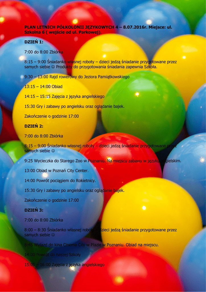 PLAN LETNICH PÓŁKOLONII JĘZYKOWYCH 4 – 8.07.2016r. Miejsce: ul. Szkolna 6 ( wejście od ul. Parkowej). DZIEŃ 1: 7:00 do 8:00 Zbiórka 8:15 – 9:00 Śniadanko własnej roboty – dzieci jedzą śniadanie przygotowane przez samych siebie ☺ Produkty do przygotowania śniadania zapewnia Szkoła. 9:30 – 13:00 Rajd rowerowy do Jeziora Pamiątkowskiego 13:15 – 14:00 Obiad 14:15 – 15:15 Zajęcia z języka angielskiego 15:30 Gry i zabawy po angielsku oraz oglądanie bajek. Zakończenie o godzinie 17:00 DZIEŃ 2: 7:00 do 8:00 Zbiórka 8:15 – 9:00 Śniadanko własnej roboty – dzieci jedzą śniadanie przygotowane przez samych siebie ☺ 9:25 Wycieczka do Starego Zoo w Poznaniu. Na miejscu zabawy w języku angielskim. 13:00 Obiad w Poznań City Center. 14:00 Powrót pociągiem do Rokietnicy. 15:30 Gry i zabawy po angielsku oraz oglądanie bajek. Zakończenie o godzinie 17:00 DZIEŃ 3: 7:00 do 8:00 Zbiórka 8:00 – 8:30 Śniadanko własnej roboty – dzieci jedzą śniadanie przygotowane przez samych siebie ☺ 8:45 Wyjazd do kina Cinema City w Plazie w Poznaniu. Obiad na miejscu. 14:00 Powrót do naszej Szkoły 15:00 – 16:00 Zajęcia z języka angielskiego Gry i zabawy po angielsku oraz oglądanie bajek. Zakończenie o godzinie 17:00 DZIEŃ 4: 7:00 do 8:00 Zbiórka 8:15 – 9:00 Śniadanko własnej roboty – dzieci jedzą śniadanie przygotowane przez samych siebie ☺ 9:30 – 13:00 Wyjście w plener, podchody, zabawy w języku angielskim. 13:15 – 14:00 Obiad 14:15 – 15:15 Zajęcia z języka angielskiego 16:00 Gry i zabawy po angielsku oraz oglądanie bajek. Zakończenie o godzinie 17:00 DZIEŃ 5: 7:00 do 8:00 Zbiórka 8:15 – 9:00 Śniadanko własnej roboty – dzieci jedzą śniadanie przygotowane przez samych siebie ☺ 9:45 Wyjazd na pływalnię OCTOPUS w Suchym Lesie (obiad na miejscu). 14:45 Powrót do Naszej Szkoły 15:30 Gry i zabawy po angielsku oraz oglądanie bajek. Zakończenie o godzinie 17:00 CENA ZAWIERA: przejazdy autobusami, bilety wstępu, obiady oraz drobny poczęstunek, lektorzy i opiekunowie, program, ubezpieczenie CENA NIE ZAWIERA: pieniążków na drobne wydatki Istnieje możliwość, aby dzieci przychodziły na zajęcia później niż, na godz.7.00. W związku z wyjazdami w różne miejsca prosimy jednak, aby dotarły do nas najpóźniej do godz.8.00.