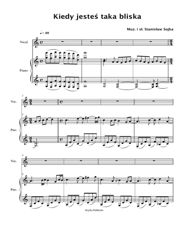 Kiedy jesteś taka bliska »•• Muz. i sł. Stanisław Sojka q &c Vocal ! œ œ œ œ œ œ œ œ w œ œ œ œ œ œ œ œ w &c Piano 5 Voc. 5 Pno. 9 Voc. 9 3 &4 ! c & 43 ˙ . ˙. c œ œœœ ˙ ˙ ! ! 3 4 ! ! œ œ # œ œJ œ . J J Pno. œ ˙ ˙ j œ œœ .. œ œ œ œ œj J J œ œ œ œ œ œ œœ œ œ œ œœœ œœœ œ œ œ œ bœ œ œ œ œ œ œ œ œ œ. œœœ ˙ ˙ œ œ #œ œ œ œ œ œ œ J J œ œ œ. ! & 3 4 ! œœ .. œj œ œ œ œ œ œ œ œ œ 3 œ œ œ 4 ! c œ. & ! &c œ œ œ œ œ œ œ œ w œ œ œ œ œ œ œ œ w 3 œ œ &4 œœœ & œ. ! œ œœ œ œ œ œ œ œ Soyka Editions ! j œ œj œ œ œ œ . œœœ œ œœœ œ œ œ œj J J œ œ œ œ bœ œ œ œ 2 Kiedy jesteś taka bliska ! 13 Voc. & ! œ & œ œœ œ œ œ œ 13 Pno. & ? œ œ œ œ œœ œ œ œ œ Voc. & œ œ #œ. J J ! œ œ œœœ œ œœœ œ œ œœ œ œ œ œœœœœœ œ œœ œ œ œ œ Œ œ œ œJ œ . Ó j œ œ œ œ œ œ œ. ta ka pięk na œ &œ œœœœ œ œ. ? œ œ œ œ œ œœ & œ j œ œ œ œœœ œ œ œ œ œœœ jœ œ œ œ œ œ œ œ bœ œ & œ œ œ. œ œ œ. Œ 21 Voc. œœœœœœœ O to jes teś przy mnie ca -ła 17 Pno. œ œ œœ ˙ Œ œ œ œ œ œ œ œj œ . ! 17 ! ta - ka roz - pa lo na &œ 21 œ r œ œœ œ Pno. & j œ œ j j œ œ œ œ. œ œ œ œ œ œ Œ œ œ œ. œ œ œ œ tań czą na sze po -ca - łun œ œ #œ. J J j œ œ œ œ œ œ œ œ œ Soyka Editions - œ œ œ œ J J J œ œœ œ ki œœœ œœ j œ œ œ j œ œ œ œ j œ œ. 3 Kiedy jesteś taka bliska &Œ 24 Voc. œ œ œ tań czy noc Pno. Voc. œ œ J & œJ œ . & ˙ œ œ œœ œ œ œ œ œ & œ. œ œ Œ & ˙ œ 30 Voc. œ 30 ? œ œ œ œ œ œ œ œ œ œ blis œ œ ˙ œ œ œ œ œ ta -ka œ œ j œ œ œ œ œ œ ka œ œ Œ ˙ œ œ œ œ ta ka œ Œ ˙ œ œ œ œ œ œ œ œ ‰ œœ nie nie ma œ œ œ œ teś œ œœœ świa - ta œ œ œ œ œ ? œ œ Œ kiedy œ œ œ œ œ œ œ œ œ œ œ œ œ œ ‰ ˙ - œ œ - œ œ j j œ œ œ ˙ œ œ jes - teś Pno. œœ œ świa-ta nie ma cza - su nie ma 27 ? r œ œ œ œ œ œ œ œ œ Ó blis ka Pno. œ œ œ kie dy jes œ j œ œ œ œ bœ œ œ œ œ œ 27 Œ i og - nie pło - ną œ œ œ J J & œ. 24 & œ œ œ œ œ œ Soyka Editions œ œ nie ma cza - su nie ˙ œ œ œ œ œ œ œ œ œ œ œ 4 Kiedy jesteś taka bliska & ‰ œJ ˙ Voc. nie nie &˙ ma & & ? œ. ! ? œ œ œ œ. j j œ œ œ œ bœ œ œ j j œ œ #œ j œ ! Œ jj œ œœ œ. œ œ œ œ œ œ œ œ œ œ œ œ œ œ œ œ œ œ j œ œ œ œ œ œ bœ œ œ œ j j œ œ œ ! œ œ œ œ œ œ Nie - bo 40 Pno. œ œ œ œ. ! & & œœœ œ œ œ œ œ 40 Voc. ! œ œ 37 Pno. ! ! 37 Voc. Ó alt saxophone SOLO j j j œ œ #œ œ œ œ œ œ œ œ. œ œ œ œ. œ ? œ œœœœœœ œœœ œ œœ œ œœ œ œœœ œ œ œ œ œ œ œ 33 Pno. œ Œ œ 33 œ. œœœ ˙ œ œ œ œ œœ œ Soyka Editions & ci - cho pod pat - œ œ #œ. J J œ œ œ œ œ œ œ œ 5 Kiedy jesteś taka bliska 43 Voc. & œ œ œ œ œ J œ. ru - - Pno. œ œ œ œ &Œ 46 Voc. je œ œ œ J J œ J œ œ œ œ œ œ J mo - je dło nie od -naj - du œ œ #œ. J J & œ. - - œ. - - œ œ œ œ œ œ œ œ Œ &˙ 49 Voc. &œ 49 œ œ œ œ kie dy jes œ r œ œœ œ œ - œ j œ œ œ Œ Œ œ œ ˙ œ teś Pno. & j œ œ j j œ œ œ j œ ? œ œ œ Soyka Editions ta -ka œ œ œ œ œ œ œ œœœ œ r œ œœ j œ j jœ œ œ œ œ œj œ . j œ œ. j œ œ Œ ny j œ œ œ œ œ œ œ J œ ją œœœœœ - œ j œ Œ Pno. & czy j œ œj œ œ œ œ bœ œ œ œ œ œ œ œ œ œ œ 46 œ. na - sze sło - wa myś - li j œ œ œ œ œ œ œ. & œ. 43 & - œ œ œ œ œ œ Œ Two je dło - nie œ œ œ J J œ J œ œ œ œ bœ œ œ œ œ œ. J ˙ ˙ œ blis ka œ œ œ œ œ œ œ œ œ œ 6 Kiedy jesteś taka bliska & œ œ œ œ œ œ œ œ 52 Voc. świa -ta nie ma cza - su nie ma & ˙ œ 52 Pno. ? œ œ œ & œ œ œ 55 Voc. blis - & ˙ ? œ œ œ & J œ. œ 58 Voc. nie ma œ œ Œ œ œ œ ka 55 Pno. œ œ œ œ ˙ œ œ œ ˙ œ œ ‰ œœ œ œ œ kiedy œ œ œ ˙ œ œ ˙ œ œ œ œ œ œ œ œ œ œ œ œ œ œ œ œ œ œ œ œ œ ! 58 Pno. ˙ nie ! w œœ œ œ œ œ œ œ œ ˙ nie ta ka œ ‰ œ. nie ma cza - su œœ jes - teś œ œ œ œ Œ œ œ œ œ œ œ œ ‰ świa - ta œ Œ nie nie ma œ œ œ œ œœœ & œœ œœ œœ œœ œœ œœ œœ œœ œœœ œœœ œœœ œœœ œœ œœ œœ œœ œ œ œ œ œ œ œ œ œ œ œ œ œœœœœœœœ ? w w w w w w Soyka Editions w w 7 Kiedy jesteś taka bliska ! 62 Voc. & ! ! ! 62 Pno. & œœ œœ œœ œœ œœ œœ œœ œœ œœœ œœœ œœœ œœœ œœ œœ œœ œœ œœœœœœœœ œœœœœœœœ œ œ œ œ œœœœœœœœ ? ! 66 Voc. & w w w w w w w w œ œ œ œ œ œœ œ œ Œ œ J J Œ ! Nie wi dzial ni a nio - ło - wie j j œœ œœ # œœ .. 66 Pno. & œ œ œ œ œœ œœ œœ œœ œœ œœ œœ œœ œ œ œ œ œ œ œ œ œœ .. œ œ œ œ œ. ? œ. w w w w œ œ œ œ œ œ œ ‰ & 70 Voc. strze - gą nam na - sze - go 70 & Pno. œœ .. œ. ? œ. œ. j œœ œ j œ œ j œœ œ j œ œ œ b œœ ... œ. bœ. ra - œ œ œ .. œ œ œ J J œ œ œj œ . - ˙˙ ˙ ˙ ˙ Soyka Editions - ˙ ˙ ‰ œ ju ˙ ˙˙ ˙ ˙ ˙˙ ˙ ˙˙ noc œœ .. œ. œ. ˙ ˙ œ œ J j j œœ œœ # œœ .. œ œ œ .. œ œ œ J J œ wi 8 Kiedy jesteś taka bliska œ œœ œ Œ œ œ œ & Voc. ruje & ˙ ˙ ? ˙ ˙ ˙ ˙ & œJ œ . 77 & Pno. & œ Voc. & œJ œ . jes teś 80 & ˙ Pno. & œ œ œ œ ˙ œ œ œ ta ka œ œ œ œ œ œ œ Œ œ & świa -ta nie ma cza -su nie mam œ œ œ œ œ œ œ 80 w w œ œ œ œ œ œ œ œ œ œœ ˙ w ww w w Ó blis ka kie dy w ww ˙˙ ˙ 77 Voc. Œ ‰ œ œ nie wy mow - nie 73 Pno. Ó w 73 œ œ blis ˙ œ œ œ œ œ œ œ œ œ œ - ka œ œ œ œ œ œ œ œ Soyka Editions œ Œ ˙ œ jes teś œ œ œ œ œ œ œ œ Œ ˙ œ nie nie mam œ œ œ œ œ ‰œœ ta ka œœ œ œ œ ‰ œ œ kie dy œ œ œ œ œ œ œ œ œ œ œ œ 