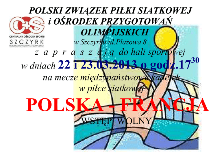 POLSKI ZWIĄZEK PIŁKI SIATKOWEJ i OŚRODEK PRZYGOTOWAŃ OLIMPIJSKICH w Szczyrku ul.PlaŜowa 8 z a p r a s z a j ą do hali sportowej 30 w dniach 22 i 23.03.2013 o godz.17 na mecze międzypaństwowe kadetek w piłce siatkowej POLSKA - FRANCJA WSTĘP WOLNY