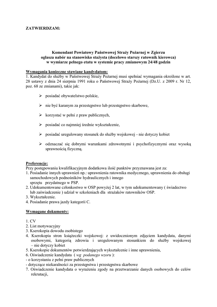 ZATWIERDZAM: Komendant Powiatowy Państwowej Straży Pożarnej w Zgierzu ogłasza nabór na stanowisko stażysta (docelowo starszy ratownik kierowca) w wymiarze pełnego etatu w systemie pracy zmianowym 24/48 godzin Wymagania konieczne stawiane kandydatom: 1. Kandydat do służby w Państwowej Straży Pożarnej musi spełniać wymagania określone w art. 28 ustawy z dnia 24 sierpnia 1991 roku o Państwowej Straży Pożarnej (Dz.U. z 2009 r. Nr 12, poz. 68 ze zmianami), takie jak: posiadać obywatelstwo polskie, nie być karanym za przestępstwo lub przestępstwo skarbowe, korzystać w pełni z praw publicznych, posiadać co najmniej średnie wykształcenie, posiadać uregulowany stosunek do służby wojskowej - nie dotyczy kobiet odznaczać się dobrymi warunkami zdrowotnymi i psychofizycznymi oraz wysoką sprawnością fizyczną. Preferencje: Przy postępowaniu kwalifikacyjnym dodatkowa ilość punktów przyznawana jest za: 1. Posiadanie innych uprawnień np.: uprawnienia ratownika medycznego, uprawnienia do obsługi samochodowych podnośników hydraulicznych i innego sprzętu przydatnego w PSP. 2. Udokumentowane członkostwo w OSP powyżej 2 lat, w tym udokumentowany ( świadectwo lub zaświadczenie ) udział w szkoleniach dla strażaków ratowników OSP. 3. Wykształcenie. 4. Posiadanie prawa jazdy kategorii C. Wymagane dokumenty: 1. CV 2. List motywacyjny 3. Kserokopia dowodu osobistego 4. Kserokopia stron książeczki wojskowej: z uwidocznionym zdjęciem kandydata, danymi osobowymi, kategorią zdrowia i uregulowanym stosunkiem do służby wojskowej – nie dotyczy kobiet 5. Kserokopie dokumentów potwierdzających wykształcenie i inne uprawnienia, 6. Oświadczenie kandydata ( wg podanego wzoru ): - o korzystaniu z pełni praw publicznych - dotyczące niekaralności za przestępstwa i przestępstwa skarbowe 7. Oświadczenie kandydata o wyrażeniu zgody na przetwarzanie danych osobowych do celów rekrutacji, 8. Kserokopia prawa jazdy, 9. Aktualne zaświadczenie lekarskie stwierdzające stan zdrowia umożliwiający przystąpienie do testów sprawności fizycznej i próby wydolnościowej wystawione nie wcześniej niż na jeden miesiąc przed datą jego przeprowadzenia – do okazania w dniu testów sprawnościowych (koszt badań pokrywa zainteresowany) Informacje dodatkowe: 1. Kserokopie złożonych dokumentów zostaną komisyjnie zniszczone miesiąc po zakończeniu postępowania kwalifikacyjnego. 2. Informacje szczegółowe o zasadach naboru i etapach prowadzonego postępowania kwalifikacyjnego do służby w KP PSP w Zgierzu stanowią integralną część ogłoszenia. 3. Osoby zakwalifikowane do dalszych etapów postępowania kwalifikacyjnego o miejscu i terminie kolejnego etapu zostaną poinformowane poprzez ogłoszenie listy w siedzibie KP PSP w Zgierzu ul. Łąkowa 6/8, a także na stronie internetowej pod adresem www.straz.zgierz.pl 4. Kandydat powinien szczegółowo zapoznać się z treścią ogłoszenia oraz szczegółowymi zasadami naboru do służby w KP PSP w Zgierzu w celu uniknięcia błędów formalnych. Nie dołączenie do podania kserokopii dokumentów wymaganych, potwierdzających wymagania konieczne, będzie skutkować wykluczeniem z dalszego postępowania kwalifikacyjnego w I etapie. Zainteresowani proszeni są o składanie lub przesłanie wyżej wymienionych dokumentów w siedzibie Komendy Powiatowej PSP w Zgierzu przy ul. Łąkowej 6/8 (sekretariat) do dnia 14 września 2012 roku (włącznie). Dokumenty, które wpłyną po wskazanym terminie nie będą rozpatrywane, (UWAGA: decyduje data wpływu do sekretariatu Komendy Powiatowej PSP w Zgierzu, nie liczy się data stempla pocztowego). Uwaga: Osoby, które złożyły podanie o pracę lub CV przed datą ukazania się ogłoszenia o naborze, nie będą uwzględniane w niniejszym postępowania kwalifikacyjnym. Szczegółowe zasady przeprowadzenia naboru do służby w KP PSP w Zgierzu Rekrutacja i postępowanie Rekrutację prowadzić będzie Komisja Kwalifikacyjna, która zweryfikuje zgodność złożonych ofert ze stawianymi wymaganiami oraz dokona oceny złożonych dokumentów za pomocą punktów gratyfikacyjnych, a następnie podda kandydatów ocenie sprawności fizycznej i wstępnej rozmowie kwalifikacyjnej. Rekrutacja ma charakter V etapowy I etap postępowania kwalifikacyjnego Weryfikacja zgodności złożonych ofert ze stawianymi wymaganiami koniecznymi oraz przyznanie punktów gratyfikacyjnych na podstawie dołączonych kserokopii dokumentów potwierdzających dodatkowe wymagania. Punktacja gratyfikacyjna za posiadane wykształcenie, uprawnienia, kwalifikacje wykształcenie: - średnie z maturą lub policealne – 3 pkt - wyższe – 5 pkt prawo jazdy kategorii C - 5 pkt posiadanie innych uprawnień np.: uprawnienia ratownika medycznego, uprawnienia do obsługi samochodowych podnośników hydraulicznych i innego przydatnego w PSP – za każde uprawnienie 3 pkt udokumentowane członkostwo w OSP powyżej 2 lat, w tym udokumentowany (świadectwo lub zaświadczenie) udział w szkoleniach dla strażaków ratowników OSP – 3 pkt rozmowa kwalifikacyjna – max 10 pkt Po przeprowadzeniu weryfikacji oraz dokonaniu oceny złożonych ofert w siedzibie komendy oraz na stronie internetowej www.straz.zgierz.pl w dniu 20 września 2012 roku zostanie opublikowana lista osób zakwalifikowanych do oceny sprawności fizycznej. II etap postępowania kwalifikacyjnego Poddanie kandydatów ocenie sprawności fizycznej według kryteriów określonych w Rozporządzeniu Ministra Spraw Wewnętrznych i Administracji z dnia 27 października 2005 roku w sprawie zakresu, trybu i częstotliwości przeprowadzania okresowych profilaktycznych badań lekarskich oraz okresowej oceny sprawności fizycznej strażaka Państwowej Straży Pożarnej (Dz.U. z 2005 r. nr 261, poz.2191) – bez przyznawania punktów preferencyjnych za wiek (wg I grupy wiekowej mężczyzn). Ocena sprawności fizycznej składa się z próby wydolnościowej zmodyfikowaną met