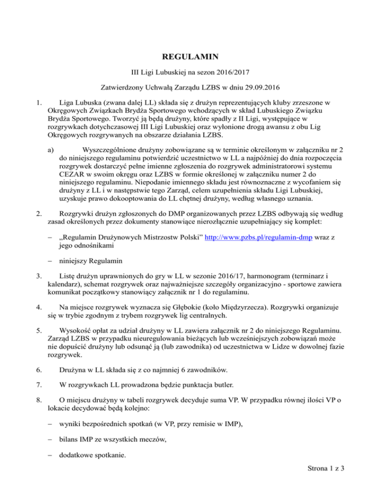 REGULAMIN III Ligi Lubuskiej na sezon 2016/2017 Zatwierdzony Uchwałą Zarządu LZBS w dniu 29.09.2016 1. Liga Lubuska (zwana dalej LL) składa się z drużyn reprezentujących kluby zrzeszone w Okręgowych Związkach Brydża Sportowego wchodzących w skład Lubuskiego Związku Brydża Sportowego. Tworzyć ją będą drużyny, które spadły z II Ligi, występujące w rozgrywkach dotychczasowej III Ligi Lubuskiej oraz wyłonione drogą awansu z obu Lig Okręgowych rozgrywanych na obszarze działania LZBS. a) 2. Wyszczególnione drużyny zobowiązane są w terminie określonym w załączniku nr 2 do niniejszego regulaminu potwierdzić uczestnictwo w LL a najpóźniej do dnia rozpoczęcia rozgrywek dostarczyć pełne imienne zgłoszenia do rozgrywek administratorowi systemu CEZAR w swoim okręgu oraz LZBS w formie określonej w załączniku numer 2 do niniejszego regulaminu. Niepodanie imiennego składu jest równoznaczne z wycofaniem się drużyny z LL i w następstwie tego Zarząd, celem uzupełnienia składu Ligi Lubuskiej, uzyskuje prawo dokooptowania do LL chętnej drużyny, według własnego uznania. Rozgrywki drużyn zgłoszonych do DMP organizowanych przez LZBS odbywają się według zasad określonych przez dokumenty stanowiące nierozłącznie uzupełniający się komplet: „Regulamin Drużynowych Mistrzostw Polski” http://www.pzbs.pl/regulamin-dmp wraz z jego odnośnikami niniejszy Regulamin 3. Listę drużyn uprawnionych do gry w LL w sezonie 2016/17, harmonogram (terminarz i kalendarz), schemat rozgrywek oraz najważniejsze szczegóły organizacyjno - sportowe zawiera komunikat początkowy stanowiący załącznik nr 1 do regulaminu. 4. Na miejsce rozgrywek wyznacza się Głębokie (koło Międzyrzecza). Rozgrywki organizuje się w trybie zgodnym z trybem rozgrywek lig centralnych. 5. Wysokość opłat za udział drużyny w LL zawiera załącznik nr 2 do niniejszego Regulaminu. Zarząd LZBS w przypadku nieuregulowania bieżących lub wcześniejszych zobowiązań może nie dopuścić drużyny lub odsunąć ją (lub zawodnika) od uczestnictwa w Lidze w dowolnej fazie rozgrywek. 6. Drużyna w LL składa się z co najmniej 6 zawodników. 7. W rozgrywkach LL prowadzona będzie punktacja butler. 8. O miejscu drużyny w tabeli rozgrywek decyduje suma VP. W przypadku równej ilości VP o lokacie decydować będą kolejno: wyniki bezpośrednich spotkań (w VP, przy remisie w IMP), bilans IMP ze wszystkich meczów, dodatkowe spotkanie. Strona 1 z 3 9. Pierwsza i Druga drużyna uzyskują tytuły Mistrza i Wicemistrza LL, a Mistrz awans do II Ligi. Wicemistrz walczy w barażach o wejście do II ligii 10. Z LL spada drużyna z miejsca 16 oraz tyle drużyn z miejsc końcowych, ile spadło z II Ligi (o ile drużyny spadkowe przystąpią do rozgrywek w kolejnym sezonie). 11. Za udział w meczach zawodnicy otrzymają punkty klasyfikacyjne zgodnie z odpowiednimi punktami aktualnego Regulaminu Klasyfikacyjnego PZBS oraz Regulaminu DMP. 12. Mecze w każdej kolejnej rundzie należy rozpoczynać zgodnie z ustalonym Harmonogramem. Spóźnienie może skutkować karą w VP według regulaminu zawodów. 13. W przypadku poddania przez drużynę meczu walkowerem przegrywa ona mecz w stosunku 0:15VP. Drużyna wygrywająca walkowerem otrzymuje wynik zgodnie z § 61 RZBS PZBS. W przypadku poddania przez drużynę walkowerem dwóch różnych meczów lub nie rozegrania meczów z ostatniej kolejki drużyna zostaje zdegradowana do Ligi Okręgowej. 14. W wyjątkowych przypadkach losowych usprawiedliwiających w sposób udokumentowany nieobecność drużyny na meczu lub jej spóźnienie organizator (Lubuski Związek Brydża Sportowego) może nakazać rozegranie meczu w innym terminie, zaakceptowanym przez drużynę przeciwną (organizacja i koszty obciążają drużynę, z której winy nie rozegrano meczu w prawidłowym terminie). 15. Zarząd LZBS powołuje skład sędziowski (załącznik nr 3 do Regulaminu Ligi Lubuskiej). Sędzia główny staje się odpowiedzialnym za zgodne z przepisami przeprowadzenie rozgrywek. Po zakończeniu rozgrywek, zgodnie w Regulaminem Klasyfikacyjnym oraz Regulaminem DMP, upoważniony operator CEZARA wprowadza zdobyte przez zawodników drużyn punkty klasyfikacyjne. 16. Za wykroczenia przeciwko Przepisom MPB sędzia ma prawo nakładać kary proceduralne. Szczególne naruszenie harmonogramu i ustaleń rozgrywek pociągnie za sobą automatyczne kary ujęte w Ustaleniach Technicznych Ligi Lubuskiej (załącznik nr 3 do Regulaminu Ligi Lubuskiej). 17. Na wniosek drużyny przeciwnej sędzia odsuwa od gry zawodnika będącego w stanie wskazującym na nadmierne spożycie alkoholu o ile uzna zasadność tego wniosku. 18. Na salach gry obowiązuje bezwzględny zakaz spożywania alkoholu!!! W trakcie meczu w miejscu rozgrywek obowiązuje bezwzględny zakaz palenia i używania telefonów komórkowych. 19. Zarząd LZBS powołuje Komisję Odwoławczą (załącznik nr 4 do Regulaminu Ligi Lubuskiej). Prawo do odwołania się od decyzji sędziowskiej ma każda drużyna, która wpłaci sędziemu głównemu kaucję zwrotną w wysokości 100 zł. W przypadku kiedy odwołanie będzie w sposób rażący nieuzasadnione komisja odwoławcza ma prawo zarządzić przepadek wpłaconej kaucji na rzecz LZBS. 20. Prawo startu w LL mają wyłącznie zawodnicy, którzy do czasu rozpoczęcia meczu zostali zgłoszeni do rozgrywek przez macierzyste kluby. Wystawienie do meczu zawodnika nieuprawnionego powoduje walkower. 21. Jeżeli klub posiadający drużynę w LL posiada również drużynę w niższej lidze, to zawodnik zgłoszony do niższej ligi, który wziął udział w co najmniej jednym zjeździe LL, traci prawo do gry w lidze niższej. Jeżeli klub posiadający drużynę w LL posiada także drużynę w Strona 2 z 3 wyższej klasie rozgrywkowej obowiązują ją postanowienia regulaminu tej klasy dotyczące przejścia zawodników pomiędzy drużynami. Niedopuszczalne jest uczestniczenie zawodnika w ciągu jedne