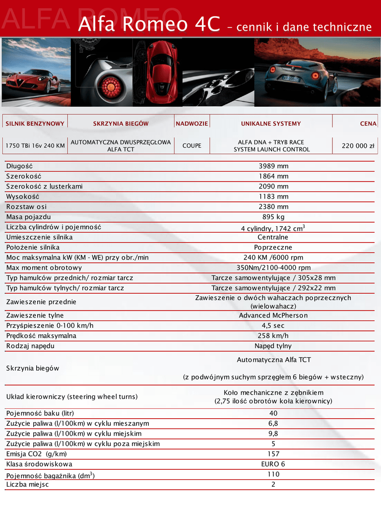 Alfa Romeo 4C – cennik i dane techniczne SILNIK BENZYNOWY SKRZYNIA BIEGÓW NADWOZIE UNIKALNE SYSTEMY 1750 TBi 16v 240 KM AUTOMATYCZNA DWUSPRZĘGŁOWA ALFA TCT COUPE ALFA DNA + TRYB RACE SYSTEM LAUNCH CONTROL Długość 3989 mm Szerokość 1864 mm Szerokość z lusterkami 2090 mm Wysokość 1183 mm Rozstaw osi 2380 mm Masa pojazdu CENA 220 000 zł 895 kg Liczba cylindrów i pojemno ść Umieszczenie silnika Położenie silnika 4 cylindry, 1742 cm3 Centralne Poprzeczne Moc maksymalna kW (KM - WE) przy obr./min Max moment obrotowy 240 KM /6000 rpm 350Nm/2100-4000 rpm Typ hamulców przednich/ rozmiar tarcz Typ hamulców tylnych/ rozmiar tarcz Zawieszenie przednie Zawieszenie tylne Przyśpieszenie 0-100 km/h Prędkość maksymalna Tarcze samowentylujące / 305x28 mm Tarcze samowentylujące / 292x22 mm Zawieszenie o dwóch wahaczach poprzecznych (wielowahacz) Advanced McPherson 4,5 sec 258 km/h Rodzaj napędu Napęd tylny Automatyczna Alfa TCT Skrzynia biegów (z podwójnym suchym sprzęgłem 6 biegów + wsteczny) Układ kierowniczy (steering wheel turns) Koło mechaniczne z zębnikiem (2,75 ilość obrotów koła kierownicy) Pojemność baku (litr) 40 Zużycie paliwa (l/100km) w cyklu mieszanym 6,8 Zużycie paliwa (l/100km) w cyklu miejskim 9,8 Zużycie paliwa (l/100km) w cyklu poza miejskim Emisja CO2 (g/km) 5 157 Klasa środowiskowa EURO 6 3 Pojemność bagażnika (dm ) Liczba miejsc 110 2 Alfa Romeo 4C – standard i opcje płatne LINIA I STYL Kod opcji STANDARD Dolny element tylnego zderzaka z anodowanego metalu XEB ● Kolor trójwarstwowy metalizowany biały 6FW 9 900 zł Kolor trójwarstwowy metalizowany czerwony 5JQ 9 900 zł Koła ze stopów lekkich (rozmiar 205/40 R18 7J przednie i 235/35 R19 8,5J tylne) 421 4 150 zł Koła ze stopów lekkich (rozmiar 205/45 R17 7J przednie i 235/40 R18 8J tylne) 431 ● Koła ze stopów lekkich (rozmiar 205/45 R17 7J przednie i 235/40 R18 8J tylne) 433 3 150 zł Lakier metalizowany Szary 210 3 000 zł Lakier pastelowy Biały 5CA 1 000 zł Lakier pastelowy Czarny 5CB ● Lakier pastelowy Czerwony 74F 1 000 zł Lakierowane zaciski hamulców przednich i tylnych w kolorze czarnym 4SU 1 500 zł Lakierowane zaciski hamulców przednich i tylnych w kolorze czerwonym 4TB 1 500 zł Lakierowane zaciski hamulców przednich i tylnych w kolorze żółtym 4TA 1 500 zł Obudowa lusterek bocznych w kolorze satynowym 4RR 650 zł Obudowa przednich reflektorów pokryta włóknem węglowym 5IF 6 500 zł Opony wyścigowe - Racing tyres 141 6 250 zł Pokrowiec na samochód z logiem Alfa 4C 5WL 1 200 zł Sportowy układ wydechowy 947 2 000 zł Tylny spoiler 923 1 650 zł Zestaw naprawczy do opon 4GD ● KOM FORT/ FUNKCJONALNOŚĆ Akumulator /Battery maintenance 775 Alfa DNA - pozwala na wybór trybu jazdy w zale żności od preferencji kierowcy i warunków drogowych (Race-tryb wyścigowy, Dynamic-tryb sportowy, Normal-tryb ekonomiczny, All Weather-tryb ustawiony na bezpieczeństwo) Czarne welurowe dywaniki igłowe. (Logo 4C) - mocowane do podłogi 1 000 zł ● 5WQ 1 000 zł Dodatkowe gniazdo 12v 823 ● Klimatyzacja manualna 025 Koło kierownicy czarne obszyte skórą 320 0 zł ● Lusterka zewnętrzne sterowane elektrycznie 041 0 zł Maty podłogowe z PCV (mocowane do podłogi) 396 Podnóżek kierowcy 553 Prędkościomierz w kilometrach 050 ● 0 zł ● Regulacja kierownicy na wysokość i głębokość 011 Skórzana torebka 835 Sportowe koło kierownicy obszyte skórą 321 Szyby atermiczne 030 Szyby przednie sterowane elektrycznie 028 Szyby sterowane elektrycznie + elektryczna blokada drzwi 428 Tempomat 416 Torba 4C 5KZ U chwyt na kubek 4B0 Wyświetlacz TFT zawierający informacje dotyczące turbodoładowania, temperatury oleju i przy śpieszenia 4GF ● Zestaw dla palących (zapalniczka + popielniczka) 665 500 zł Zestaw sportowego zawieszenia 377 3 000 zł ABS - system zapobiegający blokowaniu kół 009 Alfa TCT, dwusprzęgłowa automatyczna skrzynia biegów ze sterowaniem w kole kierownicy łopatkami 407 Aluminiowa listwa na desce rozdzielczej 5EN ● ● ● Apteczka pierwszej pomocy 383 Czujniki parkowania tylny 52B Czujnik pomiaru ciśnienia w oponach 365 ● Dodatkowy kluczyk sterowany pilotem 4YV Elektryczny system blokady drzwi 228 ● 950 zł 1 150 zł ● ● ● 2 000 zł 2 000 zł 500 zł BEZPIECZEŃSTWO 250 zł 3 000 zł Gaśnica 912 500 zł ● 650 zł Obudowa licznika pokryta włóknem węglowym XSQ 1 650 zł Poduszka powietrzna kierowcy 500 ● Poduszka powietrzna przednia pasażera 502 Siedzenia skórzane czarne 728 ● 6 250 zł Siedzenia skórzane czerwone 732 6 250 zł 52J 8 300 zł 392 ● Światła przednie wykonane w technologii Bi-LED 74M Trójkat ostrzegawczy 661 5 000 zł ● 5J3 2 500 zł 924 500 zł Siedzenia ze skóry i microfibry z przeszyciami System kontroli trakcji VDC z samoblokującym elektronicznym mechanizmem różnicowym Alfa Q2 System Launch Control - System zapobiegający poślizgowi kół napędowych przy przyspieszaniu Wnętrze dwukolorowe czarno/czerwone (czarno/czerwone skórzane koło kierownicy, uchwyty z czerwonej skóry, czerwone wyko ńczenie tunela środkowowego, czerwony mieszek hamulca ręcznego i uchwytu) Zabezpieczenie samochodu podczas transportu pełne ● SYSTEM Y AUDIO Centralny zamek sterowany z pilota 008 ● Przystosowanie pod instalację radiową 082 0 zł U ltradźwiękowy system anty kradzieżowy i drugi klucz do sterowania z pilotem 388 3 000 zł Zestaw nagłaśniający Alfa hi-fi Sound 718 2 000 zł 7FK 14 000 zł 16 800 zł Radio CD z systemem nawigacji ● PAKIETY Pakiet sportowy Racing Pakiet Lux Legenda: ● - opcja należy do wyposażenia seryjnego 7FL