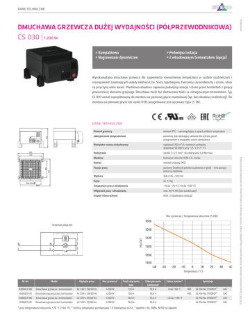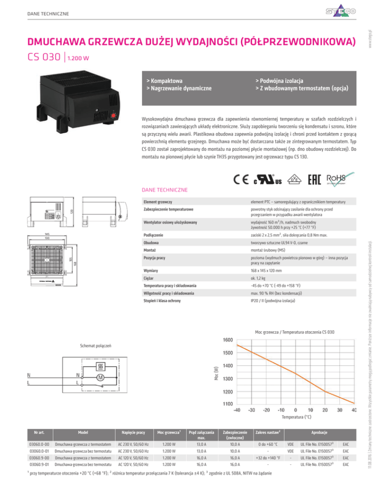32 OGRZEWANIE DANE TECHNICZNE DMUCHAWA GRZEWCZA DUŻEJ WYDAJNOŚCI (PÓŁPRZEWODNIKOWA) CS 030 | 1.200 W >>Kompaktowa >>Nagrzewanie dynamiczne www.stego.pl KATALOG PRODUKTÓW STEGO >>Podwójna izolacja >>Z wbudowanym termostatem (opcja) Wysokowydajna dmuchawa grzewcza dla zapewnienia równomiernej temperatury w szafach rozdzielczych i rozwiązaniach zawierających układy elektroniczne. Służy zapobieganiu tworzeniu się kondensatu i szronu, które są przyczyną wielu awarii. Plastikowa obudowa zapewnia podwójną izolację i chroni przed kontaktem z gorącą powierzchnią elementu grzejnego. Dmuchawa może być dostarczana także ze zintegrowanym termostatem. Typ CS 030 został zaprojektowany do montażu na poziomej płycie montażowej (np. dno obudowy rozdzielczej). Do montażu na pionowej płycie lub szynie TH35 przygotowany jest ogrzewacz typu CS 130. element PTC – samoregulujący z ogranicznikiem temperatury Zabezpieczenie temperaturowe powrotny styk odcinający zasilanie dla ochrony przed przegrzaniem w przypadku awarii wentylatora Wentylator osiowy ułożyskowany wydajność 160 m³/h, nadmuch swobodny żywotność 50.000 h przy +25 °C (+77 °F) Podłączenie zaciski 2 x 2,5 mm², siła dokręcania 0,8 Nm max. Obudowa tworzywo sztuczne UL94 V-0, czarne Montaż montaż śrubowy (M5) Pozycja pracy pozioma (wydmuch powietrza pionowo w górę) – inna pozycja pracy na zapytanie Wymiary 168 x 145 x 120 mm Ciężar ok. 1,2 kg Temperatura pracy i składowania -45 do +70 °C (-49 do +158 °F) Wilgotność pracy i składowania max. 90 % RH (bez kondensacji) Stopień i klasa ochrony IP20 / II (podwójna izolacja) 168 105 145 130 Element grzewczy Moc grzewcza / Temperatura otoczenia CS 030 Moc (W) Schemat połączeń Temperatura (°C) Nr art. Model Napięcie pracy Moc grzewcza¹ Prąd załączania max. Zabezpieczenie (zwłoczne) Zakres nastaw² 03060.0-00 Dmuchawa grzewcza z termostatem AC 230 V, 50/60 Hz 1.200 W 13,0 A 10,0 A 0 do +60 °C VDE UL File No. E150057³ EAC 03060.0-01 Dmuchawa grzewcza bez termostatu AC 230 V, 50/60 Hz 1.200 W 13,0 A 10,0 A - VDE UL File No. E150057³ EAC 03060.9-00 Dmuchawa grzewcza z termostatem AC 120 V, 50/60 Hz 1.200 W 16,0 A 16,0 A +32 do +140 °F - UL File No. E150057³ EAC 03060.9-01 Dmuchawa grzewcza bez termostatu AC 120 V, 50/60 Hz 1.200 W 16,0 A 16,0 A - - UL File No. E150057³ EAC ¹ przy temperaturze otoczenia +20 °C (+68 °F); ² różnica temperatur przełączania 7 K (tolerancja ±4 K); ³ zgodnie z UL 508A, NITW na żądanie Aprobacje 11.08.2016 | Zmiany techniczne zastrzeżone. Wszystkie parametry mogą podlegać zmianie. Poniższe informacje nie zwalniają nabywcy od samodzielnej kontroli instalacji. 120 DANE TECHNICZNE