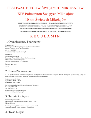 FESTIWAL BIEGÓW ŚWIĘTYCH MIKOŁAJÓW XIV Półmaraton Świętych Mikołajów 10 km Świętych Mikołajów DRUŻYNOWE MISTRZOSTWA POLSKI W PÓŁMARATONIE REKREACYJNYM DRUŻYNOWE MISTRZOSTWA POLSKI NA 10 KM ŚWIĘTYCH MIKOŁAJÓW MISTRZOSTWA MIASTA TORUNIA W PÓŁMARATONIE REKREACYJNYM MISTRZOSTWA MIASTA TORUNIA NA 10 KM ŚWIĘTYCH MIKOŁAJÓW R E G U L A M I N: 1. Organizatorzy i partnerzy: Organizator: Stowarzyszenie Kultury Fizycznej „Maraton Toruński” ul. Mickiewicza 142/4, 87100 Toruń tel. 56 471 38 29 email: [email protected] Partnerzy: Urząd Miasta Torunia, Samorząd Województwa KujawskoPomorskiego, Ministerstwo Sportu i Turystyki, Szkoła Podstawowa nr 13 w Toruniu Partner sportowy: Asics 2. Biuro Półmaratonu: 3 i 4 grudnia biuro zawodów znajdować się będzie w hali sportowej Zespołu Szkół Przemysłu Spożywczego, przy ul. Grunwaldzkiej 33/35, obok Stadionu Miejskiego im. G. Duneckiego. Godziny otwarcia biura: 3 grudnia: 15:00 – 20:30 4 grudnia: 7:00 – 9:30 Stowarzyszenie Kultury Fizycznej Maraton Toruński, Fax: (56) 6230162 Tel.: (56) 4713829 email: [email protected] www: www.biegmikolajow.pl 3. Termin i miejsce: Termin: 4 grudnia 2016 r. Start: Rynek Staromiejski w Toruniu, godz. 11:00 Meta: ul. Bema Zamknięcie mety Półmaratonu nastąpi o godz. 14:00. Zamknięcie mety 10 km nastąpi o godz 12:30. 4. Trasa biegu: Trasa Półmaratonu liczy 21,1km i będzie oznakowana co 1km. Cała trasa zostanie zatwierdzona przez atestatora z PZLA. Szczegółowy jej opis zostanie opublikowany w późniejszym terminie. Trasa 10 km będzie oznakowana co 1 km. Szczegółowy jej opis zostanie opublikowany w późniejszym terminie. 5. Uczestnictwo: Bieg jest otwarty dla wszystkich amatorówbiegaczy, którzy wypełnili formularz zgłoszenia udziału i uiścili opłatę startową oraz posiadają aktualne badania lekarskie (lub podpiszą stosowne oświadczenie). Każda osoba uczestniczy w biegu na własną odpowiedzialność. W biegu mogą wziąć udział tylko osoby, które wpłaciły opłatę startową i mają przypięty numer startowy w widocznym miejscu. Na starcie i podczas biegu wymagana jest czapka i czerwona koszulka dostarczone przez organizatora, który „może odstąpić od kwalifikacji osób naruszających tą zasadę”. Zwolnione z tego wymogu mogą być jedynie osoby we własnych strojach św. Mikołaja lub innych strojach związanych z charakterem biegu (śnieżynki, renifery itp.) Warunkiem otrzymania medalu na mecie jest przypięty na klatce piersiowej numer startowy imprezy biegowej oraz posiadanie ubioru określonego jak wyżej. 6. Odpowiedzialność: Organizatorzy nie ponoszą odpowiedzialności za ewentualną szkodę poniesioną przez uczestnika w czasie Festiwalu Biegów Świętych Mikołajów. W zawodach mogą wziąć udział osoby od 15 roku życia. Osoby niepełnoletnie bezwzględnie muszą posiadać pisemną zgodę rodziców bądź prawnych opiekunów. 7. Zgłoszenia do biegu: Zgłoszenia elektroniczne za pośrednictwem strony biegmikolajow.pl(do 30 listopada, kiedy to z powodów organizacyjnych rejestracja elektroniczna zostanie zamknięta) W dniach 3 i 4 grudnia w biurze zawodów (patrz wyżej). W dniu zawodów od godziny 7:00 do godziny 8:00, później następuje koniec zapisów! Pakiety startowe z numerem będzie można odbierać do godziny 9:30. Ponieważ ilość dostępnych numerów startowych tuż przed zawodami będzie ograniczone (około 100), prosimy nie odkładać rejestracji i opłacenia startu na ostatnią chwilę. W przypadku zgłoszenia innego niż poprzez formularz na stronie internetowej należy podać: imię i nazwisko, datę urodzenia, dokładny adres pocztowy, adres email, nazwę klubu, opcjonalnie telefon. Organizator wprowadza limit ilości uczestników biegu w wysokości 4000 osób (licząc biegaczy, którzy wnieśli opłatę startową). 8. Weryfikacja: 3 i 4 grudnia w biurze zawodów należy okazać dowód osobisty i dokument potwierdzający dokonanie opłaty startowej (jeżeli jej uiszczenie nie było widoczne na liście startowej na stronie www.biegmikolajow.pl). 9. Klasyfikacja: PÓŁMARATON ŚW. MIKOŁAJÓW Prowadzona będzie klasyfikacja open kobiet i mężczyzn oraz w następujących kategoriach wiekowych (wg roczników urodzenia): Kobiety i Mężczyźni: K i M 15: 15 – 17 lat, K i M 18: 18 – 29 lat, K i M 30: 30 – 39 lat, K i M 40: 40 – 44 lata, K i M 45: 45 – 49 lat, K i M 50: 50 – 54 lata, K i M 55: 55 – 59 lat, K i M 60: 60 – 64 lata, K i M 65: 65 – 69 lat, K i M 70: 70 i więcej lat. W Mistrzostwach Miasta Torunia prowadzona będzie klasyfikacja kobiet i mężczyzn. Udział mogą wziąć tylko osoby zameldowane na stałe w Toruniu. Zawodnicy będą klasyfikowani i nagradzani niezależnie we wszystkich kategoriach, w których spełniają warunki uczestnictwa, za wyjątkiem kategorii wiekowych. Zawodnik, który otrzyma nagrodę w kategorii generalnej nie otrzymuje nagrody w kategorii wiekowej. 10KM ŚW. MIKOŁAJÓW Prowadzona będzie klasyfikacja open kobiet i mężczyzn oraz w następujących kategoriach wiekowych (wg roczników urodzenia): Kobiety i Mężczyźni: K i M 15: 15 – 17 lat, K i M 18: 18 – 29 lat, K i M 30: 30 – 39 lat, K i M 40: 40 – 44 lata, K i M 45: 45 – 49 lat, K i M 50: 50 – 54 lata, K i M 55: 55 – 59 lat, K i M 60: 60 – 64 lata, K i M 65: 65 – 69 lat, K i M 70: 70 i więcej lat. W Mistrzostwach Miasta Torunia prowadzona będzie klasyfikacja kobiet i mężczyzn. Udział mogą wziąć tylko osoby zameldowane na stałe w Toruniu. Zawodnicy będą klasyfikowani i nagradzani niezależnie we wszystkich kategoriach, w których spełniają warunki uczestnictwa, za wyjątkiem kategorii wiekowych. Zawodnik, który otrzyma nagrodę w kategorii generalnej nie otrzymuje nagrody w kategorii wiekowej. 10.Drużynowe Mistrzostwa Polski w Półmaratonie św. Mikołajów i 10 km św. Mikołajów Do drużynowych Mistrzostw Polski w Półmaratonie św. Mikołajów i 10 km św. Mikoła