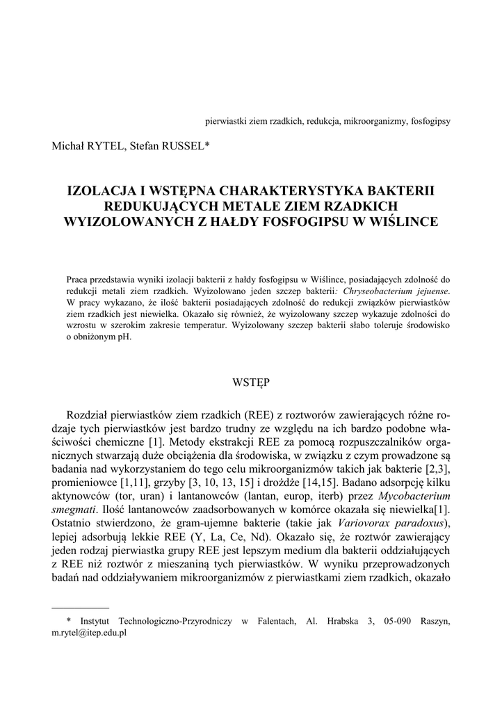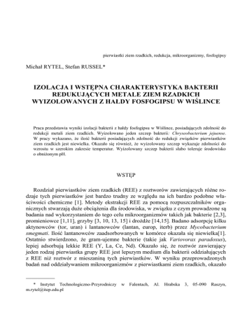 pierwiastki ziem rzadkich, redukcja, mikroorganizmy, fosfogipsy Michał RYTEL, Stefan RUSSEL* IZOLACJA I WSTĘPNA CHARAKTERYSTYKA BAKTERII REDUKUJĄCYCH METALE ZIEM RZADKICH WYIZOLOWANYCH Z HAŁDY FOSFOGIPSU W WIŚLINCE Praca przedstawia wyniki izolacji bakterii z hałdy fosfogipsu w Wiślince, posiadających zdolność do redukcji metali ziem rzadkich. Wyizolowano jeden szczep bakterii: Chryseobacterium jejuense. W pracy wykazano, że ilość bakterii posiadających zdolność do redukcji związków pierwiastków ziem rzadkich jest niewielka. Okazało się również, że wyizolowany szczep wykazuje zdolności do wzrostu w szerokim zakresie temperatur. Wyizolowany szczep bakterii słabo toleruje środowisko o obniżonym pH. WSTĘP Rozdział pierwiastków ziem rzadkich (REE) z roztworów zawierających różne rodzaje tych pierwiastków jest bardzo trudny ze względu na ich bardzo podobne właściwości chemiczne [1]. Metody ekstrakcji REE za pomocą rozpuszczalników organicznych stwarzają duże obciążenia dla środowiska, w związku z czym prowadzone są badania nad wykorzystaniem do tego celu mikroorganizmów takich jak bakterie [2,3], promieniowce [1,11], grzyby [3, 10, 13, 15] i drożdże [14,15]. Badano adsorpcję kilku aktynowców (tor, uran) i lantanowców (lantan, europ, iterb) przez Mycobacterium smegmati. Ilość lantanowców zaadsorbowanych w komórce okazała się niewielka[1]. Ostatnio stwierdzono, że gram-ujemne bakterie (takie jak Variovorax paradoxus), lepiej adsorbują lekkie REE (Y, La, Ce, Nd). Okazało się, że roztwór zawierający jeden rodzaj pierwiastka grupy REE jest lepszym medium dla bakterii oddziałujących z REE niż roztwór z mieszaniną tych pierwiastków. W wyniku przeprowadzonych badań nad oddziaływaniem mikroorganizmów z pierwiastkami ziem rzadkich, okazało __________ * Instytut Technologiczno-Przyrodniczy [email protected] w Falentach, Al. Hrabska 3, 05-090 Raszyn, 570 M. RYTEL, S RUSSEL się, że największe ilości REE magazynowane są w komórkach bakterii gram dodatnich, natomiast akumulacja REE w komórkach bakterii gram ujemnych, grzybów, oraz drożdży była zdecydowanie niższa [6]. W wyniku badań okazało się, że tlenowa bakteria gram dodatnia z rzędu promieniowców Streptomyces najefektywniej absorbuje iterb z pośród wszystkich pierwiastków ziem rzadkich [7]. Fosfogipsy, jako odpady powstałe podczas rozkładu surowców fosforowych, zawierają liczne zanieczyszczenia w postaci REE, metali ciężkich lub nawet uranu. Stanowią wobec tego, swoisty rezerwuar cennych pierwiastków [8]. METODYKA Próbki do badań pobrano z hałdy fosfogipsu w Wiślince. W celu pobrania próbek usunięto 10 cm wierzchniej warstwy, a następnie pobrano próbki fosfogipsu. Próbki fosfogipsu umieszczane były w sterylnych 50 ml pojemnikach wypełnionych solą fizjologiczną (8,5 g NaCl) w 1/3 objętości. Próbki umieszczono w temperaturze 4°C i transportowano do laboratorium. Bakterie izolowano na podłożu stałym o składzie: La2O3 – 2 g; pepton – 2 g; ekstrakt drożdżowy – 1 g; CaCl2 – 0,1 g; KH2PO4 – 0,05 g; MgSO4x7H2O – 0,02 g; NaCl – 0,2 g; (NH4)2SO4 – 0,1 g (A). Hodowle inkubowano w temperaturze 20°C. Po 24 godzinach inkubacji próbki pasażowano. Pasażowanie powtarzano do momentu uzyskania czystych kolonii. W celu wstępnego określenia zdolności bakterii do redukcji związków pierwiastków ziem rzadkich wykorzystano metodę arsenazo III: 50 mg odczynnika arsenazo III rozpuszczono w 100 ml wody destylowanej. Przygotowano roztwór wzorcowy lantanu 1 mg La/ml: rozpuszczono 0,117 g La2O3, odwodnionego przez wyprażenie, w 5 ml gorącego kwasu solnego. Rozcieńczono roztwór wodą destylowaną do 100 ml. Do roztworu badanego (pH~1), zawierającego mniej niż 80 µg metali ziem rzadkich, dodano 2 ml 1% roztworu kwasu askorbinowego. Po paru minutach 1 ml buforu mrówczanowego (pH 3,5) i 4 ml roztworu arsenazo III i dopełniono do 40 ml wodą destylowaną. Roztwór doprowadzono do pH~2,6 i dopełniono wodą destylowaną do 50 ml. Absorbancję mierzono przy długości fali λ= 650 nm. Krzywą wzrostu bakterii ustalano na płynnym podłożu pełnym o pH 7. Do doświadczenia wykorzystano bakterie po 12 godzinnej inkubacji. Hodowle prowadzone były na wytrząsarce w temperaturze 20°C. Dodatkowo zmierzono możliwości wzrostu szczepu w temperaturach 10°C, 30°C i 40°C oraz przy różnych wartościach pH podłoża: 5, 9 i 11. Absorbancja mierzona była co 8 godzin przez 8 dni, przy długości fali λ= 600 nm. W celu amplifikacji genów 16S rRNA prowadzono reakcję PCR-u kolonijnego (Gathogo i wsp., 2003). Próbki zsekwencjonowano w Pracowni Sekwencjonowania Izolacja i wstępna charakterystyka bakterii redukujących metale ziem rzadkich z hałdy w... 571 DNA i Syntezy Oligonukleotydów w Instytucie Biochemii i Biofizyki PAN. W procesie sekwencjonowania użyto następujących starterów: 1) 27F 5’ – AGAGTTTGATCATGGCTCAG – 3’ 2) 1492R 5’ – GGTTACCTTGTTACGACTT – 3’ Otrzymane sekwencje zostały porównane z bazą danych, wykorzystując program BLAST znajdującego się na stronie internetowej: http://www.ncbi.nlm.nih.gov/blast/. WYNIKI W celu izolacji bakterii zdolnych do redukcji pierwiastków ziem rzadkich zastosowano podłoże A. Bakterie hodowano na szalkach Petriego z podłożem A zestalonym agarem do momentu pojawienia się pojedynczych kolonii (do 5 dni). Z puli wyrosłych kolonii do dalszej analizy wybrano 8 morfologicznie różnych kolonii. W celu potwierdzenia czy wszystkie wybrane szczepy są zdolne do redukcji pierwiastków ziem rzadkich (lantanu), przeprowadzono test metodą arsenazo III. Spośród 8 szczepów tylko 1 izolat dał pozytywny wynik w przeprowadzonym teście. Po odwirowaniu hodowli zmierzona absorbancja była przybliżona do wartości próby roztworu wzorcowego (~0,4), natomiast różniła się od roztworu bez dodatku pierwiastków ziem rzadkich (absorbancja roztworu ~0,006). W ten sposób, sp