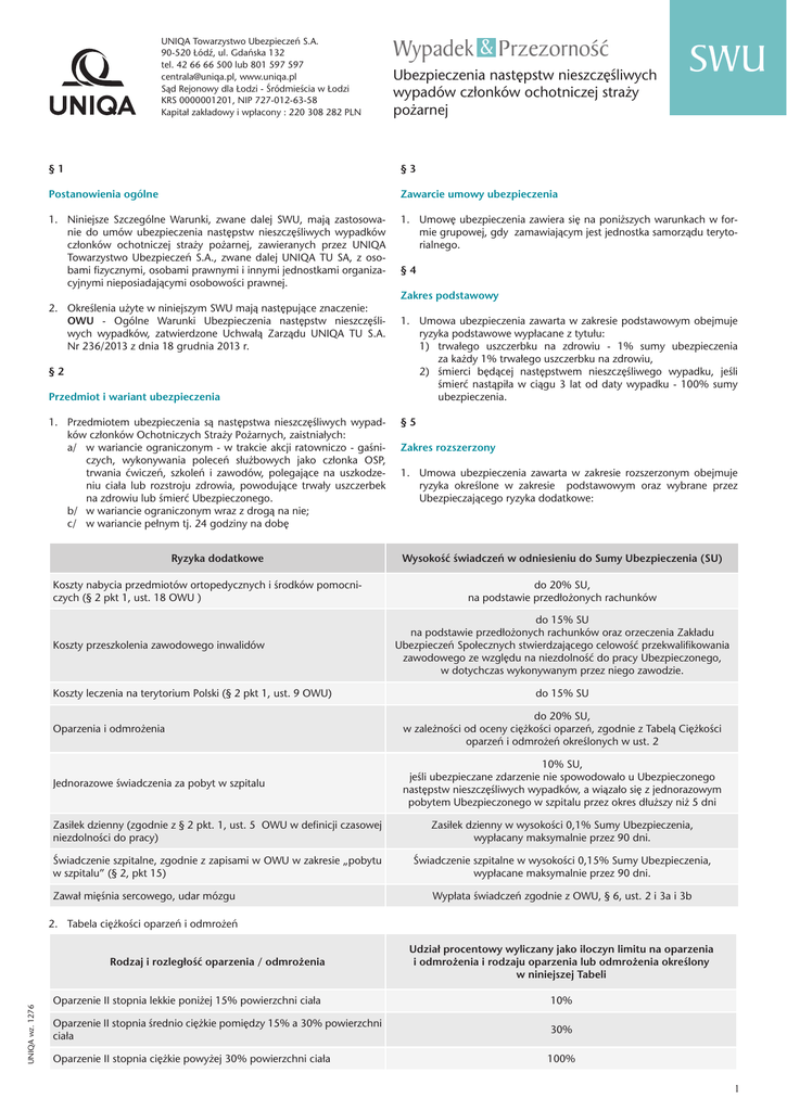 UNIQA Towarzystwo Ubezpieczeń S.A. 90-520 Łódź, ul. Gdańska 132 tel. 42 66 66 500 lub 801 597 597 [email protected], www.uniqa.pl Sąd Rejonowy dla Łodzi - Śródmieścia w Łodzi KRS 0000001201, NIP 727-012-63-58 Kapitał zakładowy i wpłacony : 220 308 282 PLN Wypadek & Przezorność Ubezpieczenia następstw nieszczęśliwych wypadów członków ochotniczej straży pożarnej SWU §1 §3 Postanowienia ogólne Zawarcie umowy ubezpieczenia 1. Niniejsze Szczególne Warunki, zwane dalej SWU, mają zastosowanie do umów ubezpieczenia następstw nieszczęśliwych wypadków członków ochotniczej straży pożarnej, zawieranych przez UNIQA Towarzystwo Ubezpieczeń S.A., zwane dalej UNIQA TU SA, z osobami fizycznymi, osobami prawnymi i innymi jednostkami organizacyjnymi nieposiadającymi osobowości prawnej. 1. Umowę ubezpieczenia zawiera się na poniższych warunkach w formie grupowej, gdy zamawiającym jest jednostka samorządu terytorialnego. §4 Zakres podstawowy 2. Określenia użyte w niniejszym SWU mają następujące znaczenie: OWU - Ogólne Warunki Ubezpieczenia następstw nieszczęśliwych wypadków, zatwierdzone Uchwałą Zarządu UNIQA TU S.A. Nr 236/2013 z dnia 18 grudnia 2013 r. §2 Przedmiot i wariant ubezpieczenia 1. Przedmiotem ubezpieczenia są następstwa nieszczęśliwych wypadków członków Ochotniczych Straży Pożarnych, zaistniałych: a/ w wariancie ograniczonym - w trakcie akcji ratowniczo - gaśniczych, wykonywania poleceń służbowych jako członka OSP, trwania ćwiczeń, szkoleń i zawodów, polegające na uszkodzeniu ciała lub rozstroju zdrowia, powodujące trwały uszczerbek na zdrowiu lub śmierć Ubezpieczonego. b/ w wariancie ograniczonym wraz z drogą na nie; c/ w wariancie pełnym tj. 24 godziny na dobę Ryzyka dodatkowe Koszty nabycia przedmiotów ortopedycznych i środków pomocniczych (§ 2 pkt 1, ust. 18 OWU ) Koszty przeszkolenia zawodowego inwalidów Koszty leczenia na terytorium Polski (§ 2 pkt 1, ust. 9 OWU) 1. Umowa ubezpieczenia zawarta w zakresie podstawowym obejmuje ryzyka podstawowe wypłacane z tytułu: 1) trwałego uszczerbku na zdrowiu - 1% sumy ubezpieczenia za każdy 1% trwałego uszczerbku na zdrowiu, 2) śmierci będącej następstwem nieszczęśliwego wypadku, jeśli śmierć nastąpiła w ciągu 3 lat od daty wypadku - 100% sumy ubezpieczenia. §5 Zakres rozszerzony 1. Umowa ubezpieczenia zawarta w zakresie rozszerzonym obejmuje ryzyka określone w zakresie podstawowym oraz wybrane przez Ubezpieczającego ryzyka dodatkowe: Wysokość świadczeń w odniesieniu do Sumy Ubezpieczenia (SU) do 20% SU, na podstawie przedłożonych rachunków do 15% SU na podstawie przedłożonych rachunków oraz orzeczenia Zakładu Ubezpieczeń Społecznych stwierdzającego celowość przekwalifikowania zawodowego ze względu na niezdolność do pracy Ubezpieczonego, w dotychczas wykonywanym przez niego zawodzie. do 15% SU Oparzenia i odmrożenia do 20% SU, w zależności od oceny ciężkości oparzeń, zgodnie z Tabelą Ciężkości oparzeń i odmrożeń określonych w ust. 2 Jednorazowe świadczenia za pobyt w szpitalu 10% SU, jeśli ubezpieczane zdarzenie nie spowodowało u Ubezpieczonego następstw nieszczęśliwych wypadków, a wiązało się z jednorazowym pobytem Ubezpieczonego w szpitalu przez okres dłuższy niż 5 dni Zasiłek dzienny (zgodnie z § 2 pkt. 1, ust. 5 OWU w definicji czasowej niezdolności do pracy) Zasiłek dzienny w wysokości 0,1% Sumy Ubezpieczenia, wypłacany maksymalnie przez 90 dni. Świadczenie szpitalne, zgodnie z zapisami w OWU w zakresie „pobytu w szpitalu” (§ 2, pkt 15) Świadczenie szpitalne w wysokości 0,15% Sumy Ubezpieczenia, wypłacane maksymalnie przez 90 dni. Zawał mięśnia sercowego, udar mózgu Wypłata świadczeń zgodnie z OWU, § 6, ust. 2 i 3a i 3b 2. Tabela ciężkości oparzeń i odmrożeń UNIQA wz. 1276 Rodzaj i rozległość oparzenia / odmrożenia Udział procentowy wyliczany jako iloczyn limitu na oparzenia i odmrożenia i rodzaju oparzenia lub odmrożenia określony w niniejszej Tabeli Oparzenie II stopnia lekkie poniżej 15% powierzchni ciała 10% Oparzenie II stopnia średnio ciężkie pomiędzy 15% a 30% powierzchni ciała 30% Oparzenie II stopnia ciężkie powyżej 30% powierzchni ciała 100% 1 Oparzenie III stopnia lekkie poniżej 5% powierzchni ciała 20% Oparzenie III stopnia średnio ciężkie pomiędzy 5% a 15% powierzchni ciała 50% Oparzenie III stopnia ciężkie powyżej 15% powierzchni ciała 100% Odmrożenie III stopnia 20% Odmrożenie IV 50% §6 Postanowienia końcowe W sprawach nieuregulowanych w niniejszych warunkach szczególnych mają zastosowanie odpowiednie przepisy ogólnych warunków ubezpieczenia następstw nieszczęśliwych warunków, zatwierdzonych Uchwałą Zarządu UNIQA TU S.A. Nr XXX/2013 z dnia dzień miesiąc 2013 r. Niniejsze szczególne warunki ubezpieczenia zostały zatwierdzone Uchwałą Zarządu UNIQA TU S.A. Nr 236/2013 z dnia 18 grudnia 2013 r. i mają zastosowanie do umów ubezpieczenia zawieranych od dnia 1 lutego 2014 r. 2