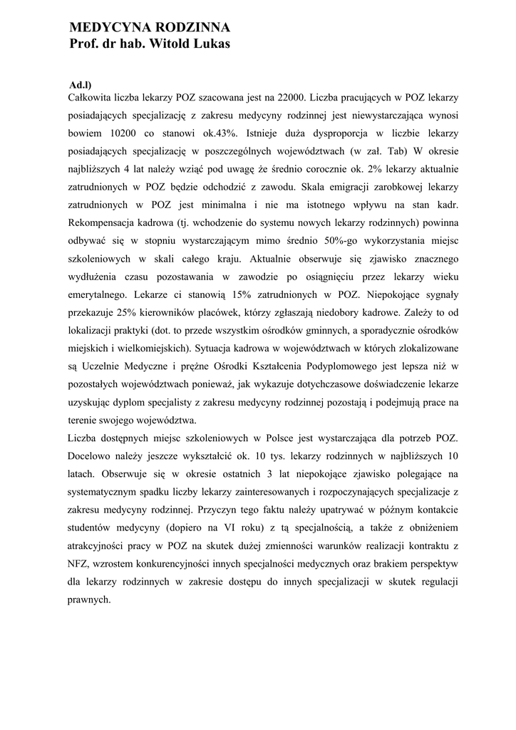 MEDYCYNA RODZINNA Prof. dr hab. Witold Lukas Ad.l) Całkowita liczba lekarzy POZ szacowana jest na 22000. Liczba pracujących w POZ lekarzy posiadających specjalizację z zakresu medycyny rodzinnej jest niewystarczająca wynosi bowiem 10200 co stanowi ok.43%. Istnieje duża dysproporcja w liczbie lekarzy posiadających specjalizację w poszczególnych województwach (w zał. Tab) W okresie najbliższych 4 lat należy wziąć pod uwagę że średnio corocznie ok. 2% lekarzy aktualnie zatrudnionych w POZ będzie odchodzić z zawodu. Skala emigracji zarobkowej lekarzy zatrudnionych w POZ jest minimalna i nie ma istotnego wpływu na stan kadr. Rekompensacja kadrowa (tj. wchodzenie do systemu nowych lekarzy rodzinnych) powinna odbywać się w stopniu wystarczającym mimo średnio 50%-go wykorzystania miejsc szkoleniowych w skali całego kraju. Aktualnie obserwuje się zjawisko znacznego wydłużenia czasu pozostawania w zawodzie po osiągnięciu przez lekarzy wieku emerytalnego. Lekarze ci stanowią 15% zatrudnionych w POZ. Niepokojące sygnały przekazuje 25% kierowników placówek, którzy zgłaszają niedobory kadrowe. Zależy to od lokalizacji praktyki (dot. to przede wszystkim ośrodków gminnych, a sporadycznie ośrodków miejskich i wielkomiejskich). Sytuacja kadrowa w województwach w których zlokalizowane są Uczelnie Medyczne i prężne Ośrodki Kształcenia Podyplomowego jest lepsza niż w pozostałych województwach ponieważ, jak wykazuje dotychczasowe doświadczenie lekarze uzyskując dyplom specjalisty z zakresu medycyny rodzinnej pozostają i podejmują prace na terenie swojego województwa. Liczba dostępnych miejsc szkoleniowych w Polsce jest wystarczająca dla potrzeb POZ. Docelowo należy jeszcze wykształcić ok. 10 tys. lekarzy rodzinnych w najbliższych 10 latach. Obserwuje się w okresie ostatnich 3 lat niepokojące zjawisko polegające na systematycznym spadku liczby lekarzy zainteresowanych i rozpoczynających specjalizacje z zakresu medycyny rodzinnej. Przyczyn tego faktu należy upatrywać w późnym kontakcie studentów medycyny (dopiero na VI roku) z tą specjalnością, a także z obniżeniem atrakcyjności pracy w POZ na skutek dużej zmienności warunków realizacji kontraktu z NFZ, wzrostem konkurencyjności innych specjalności medycznych oraz brakiem perspektyw dla lekarzy rodzinnych w zakresie dostępu do innych specjalizacji w skutek regulacji prawnych. Zabezpieczenie w kadrę specjalistów Medycyny Rodzinnej w poszczególnych województwach (dane szacunkowe) WOJEWÓDZTWO WSKAŹNIK NIEDOBORU LEKARZY RODZINNYCH * Podkarpackie 54% Wielkopolskie 62% Dolnośląskie 45% Warmińsko-Mazurskie 43% Zachodniopomorskie 51% Opolskie 59% Kujawsko-Pomorskie 66% Lubuskie 41% Lubelskie 17% Mazowieckie 66% Podlaskie 38% Pomorskie 51% Małopolskie 44% Łódzkie 56% Świętokrzyskie 48% Śląskie 65% *przyjęto założenie : na 1 lekarza rodzinnego przypada 2500 pacjentów 2 Ad. 2) Aktualny program specjalizacji z medycyny rodzinnej jest bardzo zbliżony do programów realizowanych w innych krajach europejskich. Należy podkreślić, że podstawą wprowadzania w Polsce w ubiegłych latach zmian w treści programu były zalecenia Światowej Organizacji Lekarzy Medycyny Rodzinnej (WONCA) i Europejskiej Akademii Nauczycieli Medycyny Rodzinnej (EURACT). Polscy specjaliści z zakresu medycyny rodzinnej po uzyskaniu dyplomu podejmują pracę w Wielkiej Brytanii, Irlandii Północnej, w Republice Irlandii bez ograniczeń. Jednakże aby podnieść jakość nauczania i sprostać zachodzącym zmianom społecznym i trendom w medycynie należy w dalszym ciągu konsekwentnie udoskonalać program specjalizacji w tej dziedzinie. Programy nauczania w oddziałach klinicznych i szpitalnych, w których specjalizujący się w Medycynie Rodzinnej odbywają staże kierunkowe uwzględniają szerokie aspekty opieki trzeciorzędowej, natomiast w niewielkim stopniu uwzględniają problemy POZ konieczne jest wprowadzenie istotnych zmian. Katedry i Zakłady medycyny rodzinnej są postrzegane niejednoznacznie przez Dziekanów Wydziałów Lekarskich jako jednostki zajmujące się również zdrowiem publicznym. Jednostki te zajmują się nauczaniem przede wszystkim studentów a w zdecydowanie mniejszym stopniu są wspierane w zakresie szkolenia podyplomowego (istnieją duże różnice w poszczególnych Uczelniach). Podsumowując, proponuje się następujące rozwiązania mające służyć poprawie nauczania medycyny rodzinnej: W szkoleniu przeddyplomowym niezbędne jest położenie nacisku na wczesny kontakt z Medycyną Rodzinną studentów Wydziału Lekarskiego. Promocja Medycyny Rodzinnej może być realizowana poprzez większą aktywizację działań studenckich kół naukowych przy Katedrach i Zakładach MR. Wspólne wyjazdy wakacyjne o charakterze naukowoszkoleniowym mogą prowadzić do włączania się grup studenckich w działalność lokalnych placówek POZ. W szkoleniu podyplomowym należy wprowadzić zmiany w programie specjalizacji uwzględniający wariant przeznaczony dla doświadczonych internistów i pediatrów pracujących w POZ w dużych ośrodkach miejskich (dot. to szczególnie Warszawy). Powinno to skutkować wyrównaniem standardów postępowania w publicznych i niepublicznych zakładach opieki zdrowotnej. Należy stale promować i doskonalić metody kształcenia na odległość (Distance-learning). Konieczne jest stałe podnoszenie kwalifikacji i umiejętności dydaktycznych kierowników specjalizacji i nauczycieli Medycyny Rodzinnej praktykujących w POZ (np.:kursy EURACT, itp). Niezbędna jest stymulacja rozwoju ośrodków kształcenia zarówno akademickich i pozaakademickich, a wsparcie finansowe przez Ministerstwo Zdrowia powinno przyczynić się do konsolidacji kadry, a co za tym idzie zmniejszenia fluktuacji. Nauczanie Medycyny Rodzinnej w ramach specjalizacji z tej dziedziny powinno być bardziej ukierunkowane na problem, kompleksowe, odnosić się do EBM, być usytuowane w 