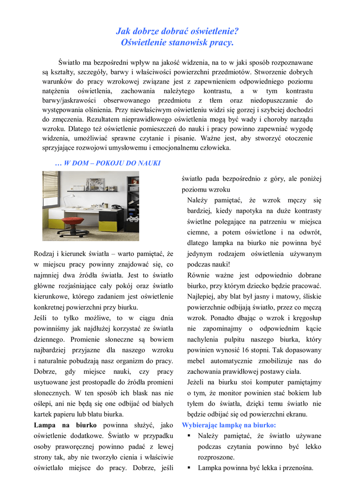 Jak dobrze dobrać oświetlenie? Oświetlenie stanowisk pracy. Światło ma bezpośredni wpływ na jakość widzenia, na to w jaki sposób rozpoznawane są kształty, szczegóły, barwy i właściwości powierzchni przedmiotów. Stworzenie dobrych warunków do pracy wzrokowej związane jest z zapewnieniem odpowiedniego poziomu natężenia oświetlenia, zachowania należytego kontrastu, a w tym kontrastu barwy/jaskrawości obserwowanego przedmiotu z tłem oraz niedopuszczanie do występowania olśnienia. Przy niewłaściwym oświetleniu widzi się gorzej i szybciej dochodzi do zmęczenia. Rezultatem nieprawidłowego oświetlenia mogą być wady i choroby narządu wzroku. Dlatego też oświetlenie pomieszczeń do nauki i pracy powinno zapewniać wygodę widzenia, umożliwiać sprawne czytanie i pisanie. Ważne jest, aby stworzyć otoczenie sprzyjające rozwojowi umysłowemu i emocjonalnemu człowieka. … W DOM – POKOJU DO NAUKI Rodzaj i kierunek światła – warto pamiętać, że w miejscu pracy powinny znajdować się, co najmniej dwa źródła światła. Jest to światło główne rozjaśniające cały pokój oraz światło kierunkowe, którego zadaniem jest oświetlenie konkretnej powierzchni przy biurku. Jeśli to tylko możliwe, to w ciągu dnia powinniśmy jak najdłużej korzystać ze światła dziennego. Promienie słoneczne są bowiem najbardziej przyjazne dla naszego wzroku i naturalnie pobudzają nasz organizm do pracy. Dobrze, gdy miejsce nauki, czy pracy usytuowane jest prostopadle do źródła promieni słonecznych. W ten sposób ich blask nas nie oślepi, ani nie będą się one odbijać od białych kartek papieru lub blatu biurka. Lampa na biurko powinna służyć, jako oświetlenie dodatkowe. Światło w przypadku osoby praworęcznej powinno padać z lewej strony tak, aby nie tworzyło cienia i właściwie oświetlało miejsce do pracy. Dobrze, jeśli światło pada bezpośrednio z góry, ale poniżej poziomu wzroku Należy pamiętać, że wzrok męczy się bardziej, kiedy napotyka na duże kontrasty świetlne polegające na patrzeniu w miejsca ciemne, a potem oświetlone i na odwrót, dlatego lampka na biurko nie powinna być jedynym rodzajem oświetlenia używanym podczas nauki! Równie ważne jest odpowiednio dobrane biurko, przy którym dziecko będzie pracować. Najlepiej, aby blat był jasny i matowy, śliskie powierzchnie odbijają światło, przez co męczą wzrok. Ponadto dbając o wzrok i kręgosłup nie zapominajmy o odpowiednim kącie nachylenia pulpitu naszego biurka, który powinien wynosić 16 stopni. Tak dopasowany mebel automatycznie zmobilizuje nas do zachowania prawidłowej postawy ciała. Jeżeli na biurku stoi komputer pamiętajmy o tym, że monitor powinien stać bokiem lub tyłem do światła, dzięki temu światło nie będzie odbijać się od powierzchni ekranu. Wybierając lampkę na biurko: Należy pamiętać, że światło używane podczas czytania powinno być lekko rozproszone. Lampka powinna być lekka i przenośna. Przewód elektryczny musi mieć co najmniej 1,5–3 m. W taki sposób będziemy mogli ustawić oświetlenie w dowolnym miejscu, nie martwiąc się o dostęp do gniazdka. Lampka na biurko powinna mieć możliwość regulacji jej wysokości oraz kąta padania światłą na powierzchnię blatu. Ciekawym rozwiązaniem są lampki, które po zamontowaniu można przesuwać wzdłuż blatu biurka. Jest to szczególnie przydatne, kiedy z jednego biurka korzysta zarówno osoba prawo i lewo ręczna. Źródło światła powinno być umiejscowione na wysokości ok. 35 cm nad płaszczyzną biurka. Lampka powinna dokładnie oświetlać przestrzeń, w której pracujemy (ok. 40 do 50% powierzchni biurka), ale nie powinna świecić na twarz pochylonego dziecka. Promień światła powinien oświetlać całą centralną część biurka. Lampka powinna być wyposażona w nieprzezroczysty abażur tak, aby światło nie ulegało rozproszeniu. Do pracy i czytania powinno się stosować świetlówki o chłodnej barwie światła. Najbardziej zbliżone do światła dziennego jest światło halogenowe. Żarówki o chłodniejszej temperaturze barwowej są korzystniejsze do pracy, ponieważ stymulują do pracy, pobudzają i nie męczą wzroku. Światło ciepłe natomiast obniża koncentrację, sprzyja rozluźnieniu i usypianiu. … SZKOŁA - SALA LEKCYJNA Pomieszczenia szkolne powinny mieć zapewniony dostęp światła dziennego oraz oświetlenie elektryczne. Oświetlenie naturalne uznaje się za prawidłowe, gdy spełniony jest warunek dotyczący stosunku powierzchni okien do powierzchni podłogi (mieści się on w przedziale od 1:4 do 1:5) i warunek co do strony z której pada światło (powinna to być lewa strona). Aby oświetlenie naturalne mogło docierać do pomieszczeń szyby w oknach powinny być utrzymane w czystości. Oświetlenie sztuczne sal lekcyjnych spełnia dwie funkcje. Jest oświetleniem uzupełniającym, gdy ilość światła dziennego jest niewystarczająca i oświetleniem głównym, w porze nocnej. Dobre warunki oświetleniowe można uzyskać: Umieszczając oprawy bezpośrednio na suficie w dwóch ciągach tworzących linie świetlne. Lampy powinny być zawieszone na wysokości 1,8 – 1,9m nad przejściami między rzędami ławek, aby zmniejszyć wpływ olśnień pośrednich, powstających w wyniku odbicia źródła światła od błyszczących powierzchni. Światło powinno padać na miejsce pracy z lewej strony i z przodu. Punkty świetlne powinny być prawidłowo osłonięte, aby chronić wzrok przed olśnieniem. Lampy powinny zapewniać światło rozproszone, zbliżone do dziennego. Tablica i miejsca demonstracji powinny być oświetlone dodatkowo. Dla zminimalizowania odbicia nie mniejszej niż 2,2m od tablicy. uczniowie powinni siadać w odległości Należy pamiętać, że natężenie oświetlenia powinno być dostosowane do charakteru zajęć i pory dnia. Parametry oświetlenia powinny odpowiadać potrzebom użytkowym i spełni