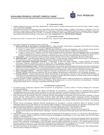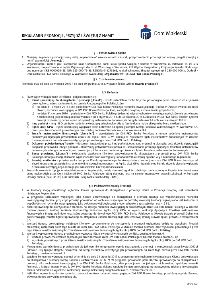 REGULAMIN PROMOCJI „PRZYJDŹ I ŚWIĘTUJ Z NAMI” § 1. Postanowienia ogólne 1. 2. Niniejszy Regulamin promocji zwany dalej „Regulaminem”, określa warunki i zasady przeprowadzenia promocji pod nazwą „Przyjdź i świętuj z nami”, zwany dalej „Promocją”. Organizatorem Promocji jest Powszechna Kasa Oszczędności Bank Polski Spółka Akcyjna z siedzibą w Warszawie, ul. Puławska 15, 02–515 Warszawa, zarejestrowana w Sądzie Rejonowym dla m. st. Warszawy w Warszawie, XIII Wydział Gospodarczy Krajowego Rejestru Sądowego pod numerem KRS 0000026438, NIP: 525-000-77-38, REGON: 016298263, kapitał zakładowy (kapitał wpłacony) 1 250 000 000 zł, Oddział Dom Maklerski PKO Banku Polskiego w Warszawie, zwana dalej „Organizatorem” lub „DM PKO Banku Polskiego”. § 2. Czas trwania promocji Promocja trwa od dnia 12 września 2016 r. do dnia 30 grudnia 2016 r. włącznie, (dalej: „Okres trwania promocji”). § 3. Definicje 1. 2. Przez użyte w Regulaminie określenia i pojęcia rozumie się: 1) Klient uprawniony do skorzystania z promocji („Klient”) – każda pełnoletnia osoba fizyczna, posiadająca pełną zdolność do czynności prawnych oraz adres zamieszkania na terenie Rzeczypospolitej Polskiej, która: a) na dzień 31 sierpnia 2016 r. nie posiadała w DM PKO Banku Polskiego rachunku inwestycyjnego, i która w Okresie trwania promocji otworzy rachunek inwestycyjny w DM PKO Banku Polskiego, który nie będzie związany z działalnością gospodarczą, b) na dzień 31 sierpnia 2016 r. posiadała w DM PKO Banku Polskiego jeden lub więcej rachunków inwestycyjnych, które nie są związane z działalnością gospodarczą, a która w okresie od 1 stycznia 2016 r. do 31 sierpnia 2016 r. zapłaciła w DM PKO Banku Polskim tytułem prowizji za realizację zleceń kupna lub sprzedaży instrumentów finansowych na tych rachunkach kwotę nie większą niż 100 zł. 2) Inny podmiot – inny niż Organizator podmiot świadczący usługi maklerskie w formie domu maklerskiego albo biura maklerskiego. 3) Rynek akcji GPW – rynek obejmujący wyłącznie akcje notowane na rynku głównym Giełdy Papierów Wartościowych w Warszawie S.A. oraz rynku New Connect prowadzonym przez Giełdę Papierów Wartościowych w Warszawie S.A. 4) Transfer instrumentów finansowych („Transfer”) – przeniesienie do DM PKO Banku Polskiego z Innego podmiotu instrumentów finansowych będących przedmiotem obrotu na Rynku akcji GPW, skutkujące zapisaniem tych instrumentów finansowych w Okresie trwania promocji na rachunku inwestycyjnym prowadzonym przez DM PKO Banku Polskiego. 5) Dokument potwierdzający Transfer – dokument wystawiony przez Inny podmiot, opatrzony oryginalną pieczęcią, datą złożenia dyspozycji i podpisem pracownika Innego podmiotu, stanowiący potwierdzenie złożenia w Okresie trwania promocji dyspozycji transferu instrumentów finansowych w Innym podmiocie, oraz zawierający informację o poniesionym koszcie z tytułu Transferu instrumentów finansowych. 6) Bonus prowizyjny („Bonus”) – świadczenie wypłacane Klientowi uprawnionemu do skorzystania z promocji przez DM PKO Banku Polskiego, którego zasady obliczania wysokości oraz warunki wypłaty i opodatkowania zostały opisane w § 4 niniejszego regulaminu. 7) Prowizja maklerska – prowizja zapłacona przez Klienta uprawnionego do skorzystania z promocji na rzecz DM PKO Banku Polskiego od zleceń kupna oraz sprzedaży instrumentów finansowych notowanych na Rynku akcji GPW niezależnie od kanału złożenia zlecenia wyłącznie z rachunku inwestycyjnego, którego jest właścicielem lub współwłaścicielem. Pozostałe określenia i pojęcia, niezdefiniowane w Regulaminie, należy rozumieć zgodnie z definicją zamieszczoną w Regulaminie świadczenia usług maklerskich przez Dom Maklerski PKO Banku Polskiego, który dostępny jest na stronie internetowej www.dm.pkobp.pl, w Punktach Obsługi Klienta (dalej „POK”) oraz Punktach Usług Maklerskich (dalej „PUM”). § 4. Podstawowe zasady Promocji 1. 2. 3. 4. 5. 6. 7. 8. W Promocji mogą uczestniczyć wyłącznie Klienci uprawnieni do skorzystania z promocji. Udział w Promocji związany jest warunkami niniejszego Regulaminu. W przypadku rachunków wspólnych, jako Klienta uprawnionego do skorzystania z promocji traktuje się współwłaścicieli rachunku inwestycyjnego łącznie, przy czym prowizja poniesiona na rachunku wspólnym na potrzeby niniejszej Promocji wykazywana jest każdemu ze współwłaścicieli rachunku inwestycyjnego jako połowa prowizji zapłaconej z tego rachunku, z zastrzeżeniem ust. 4, 5 i 6. Klient uprawniony do skorzystania z promocji, na którego rachunku inwestycyjnym prowadzonym przez DM PKO Banku Polskiego w Okresie trwania promocji zostaną zapisane instrumenty finansowe Rynku akcji GPW w wyniku realizacji dyspozycji transferu instrumentów finansowych z Innego podmiotu, oraz który dostarczy do dowolnego POK DM PKO Banku Polskiego w Okresie trwania promocji Dokument potwierdzający Transfer będzie uprawniony do otrzymania Bonusu prowizyjnego oraz czasowej zmiany stawek opłat i prowizji, z zastrzeżeniem § 5. Wartość Bonusu prowizyjnego należnego Klientowi uprawnionemu do skorzystania z promocji uzależniona będzie od wysokości Prowizji maklerskiej zapłaconej przez tego Klienta na rzecz DM PKO Banku Polskiego w Okresie trwania promocji oraz wysokości poniesionych przez tego Klienta kosztów związanych z Transferem instrumentów finansowych Rynku akcji GPW do DM PKO Banku Polskiego. Wartość wypłacanego Bonusu prowizyjnego wyznaczy niższa z wartości wskazanych poniżej, z zastrzeżeniem ust. 6: 1) wartość prowizji maklerskich zapłaconych przez Klienta na rzecz DM PKO Banku Polskiego w Okresie trwania promocji, lub 2) wysokość poniesionych przez Klienta kosztów związanych z Transferem instrumentów finansowych Rynku akcji GPW do DM PKO Banku Polskiego. Maksymalna wartość Bonusu prowizyjnego dl