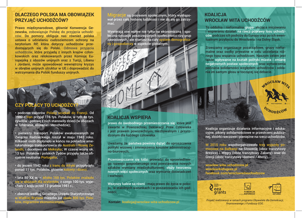 DLACZEGO POLSKA MA OBOWIĄZEK PRZYJĄĆ UCHODŹCÓW? Prawo międzynarodowe, głównie Konwencja Genewska, zobowiązuje Polskę do przyjęcia uchodźców. Do pomocy obliguje nas również polska ustawa o udzielaniu cudzoziemcom ochrony na terytorium RP, która dotyczy uchodźców przedostających się do Polski. Odmowa przyjęcia uchodźców, które przyjadą z innych krajów członkowskich oraz relokowanych przez Komisję Europejską z obozów unijnych oraz z Turcji, Libanu i Jordanii, może spowodować wewnętrzny kryzys w obrębie unijnych struktur w UE i doprowadzić do wstrzymania dla Polski funduszy unijnych. Migracje są procesem społecznym, który występował przez całą historię ludzkości i nie da się go zatrzymać. Wywierają one wpływ nie tylko na ekonomiczną i społeczną sytuację poszczególnych społeczności czy grup zawodowych, ale również na cały system demograficzny i gospodarczy w aspekcie globalnym. KOALICJA WROCŁAW WITA UCHODŹCÓW To oddolna i nieformalna grupa, służąca inicjowaniu i wspieraniu działań na rzecz poprawy losu uchodźców podczas ich podróży do Europy oraz po ich ewentualnym przybyciu do Wrocławia i na Dolny Śląsk. Zrzeszamy organizacje pozarządowe, grupy nieformalne oraz osoby prywatne w celu udzielania różnego typu wsparcia uchodźcom. Naszym celem jest także wpływanie na kształt polityki miasta i zmianę negatywnych postaw społecznych oraz wytworzenia poczucia solidarności względem uchodźców i oddania im samym głosu w toczącej się debacie. CZY POLACY TO UCHODŹCY? • podczas zaborów Polacy uciekali do Francji. Od 1942 r. Iran przyjął 116 tys. Polaków, w tym 4o tys. cywilów - połowę z nich stanowiły dzieci (w obozach w Teheranie, Ahwazie i Meszhedzie); • pierwszy transport Polaków ewakuowanych ze Związku Radzieckiego ruszył w maju 1943 roku. Kilkaset osób dopłynęło w końcu na pokładzie amerykańskiego transportowca do Australii i Nowej Zelandii, i docelowo do Meksyku; W czasie wojny ok. 13 tys. Polaków i polskich Żydów przyjęła także oficjalnie neutralna Portugalia; • do jesieni 1942 roku z Iranu do Afryki przypłynęło ponad 11 tys. Polaków, głównie kobiety i dzieci; • lata 80 XX w. – blisko 160 tys. Polaków znalazło się w obozach dla azylantów, z czego 100 tys. wyjechało z kraju przed 13 grudnia 1981 r.; • obecnie według Głównego Urzędu Statystycznego w Wielkiej Brytanii mieszka już około 800 tys. Polaków, migrantów ekonomicznych; WRAZ Z RODZINAMI KOALICJA WSPIERA prawo do swobodnego przemieszczania się, które jest zawarte w Powszechnej Deklaracji Praw Człowieka i jest prawem powszechnym, niezbywalnym i przyrodzonym dla każdego człowieka. Uważamy, że państwa powinny dążyć do uproszczenia polityki wizowej i zmniejszenia kosztów administracyjno-biurowych; Przemieszczanie się ludzi prowadzi do sprawiedliwego rozwoju gospodarczego oraz powstawania nowych szlaków wymiany międzykulturowej; służy tworzeniu nowych więzi społecznych oraz wymianie doświadczeń i wartości; Koalicja organizuje działania informacyjne i edukacyjne, pikiety solidarnościowe w przestrzeni publicznej, zbiórki rzeczowe i pieniężne na rzecz uchodźców. W 2015 roku współorganizowała trzy wyjazdy pomocowe na Bałkany: na Słowenię (obóz tranzytowy Brezice) i Węgry (obóz tranzytowy Zakany) oraz do Grecji (obóz tranzytowy Idomeni / Ateny). wroclaw-wita-uchodzcow.pl wroclaw4refugees.pl facebook.com/wroclawwitauchodzcow Wszyscy ludzie są równi i mają prawo do życia w pokoju, w stabilnych warunkach i w poszanowaniu ich godności; Kontakt: [email protected] Projekt realizowany w ramach programu Obywatele dla Demokracji, finansowanego z Funduszy EOG. PRZYCZYNY MIGRACJI • ucieczka przed wojną i bezpośrednim zagrożeniem życia, również z przyczyn politycznych i światopoglądowych – przyjazd do krajów gwarantujących bezpieczeństwo (status uchodźcy); • ekonomiczne – migracja do kraju o lepszym statusie ekonomicznym; w poszukiwaniu lepiej płatnej pracy; • środowiskowe, z powodu gwałtownych zmian klimatu – opuszczanie obszarów zagrożonych klęskami żywiołowymi, terenów pustynniejących z niedoborem wody; • naukowe – w celu zdobycia lepszego wykształcenia, np. zagraniczni studenci; Uchodźcy to osoby, którym przyznano status uchodźcy na mocy Konwencji Genewskiej (1951), która nakłada obowiązek na kraje przyjmujące udzielenia im schronienia. Konwencja stanowi, że status ten może otrzymać: „osoba, która opuściła swój kraj pochodzenia, ponieważ odczuwa uzasadnioną obawę przed prześladowaniem z powodu rasy, religii, narodowości, poglądów politycznych, przynależności do określonej grupy społecznej”. Wśród krajów, które podpisały Konwencję, znajduje się Polska. SKUTKI MIGRACJI • prawne i polityczne – masowy przepływ ludności skutkuje ustaleniem nowych krajowych i międzynarodowych rozporządzeń regulujących migracje, np. legalizację pobytu; • humanitarne – zapewnienie bezpieczeństwa różnym grupom etnicznym i narodowym [ratowanie ludzkiego życia]; • ekonomiczne – wpływ imigrantów na rynek pracy i prawo pracy; Uchodźcy dostają się do krajów docelowych szlakami migracyjnymi, których pokonanie jest niebezpieczne i grozi utratą życia. Przemierzają je wszystkimi możliwymi środkami transportu – drogą lądową (samochodami, pociągami, pieszo), morską (promami, statkami rybackimi, pontonami) oraz najrzadziej powietrzną (samolotami). • wspierać działania Koalicji Wrocław Wita Uchodźców: włączać się w organizowanych przez nas wydarzeniach, promować je; • wpłacić pieniądze na rzecz pomocy dla uchodźców na subkonto Stowarzyszenia NOMADA, członkini Koalicji: 88 1140 1140 0000 4690 1800 1010 (nomada.info.pl) • udostępnić uchodźcy lub uchodźczyni pokój lub mieszkanie, rejestrując się w bazie inicjatywy Refugees Welcome Polska na stronie: refugees-welcome.pl • s