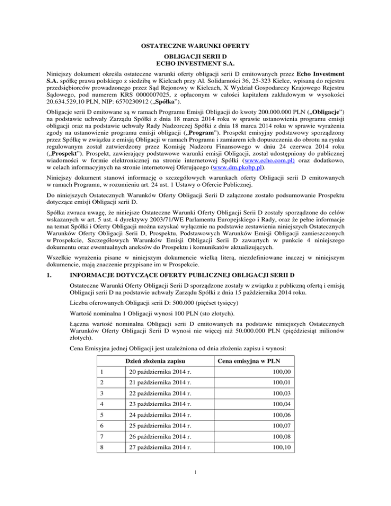 OSTATECZNE WARUNKI OFERTY OBLIGACJI SERII D ECHO INVESTMENT S.A. Niniejszy dokument określa ostateczne warunki oferty obligacji serii D emitowanych przez Echo Investment S.A. spółkę prawa polskiego z siedzibą w Kielcach przy Al. Solidarności 36, 25-323 Kielce, wpisaną do rejestru przedsiębiorców prowadzonego przez Sąd Rejonowy w Kielcach, X Wydział Gospodarczy Krajowego Rejestru Sądowego, pod numerem KRS 0000007025, z opłaconym w całości kapitałem zakładowym w wysokości 20.634.529,10 PLN, NIP: 6570230912 („Spółka”). Obligacje serii D emitowane są w ramach Programu Emisji Obligacji do kwoty 200.000.000 PLN („Obligacje”) na podstawie uchwały Zarządu Spółki z dnia 18 marca 2014 roku w sprawie ustanowienia programu emisji obligacji oraz na podstawie uchwały Rady Nadzorczej Spółki z dnia 18 marca 2014 roku w sprawie wyrażenia zgody na ustanowienie programu emisji obligacji („Program”). Prospekt emisyjny podstawowy sporządzony przez Spółkę w związku z emisją Obligacji w ramach Programu i zamiarem ich dopuszczenia do obrotu na rynku regulowanym został zatwierdzony przez Komisję Nadzoru Finansowego w dniu 24 czerwca 2014 roku („Prospekt”). Prospekt, zawierający podstawowe warunki emisji Obligacji, został udostępniony do publicznej wiadomości w formie elektronicznej na stronie internetowej Spółki (www.echo.com.pl) oraz dodatkowo, w celach informacyjnych na stronie internetowej Oferującego (www.dm.pkobp.pl). Niniejszy dokument stanowi informację o szczegółowych warunkach oferty Obligacji serii D emitowanych w ramach Programu, w rozumieniu art. 24 ust. 1 Ustawy o Ofercie Publicznej. Do niniejszych Ostatecznych Warunków Oferty Obligacji Serii D załączone zostało podsumowanie Prospektu dotyczące emisji Obligacji serii D. Spółka zwraca uwagę, że niniejsze Ostateczne Warunki Oferty Obligacji Serii D zostały sporządzone do celów wskazanych w art. 5 ust. 4 dyrektywy 2003/71/WE Parlamentu Europejskiego i Rady, oraz że pełne informacje na temat Spółki i Oferty Obligacji można uzyskać wyłącznie na podstawie zestawienia niniejszych Ostatecznych Warunków Oferty Obligacji Serii D, Prospektu, Podstawowych Warunków Emisji Obligacji zamieszczonych w Prospekcie, Szczegółowych Warunków Emisji Obligacji Serii D zawartych w punkcie 4 niniejszego dokumentu oraz ewentualnych aneksów do Prospektu i komunikatów aktualizujących. Wszelkie wyrażenia pisane w niniejszym dokumencie wielką literą, niezdefiniowane inaczej w niniejszym dokumencie, mają znaczenie przypisane im w Prospekcie. 1. INFORMACJE DOTYCZĄCE OFERTY PUBLICZNEJ OBLIGACJI SERII D Ostateczne Warunki Oferty Obligacji Serii D sporządzone zostały w związku z publiczną ofertą i emisją Obligacji serii D na podstawie uchwały Zarządu Spółki z dnia 15 października 2014 roku. Liczba oferowanych Obligacji serii D: 500.000 (pięćset tysięcy) Wartość nominalna 1 Obligacji wynosi 100 PLN (sto złotych). Łączna wartość nominalna Obligacji serii D emitowanych na podstawie niniejszych Ostatecznych Warunków Oferty Obligacji Serii D wynosi nie więcej niż 50.000.000 PLN (pięćdziesiąt milionów złotych). Cena Emisyjna jednej Obligacji jest uzależniona od dnia złożenia zapisu i wynosi: Dzień złożenia zapisu Cena emisyjna w PLN 1 20 października 2014 r. 100,00 2 21 października 2014 r. 100,01 3 22 października 2014 r. 100,03 4 23 października 2014 r. 100,04 5 24 października 2014 r. 100,06 6 25 października 2014 r. 100,07 7 26 października 2014 r. 100,08 8 27 października 2014 r. 100,10 1 Dzień złożenia zapisu Cena emisyjna w PLN 9 28 października 2014 r. 100,11 10 29 października 2014 r. 100,13 11 30 października 2014 r. 100,14 12 31 października 2014 r. 100,16 13 1 listopada 2014 r. 100,17 14 2 listopada 2014 r. 100,18 15 3 listopada 2014 r. 100,20 16 4 listopada 2014 r. 100,21 17 5 listopada 2014 r. 100,23 18 6 listopada 2014 r. 100,24 19 7 listopada 2014 r. 100,25 20 8 listopada 2014 r. 100,27 21 9 listopada 2014 r. 100,28 22 10 listopada 2014 r. 100,30 23 11 listopada 2014 r. 100,31 24 12 listopada 2014 r. 100,33 Miejsca przyjmowania zapisów na Obligacje serii D są określone w ogłoszeniu zamieszczonym w formie elektronicznej na stronie internetowej Spółki (www.echo.com.pl). 2. TERMINY ZWIĄZANE Z OFERTĄ OBLIGACJI SERII D Termin rozpoczęcia przyjmowania zapisów: 20 października 2014 r. Termin zakończenia przyjmowania zapisów: 12 listopada 2014 r. Termin przydziału: 13 listopada 2014 r. Przewidywany Dzień Emisji: 21 listopada 2014 r. Przewidywany termin podania wyników Oferty do publicznej wiadomości: 13 listopada 2014 r. Przewidywany dzień pierwszego notowania Obligacji: 27 listopada 2014 r. Zgodnie z art. 51a Ustawy o Ofercie, jeżeli po rozpoczęciu przyjmowania zapisów na Obligacje serii D zostanie udostępniony do publicznej wiadomości aneks w związku z istotnymi błędami lub niedokładnościami w treści Prospektu, o których Spółka powzięła wiadomość przed dokonaniem przydziału Obligacji serii D, lub w związku z czynnikami, które zaistniały lub o których Spółka powzięła wiadomość przed dokonaniem przydziału Obligacji serii D, przydział dokonany zostanie nie wcześniej niż 3 (trzeciego) Dnia Roboczego po dniu udostępnienia do publicznej wiadomości tego aneksu. Informacja o zmianie terminu przydziału zostanie opublikowana w formie komunikatu aktualizującego w sposób, w jaki został udostępniony do publicznej wiadomości Prospekt, tj. na stronie internetowej Spółki (www.echo.com.pl) oraz dodatkowo, w celach informacyjnych na stronie internetowej Oferującego (www.dm.pkobp.pl). 3. INFORMACJE DOTYCZĄCE MIEJSCA, W KTÓRYM MOŻNA UZYSKAĆ INFORMACJE O DOTYCZASOWYCH WARTOŚCIACH STOPY BAZOWEJ I JEJ ZMIENNOŚCI 2 Informacje o dotychczasowych wartościach Stopy Bazowej i jej zmienności można uzyskać w serwisie Monitor Rates Services Reuters lub każdego jej oficjalnego następcy lub na stro