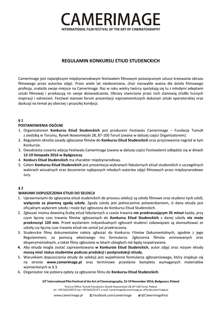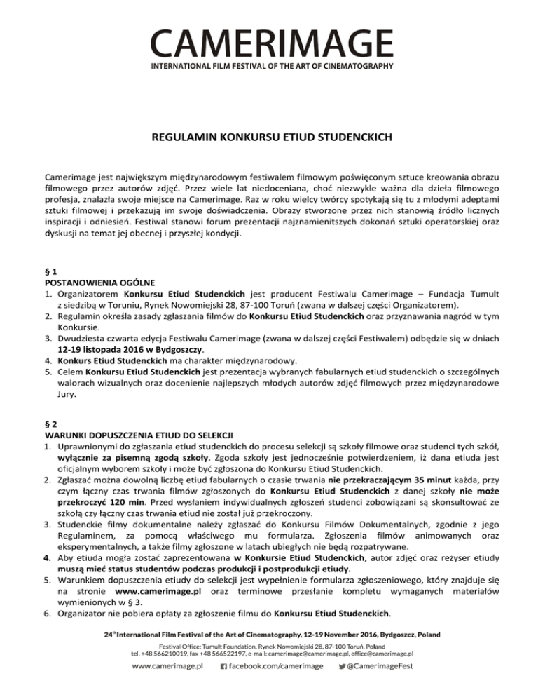 REGULAMIN KONKURSU ETIUD STUDENCKICH Camerimage jest największym międzynarodowym festiwalem filmowym poświęconym sztuce kreowania obrazu filmowego przez autorów zdjęć. Przez wiele lat niedoceniana, choć niezwykle ważna dla dzieła filmowego profesja, znalazła swoje miejsce na Camerimage. Raz w roku wielcy twórcy spotykają się tu z młodymi adeptami sztuki filmowej i przekazują im swoje doświadczenia. Obrazy stworzone przez nich stanowią źródło licznych inspiracji i odniesień. Festiwal stanowi forum prezentacji najznamienitszych dokonań sztuki operatorskiej oraz dyskusji na temat jej obecnej i przyszłej kondycji. §1 POSTANOWIENIA OGÓLNE 1. Organizatorem Konkursu Etiud Studenckich jest producent Festiwalu Camerimage – Fundacja Tumult z siedzibą w Toruniu, Rynek Nowomiejski 28, 87-100 Toruń (zwana w dalszej części Organizatorem). 2. Regulamin określa zasady zgłaszania filmów do Konkursu Etiud Studenckich oraz przyznawania nagród w tym Konkursie. 3. Dwudziesta czwarta edycja Festiwalu Camerimage (zwana w dalszej części Festiwalem) odbędzie się w dniach 12-19 listopada 2016 w Bydgoszczy. 4. Konkurs Etiud Studenckich ma charakter międzynarodowy. 5. Celem Konkursu Etiud Studenckich jest prezentacja wybranych fabularnych etiud studenckich o szczególnych walorach wizualnych oraz docenienie najlepszych młodych autorów zdjęć filmowych przez międzynarodowe Jury. §2 WARUNKI DOPUSZCZENIA ETIUD DO SELEKCJI 1. Uprawnionymi do zgłaszania etiud studenckich do procesu selekcji są szkoły filmowe oraz studenci tych szkół, wyłącznie za pisemną zgodą szkoły. Zgoda szkoły jest jednocześnie potwierdzeniem, iż dana etiuda jest oficjalnym wyborem szkoły i może być zgłoszona do Konkursu Etiud Studenckich. 2. Zgłaszać można dowolną liczbę etiud fabularnych o czasie trwania nie przekraczającym 35 minut każda, przy czym łączny czas trwania filmów zgłoszonych do Konkursu Etiud Studenckich z danej szkoły nie może przekroczyć 120 min. Przed wysłaniem indywidualnych zgłoszeń studenci zobowiązani są skonsultować ze szkołą czy łączny czas trwania etiud nie został już przekroczony. 3. Studenckie filmy dokumentalne należy zgłaszać do Konkursu Filmów Dokumentalnych, zgodnie z jego Regulaminem, za pomocą właściwego mu formularza. Zgłoszenia filmów animowanych oraz eksperymentalnych, a także filmy zgłoszone w latach ubiegłych nie będą rozpatrywane. 4. Aby etiuda mogła zostać zaprezentowana w Konkursie Etiud Studenckich, autor zdjęć oraz reżyser etiudy muszą mieć status studentów podczas produkcji i postprodukcji etiudy. 5. Warunkiem dopuszczenia etiudy do selekcji jest wypełnienie formularza zgłoszeniowego, który znajduje się na stronie www.camerimage.pl oraz terminowe przesłanie kompletu wymaganych materiałów wymienionych w § 3. 6. Organizator nie pobiera opłaty za zgłoszenie filmu do Konkursu Etiud Studenckich. Strona |2 7. Ostateczny termin zgłaszania etiud do selekcji oraz przesłania wszystkich wymaganych materiałów upływa 31 sierpnia 2016. Uwaga: Liczy się data wpłynięcia materiałów do Organizatora. Brak materiałów lub materiały przesłane po wskazanym terminie oznacza usunięcie zgłoszonej etiudy z selekcji. 8. Do selekcji mogą zostać zakwalifikowane jedynie etiudy fabularne, do których istnieje kopia pokazowa w jednym z następujących formatów: DCP (Digital Cinema Package) lub plik video według specyfikacji podanej w § 6. Kopia pokazowa musi posiadać napisy angielskie (jeśli film nie jest w oryginale w języku angielskim). W momencie zgłaszania filmu do selekcji zgłaszający powinien zarezerwować kopię dla Organizatora na czas trwania Festiwalu. 9. W procesie selekcji będą brane pod uwagę wyłącznie etiudy zrealizowane po 1 stycznia 2015. 10. Premiera etiudy w jakiejkolwiek telewizji w Polsce, która odbędzie się przed 12 listopada 2016 wyklucza możliwość udziału filmu w Konkursie Etiud Studenckich. 11. Osoba zgłaszająca etiudę zobowiązana jest złożyć w formularzu zgłoszeniowym oświadczenie, że: a) jest uprawniona do dokonania zgłoszenia i udzielenia Organizatorowi określonej w Regulaminie licencji do korzystania z filmu i materiałów towarzyszących, tj. że przysługują jej wszelkie prawa autorskie i prawa pokrewne (producenckie, wykonawcze) lub jest upoważniona przez dysponenta tych praw do działania w jego imieniu i na jego rzecz w zakresie objętym zgłoszeniem, albo że b) jest uprawniona wyłącznie do dokonania zgłoszenia filmu i materiałów towarzyszących, a Organizator ma obowiązek odrębnego uzyskania od uprawnionego stosownej licencji na korzystanie z filmu. 12. W przypadku określonym w ust. 11 lit. b) warunkiem zakwalifikowania etiudy do Konkursu jest udzielenie Organizatorowi przez podmiot uprawniony stosownej, nieodpłatnej zgody (licencji) na korzystanie z etiudy na potrzeby Konkursu w sposób określony w Regulaminie i w stosownym czasie umożliwiającym udział etiudy w Konkursie. 13. W przypadku określonym w ust. 11 lit. a) Zgłaszający oświadcza, że w zakresie objętym Regulaminem przysługują mu (lub jego Mocodawcy) wyłączne i niczym nieograniczone prawa do etiudy i materiałów towarzyszących oraz że etiuda i materiały nie są obciążone prawami osób trzecich i praw takich nie naruszają. Oświadcza ponadto, że jest prawidłowo umocowany do dokonania zgłoszenia i udzielenia licencji, a umocowanie w chwili dokonywania zgłoszenia nie wygasło, ani nie zostało odwołane. W razie wystąpienia przez jakikolwiek podmiot do Organizatora z roszczeniami dotyczącymi naruszenia praw osób trzecich (w szczególności praw autorskich, wykonawczych, producenckich), Zgłaszający zobowiązuje się zaspokoić w całości słuszne roszczenia tych osób i zwolnić Organizatora z obowiązku wszelkich świadczeń z tego tytułu. 14. W przypadku określonym w ust. 11 lit. b) Zgłaszający oświadcza, że dokonuje zgłoszenia za 