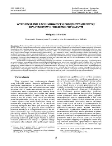 ISSN 2083-3725 www.ser.pswbp.pl Studia Ekonomiczne i Regionalne Economic and Regional Studies Tom/Volume IV, Nr/No 1/ 2011 WYKORZYSTANIE RACHUNKOWOŚCI W PODEJMOWANIU DECYZJI O PARTNERSTWIE PUBLICZNO-PRYWATNYM Małgorzata Garstka Uniwersytet Humanistyczno-Przyrodniczy Jana Kochanowskiego w Kielcach Streszczenie: Partnerstwo publiczno-prywatne jest metodą realizowania zadań publicznych samorządów. Z punktu widzenia podejmowania decyzji o wyborze takiego rozwiązania ważny wydaje się być również aspekt rachunkowy. W szczególności istotna wydaje się być kwestia obowiązków, jakie nałożone są na strony takich umów w zakresie rozwiązań ewidencyjnych, ujmowania aktywów, przychodów oraz ujawniania informacji w sprawozdaniach. Ustawa z dnia 29 września 1994 r. o rachunkowości nie uregulowała specyfiki takich umów. Jednostki mogą w tej sytuacji stosować krajowe standardy rachunkowości, a w przypadku ich braku - międzynarodowe standardy rachunkowości. Stąd możliwość stosowania w Polsce Interpretacji 12 Umowy na usługi koncesjonowane, wydanej przez Komitet do spraw Interpretacji Międzynarodowej Sprawozdawczości Finansowej. Interpretacja dotyczy wyłącznie koncesjobiorcy. Określa ogólne zasady ujmowania i wyceny zobowiązań i praw pochodnych zawartych w umowach na usługi koncesjonowane, a w tym dwa istotne zagadnienia: praw koncesjobiorcy do infrastruktury oraz ujmowania i wyceny wynagrodzeń umownych. W zależności od niepewności, na którą jest narażony koncesjobiorca w odniesieniu do uzyskania przyszłych przychodów otrzymywanych na mocy umowy koncesji, Interpretacja 12 rozróżnia dwa sposoby ujmowania przychodów: model składnika aktywów finansowych oraz model składnika wartości niematerialnych. Model składnika aktywów finansowych będzie miał zastosowanie wtedy, gdy koncesjobiorca ma bezwarunkowe prawo umowne do otrzymania środków pieniężnych lub innych aktywów finansowych od koncesjodawcy. Model składnika wartości niematerialnych z kolei będzie zastosowany w sytuacji, gdy koncesjobiorca otrzyma prawo pobierania opłat od użytkowników usługi. To prawo nie jest równoznaczne z prawem do otrzymania środków pieniężnych. W praktyce może wystąpić sytuacja powiązania obu rozwiązań i wtedy trzeba będzie połączyć oba modele, ujmując każdy rodzaj składnika wynagrodzenia odrębnie. się być również aspekt finansowy, a w tym spojrzenie na umowy partnerstwa publiczno-prywatnego od strony rachunkowości. W szczególności istotna wydaje się być kwestia obowiązków, jakie nałożone są na strony takich umów w zakresie proponowanych rozwiązań ewidencyjnych oraz informacji, jakie pojawiają się w ich sprawozdaniach – finansowych lub budżetowych. Podpisanie umowy partnerstwa publicznoprywatnego często skutkuje koniecznością dokonania zmian przyjętych przez jednostkę zasad (polityki) rachunkowości, zakresu sprawozdania, a być może także planu kont, celem ich dostosowania do nowego rodzaju działalności. Informacje z zakresu rachunkowości mogą okazać się istotne dla podejmowania decyzji. Spojrzenie na planowane umowy partnerstwa publiczno-prywatnego przez pryzmat możliwości i konieczności wypełnienia obowiązków w obszarze rachunkowości może być bardzo przydatne w planowaniu procesu, w tym w ocenie zdolności odczytania informacji zawartych w sprawozdaniach finansowych partnerów. Jest to tym bardziej trudne, że nie ma jasnych wymogów księgowych dotyczących umów między sektorem publicznym a prywatnym128. Wydaje się zatem, że działania zachęcające do stosowania tego Wprowadzenie Wiele inwestycji jest realizowanych obecnie przez jednostki sektora finansów publicznych we współpracy z podmiotami prywatnymi, ale rozwiązanie, jakim jest partnerstwo publiczno-prywatne, nadal pozostaje nowym elementem polskiej rzeczywistości. Partnerstwo publiczno-prywatne jest metodą finansowania zadań publicznych samorządów. Ten sposób realizacji zadań (inwestycji) opiera się na zapisach ustawy z dnia 19 grudnia 2008 roku o partnerstwie publiczno-prywatnym (dalej u.p.p.p.)126 oraz ustawę z dnia 9 stycznia 2009 roku o koncesji na roboty budowlane lub usługi (dalej u.k.r.b.u.)127. W literaturze fachowej najczęściej ten temat jest poruszany przez prawników, którzy chcą pokazać nowe możliwości realizacji inwestycji, w szczególności wskazać na warunki zastosowania tego rozwiązania, wymogi prawne jakie należy spełnić, aby móc je prawidłowo zastosować oraz różnice między tym rozwiązaniem, a zwykłą procedurą zamówień publicznych. Ważny z punktu widzenia podejmowania decyzji o wyborze takiego rozwiązania dla realizacji celów publicznych wydaje 126 127 Ustawa z dnia 19 grudnia 2008 r. o partnerstwie publiczno – prywatnym, Dz. U. Nr 19, poz. 100 ze zm. Ustawa z dnia 9 stycznia 2009 r. o koncesji na roboty budowlane lub usługi, Dz. U. Nr 19, poz. 101 ze zm. 128 95 J. Buisman, A. Lattafi, Zakres i wpływ KIMSF 12, Aktualności MSSF, PricewaterhouseCoopers, e-rachunkowosc.pl/artykul.php?view=782. Studia Ekonomiczne i Regionalne Nr 1 (IV) 2011 Wykorzystanie rachunkowości... typu rozwiązania powinny swoim zakresem obejmować również pokazanie istotnych kwestii dotyczących rachunkowości, tak aby rzetelnie przedstawić wszystkie plusy i minusy polecanego rozwiązania. Niniejszy artykuł odnosi się właśnie do kwestii rachunkowości, które mogą być istotne i przydatne – w różnym stopniu dla konkretnego przypadku – w podejmowaniu decyzji o zawarciu umowy partnerstwa publicznoprywatnego. zakresu i rodzaju prezentacji informacji w sprawozdaniach. Jest to jednak decyzja skutkująca w istotny sposób również w obszarze rachunkowości zarówno dla podmiotów prywatnych, których rachunkowość w tym względzie jest szczegółowo uregulowana i które muszą się do tych regulacji odpowiednio dostosować, jak i dla podmiotów sektora finansów publicznych. Te drugie po