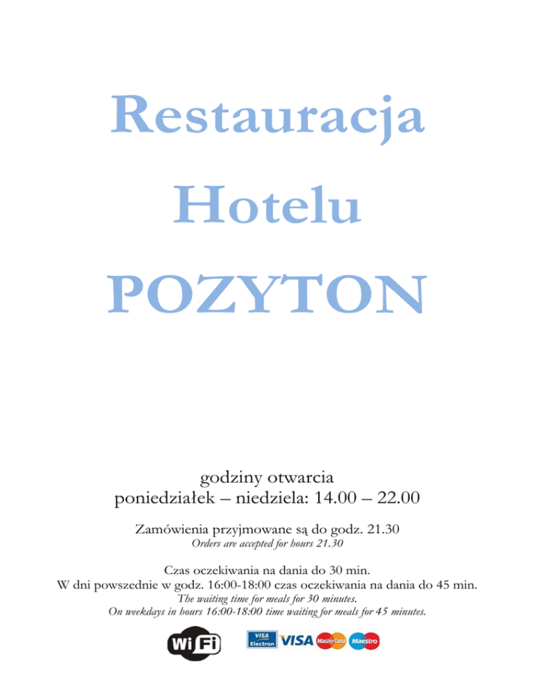 Restauracja Hotelu POZYTON godziny otwarcia poniedziałek – niedziela: 14.00 – 22.00 Zamówienia przyjmowane są do godz. 21.30 Orders are accepted for hours 21.30 Czas oczekiwania na dania do 30 min. W dni powszednie w godz. 16:00-18:00 czas oczekiwania na dania do 45 min. The waiting time for meals for 30 minutes. On weekdays in hours 16:00-18:00 time waiting for meals for 45 minutes. Przystawki Starters /150 g/ Krążki cebulowe W 5,00 zł Onion rings Mini placek po węgiersku 13,00 zł Mini cake in Hungarian Sałata z grillowanym kurczakiem 7,00 zł Salad with grilled chicken Sałata grecka W 7,00 zł Greek salad Sałaty podawana z grzanką. Salads served with toast. W – danie wegetariańskie W – vegetarian dish Zupy Soups /300 ml/ Rosół z makaronem 5,00 zł Chicken soup with noodles Żurek kujawski 6,50 zł Kuyavia soup Brokułowa z groszkiem ptysiowym 5,50 zł Broccoli with choux pastry balls Jarzynowa 5,00 zł Vegetable soup Dania mięsne Meat dishes Kotlet schabowy podawany z ziemniakami gotowanymi* i surówką z białej kapusty 19,00 zł Pork chop served with boiled potatoes* and coleslaw /150 g/ Pierś gotowana serwowana z ryżem* i gotowanymi warzywami 17,00 zł Boiled breast served with rice and boiled vegetables* /110 g/ Karkówka grillowana z opiekanymi ziemniakami* i sałatką warzywną 19,00 zł Chuck steak grilled with roasted potatoes* and vegetable salad /130 g/ Polędwiczki w sosie kaparowym z ziemniakami gotowanymi* i buraczkami 23,00 zł Tenderloin caper sauce with boiled potatoes* and beetroot /130 g/ *Przy daniach do wyboru: ziemniaki gotowane, ziemniaki opiekane, frytki, ryż. *With a choice of dishes: boiled potatoes, baked potatoes, french fries, rice. Dania rybne Fishs Sandacz gotowany na parze podawany z ryżem* i gotowanymi warzywami 25,00 zł Steamed zander served with rice* and boiled vegetables /140 g/ Dorsz panierowany z frytkami* i surówką z białej kapusty 21,00 zł Breaded cod with french fries* and coleslaw /150 g/ Łosoś grillowany z sosem cytrynowym serwowany na szpinaku z ziemniakami gotowanymi* 23,00 zł Grilled salmon with lemon sauce served with boiled potatoes* /140 g/ *Przy daniach do wyboru: ziemniaki gotowane, ziemniaki opiekane, frytki, ryż. *With a choice of dishes: boiled potatoes, baked potatoes, french fries, rice. Pierogi Dumplings /6 szt./ Pierogi ruskie podawane z okrasą z cebulki W 11,00 zł Dumplings served with gravy with onions Pierogi ze szpinakiem i fetą podawane z kwaśną śmietaną W 11,00 zł Dumplings with spinach and feta cheese served with sour cream Makarony Pasta /200 g/ Makaron z boczkiem i pieczarkami 9,00 zł Pasta with bacon and mushrooms Makaron z twarogiem W 7,00 zł Pasta with cheese W – danie wegetariańskie W – vegetarian dish Pizza Pizza /śr. 20 cm/ Pizza z suszonymi pomidorami i mozzarellą W 13,00 zł Pizza with sun-dried tomatoes and mozzarella Pizza z szynką, serem i pieczarkami 9,00 zł Pizza with ham, cheese and mushrooms Naleśniki Pancakes /2 szt./ Naleśniki z prażonym jabłkiem W 7,00 zł Pancakes with roasted apple Naleśniki ze szpinakiem W 7,00 zł Pancakes with spinach W – danie wegetariańskie W – vegetarian dish Desery Desserts /150 g/ Lody na gorących malinach 9,00 zł Ice cream on hot raspberries Szarlotka na ciepło z bitą śmietaną 9,00 zł Apple pie with whipped cream Lody z bitą śmietaną 9,00 zł Ice cream with whipped cream Crème brûlée 9,00 zł Deserowo 5,00 zł Ciastko z kawą/herbatą** Cake with coffee/tea** **Do wyboru. **Optional. Kawa i czekolada Coffee and chocolate Espresso 6,00 zł Espresso doppio 9,00 zł podwójne espresso Espresso macchiato 6,50 zł espresso z odrobiną mleka Cappuccino 7,00 zł espresso z dodatkiem spienionego mleka Caffè latte 7,50 zł espresso z dużą ilością gorącego mleka Latte macchiato 8,00 zł espresso z dużą ilością spienionego mleka Latte macchiato smakowe 9,00 zł smaki: amaretto, orzech, mięta, Irish Cream Latte Macchiato with syrup: amaretto, nut, mint, Irish Cream Kawa po wiedeńsku 8,50 zł espresso z gorącym mlekiem i bitą śmietaną posypaną czekoladą Viennese coffee Kawa czarna z ekspresu 5,50 zł Express Coffee Kawa czarna z ekspresu z mlekiem 6,00 zł White Express Coffee Kawa parzona 5,50 zł Brewed coffee Kawa mrożona 8,00 zł kawa z lodami i bitą śmietaną Iced coffee with ice carem and cream Gorąca czekolada z bitą śmietaną 7,00 zł Hot chocolate Gorąca czekolada z syropem 8,00 zł smaki: amaretto, orzech, mięta, Irish Cream Hot chocolate with syroup: amaretto, nut, mint, Irish Cream Herbata Tea Dzbanek 0,4 l 6,00 zł Tea pot Earl Grey 3-4 min. Mieszanka czarnych herbat z Chin i Indii aromatyzowana bergamotką. Assam Bari 3-4 min. Lekko słodkawa, korzenna, rasowa i ekstrawagancka. Oriental Oolong 3-4 min. Delikatny Oolong z odcieniem soczystych truskawek i ananasów płynącym z owoców Lulo i słodkich daktyli. Darjeeling Summer Gold 3-4 min. Lekki kwiatowy i bogaty aromat. Wellness Fitness Tea 5 min. Orzeźwiająca herbatka z liści krzewu Rooibos, kopru włoskiego, listków jeżyn, palczatki cytrynowej, pomarańczy, mięty, anyżu i cynamonu. Fruity Camomile 5-8 min. Wyśmienity napar rumianku z miłą nutką skórki pomarańczy. Sweet Berries 8-10 min. Delikatna kompozycja złożona z truskawek, malin jabłek, hibiskusa, dzikiej róży, listków jeżyn i pomarańczy. Green Dragon 2-3 min. Ręcznie zwijane delikatne listki z wiosennego zbioru nadają tej ekskluzywnej herbacie odświeżający smak oraz przyjemnie delikatną cierpkość. Napoje zimne Cold drinks Woda gazowana i niegazowana 0,25 l 3,00 zł Sparking/Still mineral water Soki 0,2 l 4,00 zł pomarańcza, jabłko, grejpfrut, pomidor, czarna porzeczka, multiwitamina orange juice, apple juice, grapefruit juice, tomato juice, black currant juice, multivitamin juice Soki 1 l 7,00 zł pomarańcza, jabłko, grejpfrut, czarna porzeczka orange juice, apple juice, grapefruit juice, currant juice Napoje 0,2 l 4,00 zł Coc