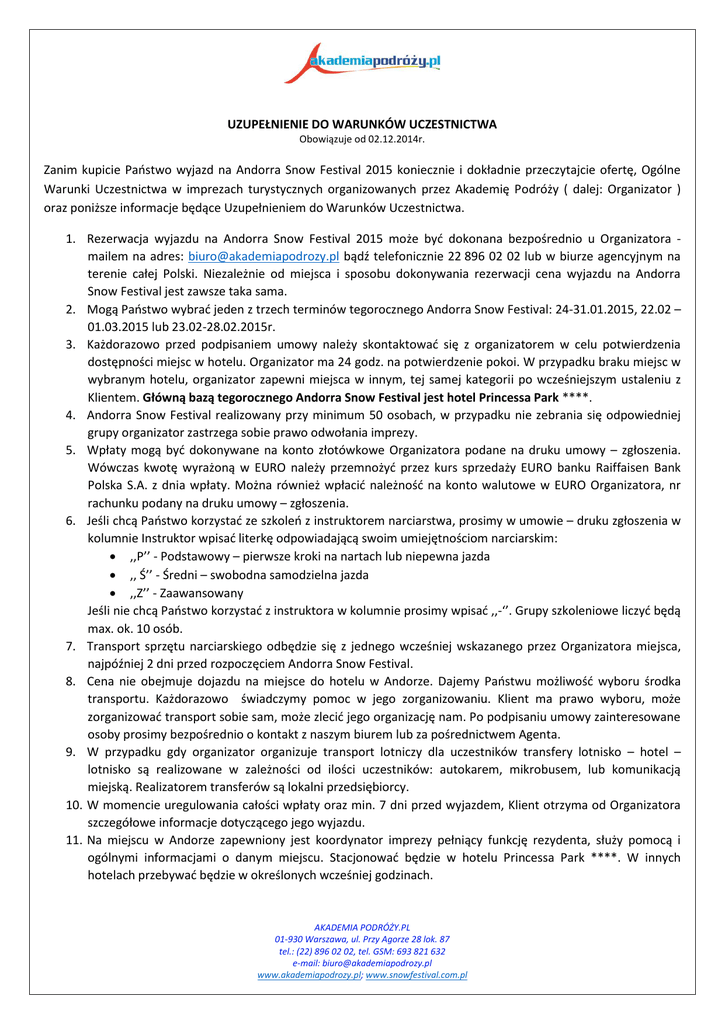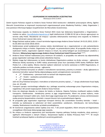 UZUPEŁNIENIE DO WARUNKÓW UCZESTNICTWA Obowiązuje od 02.12.2014r. Zanim kupicie Państwo wyjazd na Andorra Snow Festival 2015 koniecznie i dokładnie przeczytajcie ofertę, Ogólne Warunki Uczestnictwa w imprezach turystycznych organizowanych przez Akademię Podróży ( dalej: Organizator ) oraz poniższe informacje będące Uzupełnieniem do Warunków Uczestnictwa. 1. Rezerwacja wyjazdu na Andorra Snow Festival 2015 może być dokonana bezpośrednio u Organizatora mailem na adres: [email protected] bądź telefonicznie 22 896 02 02 lub w biurze agencyjnym na terenie całej Polski. Niezależnie od miejsca i sposobu dokonywania rezerwacji cena wyjazdu na Andorra Snow Festival jest zawsze taka sama. 2. Mogą Państwo wybrać jeden z trzech terminów tegorocznego Andorra Snow Festival: 24-31.01.2015, 22.02 – 01.03.2015 lub 23.02-28.02.2015r. 3. Każdorazowo przed podpisaniem umowy należy skontaktować się z organizatorem w celu potwierdzenia dostępności miejsc w hotelu. Organizator ma 24 godz. na potwierdzenie pokoi. W przypadku braku miejsc w wybranym hotelu, organizator zapewni miejsca w innym, tej samej kategorii po wcześniejszym ustaleniu z Klientem. Główną bazą tegorocznego Andorra Snow Festival jest hotel Princessa Park ****. 4. Andorra Snow Festival realizowany przy minimum 50 osobach, w przypadku nie zebrania się odpowiedniej grupy organizator zastrzega sobie prawo odwołania imprezy. 5. Wpłaty mogą być dokonywane na konto złotówkowe Organizatora podane na druku umowy – zgłoszenia. Wówczas kwotę wyrażoną w EURO należy przemnożyć przez kurs sprzedaży EURO banku Raiffaisen Bank Polska S.A. z dnia wpłaty. Można również wpłacić należność na konto walutowe w EURO Organizatora, nr rachunku podany na druku umowy – zgłoszenia. 6. Jeśli chcą Państwo korzystać ze szkoleń z instruktorem narciarstwa, prosimy w umowie – druku zgłoszenia w kolumnie Instruktor wpisać literkę odpowiadającą swoim umiejętnościom narciarskim: ,,P’’ - Podstawowy – pierwsze kroki na nartach lub niepewna jazda ,, Ś’’ - Średni – swobodna samodzielna jazda ,,Z’’ - Zaawansowany Jeśli nie chcą Państwo korzystać z instruktora w kolumnie prosimy wpisać ,,-‘’. Grupy szkoleniowe liczyć będą max. ok. 10 osób. 7. Transport sprzętu narciarskiego odbędzie się z jednego wcześniej wskazanego przez Organizatora miejsca, najpóźniej 2 dni przed rozpoczęciem Andorra Snow Festival. 8. Cena nie obejmuje dojazdu na miejsce do hotelu w Andorze. Dajemy Państwu możliwość wyboru środka transportu. Każdorazowo świadczymy pomoc w jego zorganizowaniu. Klient ma prawo wyboru, może zorganizować transport sobie sam, może zlecić jego organizację nam. Po podpisaniu umowy zainteresowane osoby prosimy bezpośrednio o kontakt z naszym biurem lub za pośrednictwem Agenta. 9. W przypadku gdy organizator organizuje transport lotniczy dla uczestników transfery lotnisko – hotel – lotnisko są realizowane w zależności od ilości uczestników: autokarem, mikrobusem, lub komunikacją miejską. Realizatorem transferów są lokalni przedsiębiorcy. 10. W momencie uregulowania całości wpłaty oraz min. 7 dni przed wyjazdem, Klient otrzyma od Organizatora szczegółowe informacje dotyczącego jego wyjazdu. 11. Na miejscu w Andorze zapewniony jest koordynator imprezy pełniący funkcję rezydenta, służy pomocą i ogólnymi informacjami o danym miejscu. Stacjonować będzie w hotelu Princessa Park ****. W innych hotelach przebywać będzie w określonych wcześniej godzinach. AKADEMIA PODRÓŻY.PL 01-930 Warszawa, ul. Przy Agorze 28 lok. 87 tel.: (22) 896 02 02, tel. GSM: 693 821 632 e-mail: [email protected] www.akademiapodrozy.pl; www.snowfestival.com.pl 12. Zakwaterowanie odbywa się w hotelach o kategorii wybranej przez Klienta. Podana kategoria hotelu jest zgodna z nadaną kategorią według norm obowiązujących w Andorze, jest ona zbliżona do norm polskich. Doba hotelowa rozpoczyna się o godz. 14.00 a kończy o godzinie 12.00 dnia następnego. W dniu wyjazdu pokoje należy opuścić do tej godziny. W przypadku, gdy rozpoczęcie podróży powrotnej jest zaplanowane w godzinach wieczornych, bagaż można pozostawić w wyznaczonym przez hotel miejscu lub w przechowalni bagażu. 13. Oferowane pokoje są standardowymi pokojami dwuosobowymi z łazienką z możliwością dostawki. Pokoje wyposażone są w dwa oddzielne łóżka lub jedno tzw. małżeńskie 14. We wszystkich hotelach śniadania podawane są w formie bufetu. Natomiast kolacje w hotelu Princessa Parc, Holiday Inn oraz Patagonia są podawane w formie bufetu, a w hotelu Xalet Verdu serwowane są do stolika. Do każdej kolacji mają Państwo w cenie wodę bez limitu oraz 0,5l wina stołowego dla każdego uczestnika. 15. Zwracamy też uwagę na dodatkowe opłaty stosowane w hotelach w Andorze za korzystanie z udogodnień takich jak SPA: Princessa Parc – koszt ok. 15 Euro za 2 h, w Holiday Inn jest małe SPA w cenie – jacuzzi, Hammam, mały basen, w Patagoni – SPA dla max 4 osób kosztuje na pól godziny 12Euro, ta cena jest ważna zarówno dla 1, 2,3 czy 4 osób, w Xalet Verdu nie ma SPA goście mogą korzytsać ze SPA w Princessa Parc . Sejfy w pokojach hotelowych z reguły są bezpłatne, należy zapłacić jedynie depozyt w recepcji hotelowej ok. 10 EURO. WI FI jest bezpłatne w pokojach i w lobby hotelowych, niemniej zasięg może w 100% nie dochodzić do wszystkich pokoi. Prosimy też pamiętać, że korzystanie z zawartości mini baru w pokoju jest odpłatne. Wykonywanie połączeń zewnętrznych z aparatu telefonicznego znajdującego się w pokoju jest także odpłatne i winno być uregulowane w recepcji przed wyjazdem. 16. Ubezpieczenie od chorób przewlekłych wynosi: W terminie 24.01.2015 - 31.01.2015 - dopłata 160 zł / os. W terminie 23.02.2015 - 28.02.2015 – dopłata 110 zł / os. W terminie 22.02.2015 - 01.03.2015 – dopłata 160 zł / os. 17. Ubezpieczenie dodatkowe - 
