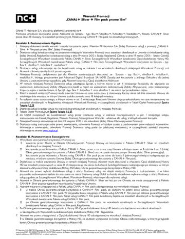 Warunki Promocji „CANAL+ Silver + Film pack promo 18m” Oferta ITI Neovision S.A. dostawcy platformy satelitarnej nc+. Promocja umożliwia korzystanie przez Abonenta ze Sprzętu - typ: Box+/ultraBox+/turboBox+/mediaBox+, Pakietu CANAL+ Silver przez okres 18 miesięcy na zasadach promocyjnych, Pakietu usług CANAL+ Film pack na zasadach promocyjnych. Rozdział I. Postanowienia Ogólne 1. Niniejszy dokument określa warunki i zasady korzystania przez Klientów ITI Neovision S.A. (dalej: Dostawca usług) z promocji „CANAL+ Silver + Film pack promo 18m”, (dalej: Promocja). 2. Dostawca usług świadczy usługi na podstawie niniejszych Warunków Promocji oraz zasadach określonych w Umowie o świadczenie usług (dalej: Umowa), Regulaminie świadczenia usług z dnia 19 marca 2013 r. (dalej: Regulamin), Cenniku z dnia 19 marca 2013 r. (dalej: Cennik), Szczegółowych Warunkach świadczenia Pakietu CANAL+ Silver, Szczegółowych Warunkach świadczenia Opcji dodatkowej History HD, Szczegółowych Warunkach świadczenia Pakietu usług CANAL+ Film pack, Szczegółowych Warunkach korzystania ze Sprzętu – typ: Box+, ultraBox+, turboBox+, mediaBox+. 3. Dostawca usług zobowiązuje się do świadczenia usług w zakresie i na warunkach określonych niniejszymi Warunkami Promocji, zaś Abonent zobowiązuje się do ich przestrzegania. 4. Niniejsza Promocja dedykowana jest dla Klientów zamierzających skorzystać ze Sprzętu – typ: Box+, ultraBox+, turboBox+, mediaBox+, którego producentem jest Advanced Digital Broadcast SA (ADB). Zasadą jest korzystanie z jednego Dekodera dla jednej Umowy, z zastrzeżeniem przypadków, gdy Abonent korzysta z Opcji dodatkowej Multiroom. 5. W ramach niniejszej Promocji Dostawca usług udostępnia Sprzęt, o którym mowa w ust. 4 niniejszego Rozdziału, do używania za uiszczeniem Jednorazowej Opłaty Aktywacyjnej bądź w najem za uiszczaniem Jednorazowej Opłaty Aktywacyjnej oraz miesięcznego Czynszu najmu z zastrzeżeniem, iż Sprzęt – typ: Box+, turboBox+ oraz ultraBox+ nie może być przedmiotem najmu. 6. Klient w ramach niniejszej Promocji może zawrzeć Umowę na czas oznaczony tj. stanowiący łączny okres od dnia zawarcia Umowy do ostatniego dnia miesiąca, w którym Umowa została zawarta oraz 18 kolejnych miesięcy. 7. Po upływie czasu oznaczonego, o którym mowa w ust. 6 niniejszego Rozdziału Umowa ulega przekształceniu na czas nieoznaczony na zasadach określonych w Regulaminie, niniejszych Warunkach Promocji, w szczególności określonych w Tabeli Opłat Promocyjnych (patrz Tabela 1,2,3 1,2,3) ,3 ). 8. Dostawca usług świadczy usługi na warunkach promocyjnych określonych w niniejszej Promocji: 1) Tabela Opłat Promocyjnych (patrz Tabela 1,2,3 1,2,3) ,3 ), 2) do Opłat związanych ze świadczeniem usług przez Dostawcę usług, w zakresie nieuregulowanym w pkt. 1 niniejszego ustępu, zastosowanie ma Cennik, Regulamin, Warunki Promocji, Szczegółowe Warunki – właściwe dla usług, z których Abonent korzysta. 9. Niniejsza Promocja obowiązuje od dnia 28 sierpnia 2013 r. do odwołania (dalej: Okres Obowiązywania Promocji). 10. Dostawca usług zastrzega sobie prawo zawieszenia, odwołania Promocji w każdym czasie, z zachowaniem praw nabytych Abonentów. Informacje o zawieszeniu, odwołaniu Promocji Dostawca usług poda do publicznej wiadomości, w szczególności zamieści stosowną informację na stronie www.ncplus.pl. Rozdział II. Postanowienia Szczegółowe 1. Warunkami skorzystania/korzystania z Promocji są: 1) zawarcie przez Klienta w Okresie Obowiązywania Promocji Umowy na korzystanie z Pakietu CANAL+ Silver na zasadach określonych w niniejszej Promocji, 2) korzystanie przez Abonenta z Pakietu CANAL+ Silver, przez czas oznaczony Umowy, o którym mowa w Rozdziale I ust. 6 (dalej: Okres gwarantowanego korzystania z Pakietu CANAL+ Silver) oraz w czasie nieoznaczonym Umowy (dalej: Okres promocyjny), 3) korzystanie przez Abonenta z Pakietu usług CANAL+ Film pack przez okres do końca 1 (pierwszego) miesiąca następującego po miesiącu, w którym zawarto Umowę (dalej: Okres gwarantowanego korzystania z CANAL+ Film pack). 2. Dodatkowo w trakcie zawierania Umowy w ramach niniejszej Promocji, Abonent może skorzystać z włączenia Opcji dodatkowej History HD na zasadach promocyjnych w cenie 0 zł miesięcznie przez okres do końca 6 (szóstego) miesiąca następującego po miesiącu, w którym dokonano Aktywacji Opcji dodatkowej History HD (dalej: Okres gwarantowanego korzystania z History HD). 3. Abonent ma prawo wybrać dodatkowe usługi z oferty Dostawcy usług nie objęte niniejszą Promocją z zastrzeżeniem, iż w takim przypadku zobowiązany będzie do uiszczania na rzecz Dostawcy usług Opłat za każdą dodatkowo wybraną usługę z oferty Dostawcy usług zgodnie ze Szczegółowymi Warunkami, Warunkami Promocji, właściwymi dla wybranej usługi. 4. Abonent w Okresie gwarantowanego korzystania z Pakietu CANAL+ Silver ani też po tym Okresie, nie może zrezygnować z Pakietu CANAL+ Silver poza przypadkami rozwiązania/wygaśnięcia Umowy. 5. Abonent ma prawo zrezygnować z Pakietu usług CANAL+ Film pack udostępnianego na warunkach niniejszej Promocji: 1) w trakcie Okresu gwarantowanego korzystania z CANAL+ Film pack, ze skutkiem na ostatni dzień Okresu gwarantowanego korzystania z CANAL+ Film pack. W przypadku braku rezygnacji z Pakietu usług CANAL+ Film pack po Okresie gwarantowanego korzystania z CANAL+ Film pack, Pakiet usług CANAL+ Film pack świadczony będzie na zasadach określonych w Szczegółowych Warunkach świadczenia Pakietu usług CANAL+ Film pack, 2) po Okresie gwarantowanego korzystania z CANAL+ Film pack, na warunkach określonych w Szczegółowych Warunkach świadczenia Pakietu usług CANAL+ Film pack, Regulaminie.. 6. Po Okresie gwarantowanego korzystania z History HD Opcja dodatkowa History HD świadczona będzie na warunkach określonych w Szczegółowych Warunkach świadczenia Opcji dodatkowej