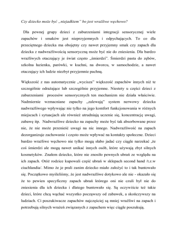 Czy dziecko może być „niejadkiem” bo jest wrażliwe węchowo? Dla pewnej grupy dzieci z zaburzeniami integracji sensorycznej wiele zapachów i smaków jest nieprzyjemnych i odpychających. To co dla przeciętnego dziecka ma obojętny czy nawet przyjemny smak czy zapach dla dziecka z nadwrażliwością sensoryczną może być nie do zniesienia. Dla bardzo wrażliwych otaczający je świat często „śmierdzi”. Śmierdzi pasta do zębów, szkolna łazienka, parówki, w kuchni, na dworcu, w samochodzie, a nawet otaczający ich ludzie niezbyt przyjemnie pachną. Większość z nas automatycznie „wycisza” większość zapachów innych niż te szczególnie odrażające lub szczególnie przyjemne. Niestety u części dzieci z zaburzeniami procesów sensorycznych ten mechanizm nie działa właściwie. Nadmiernie wzmacniane zapachy „zalewają” system nerwowy dziecka nadwrażliwego wpływając nie tylko na jego komfort funkcjonowania w różnych miejscach i sytuacjach ale również utrudniają uczenie się, koncentrację uwagi, zabawę itp. Nadwrażliwe dziecko na zapachy może być tak absorbowane przez nie, że nie może przenieść uwagi na nic innego. Nadwrażliwość na zapach dezorganizuje zachowanie i często może wpływać na kontakty społeczne. Dzieci bardzo wrażliwe węchowo nie tylko mogą słabo jadać czy ciągle narzekać ,że coś śmierdzi ale mogą nawet unikać innych osób, które używają zbyt silnych kosmetyków. Znałem dziecko, które nie znosiło pewnych ubrań ze względu na ich zapach. Otóż rodzice kupowali część ubrań w sklepach second hand /t.z.w ciuchlandia/. Mimo że je prali zanim dziecko miało założyć to i tak buntowało się. Początkowo myśleliśmy, że jest nadwrażliwe dotykowo ale nie - okazało się że to pewien specyficzny zapach ubrań którego oni nie czuli był nie do zniesienia dla ich dziecka i dlatego buntowało się. Są oczywiście też takie dzieci, które chcą wąchać wszystko począwszy od zabawek, a skończywszy na ludziach. Ci poszukiwacze zapachów najczęściej są mniej wrażliwi na zapach i potrzebują silnych wrażeń związanych z zapachem więc ciągle poszukują. Oczywiście można być nadwrażliwym na wiele smaków ale najczęściej te dzieci które wydają się nadwrażliwe smakowo są jednocześnie nadwrażliwe węchowo i raczej reagują na zapachy niż na smak. Część dzieci, które są bardzo wybredne w doborze pokarmów często nie są nadwrażliwe smakowo ale nadwrażliwe dotykowo i reagują bardziej na fakturę pokarmu niż na smak. Oczywiście mogą być i takie które są nadwrażliwe dotykowo, smakowo i węchowo. Niektóre dzieci są niejadkami i unikają gryzienia szczególnie nieco twardszych pokarmów takich jak mięso czy twarde jabłko ze względu na słabe napięcie mięśni szczęki. Część dzieci nie jada niektórych pokarmów ze względu na to jak wyglądają i wybiera według dla niego bezpiecznych zestawów kolorystycznych np. tylko białe pokarmy albo białe i żółte każdy inny zestaw kolorystyczny jest odrzucany to sygnał że mogą być nadwrażliwe wzrokowo. Czasem wydaje się nam ,że nasze nadwrażliwe dziecko lubi jakiś pokarm w domu głównie jada np. spaghetti i idąc do restauracji jesteśmy przekonani ,że jeśli zamówimy spaghetti to zje i wszyscy będą zadowoleni. Kelner przynosi jedzenie i zaczyna się jęczenie ,że ni jest takie jak zawsze i nie będzie jadł. Przyczyną może być inny kolor sosu, nieco inny zestaw ziół, bardziej twardy makaron, jedzenie jest bardziej zimne lub bardziej gorące niż zwykle itp. Takie narzekanie zwykle kończy się bitwą na siłę woli , kto wygra. Takie zachowanie dziecka związane z nadwrażliwością na zapach, czy smak nie wynika z jego złej woli, nie robi tego na złość rodzicom. Kiedy dziecko jest nadwrażliwe każdy cierpi, Ty bo nie chce jeść pokarmów, które wydają się smaczne i jadane przez inne dzieci, Twoje dziecko bo nakłaniasz je do jedzenia tego co dla niego jest obrzydliwe i nie możliwe do akceptacji. Główne objawy nadwrażliwości smakowej i na zapachy Nie jada większości lubianych przez dzieci w jego wieku pokarmów Ma bardzo wąski repertuar pokarmów , które jada Często mówi że śmierdzi Zatyka nos wchodząc do kuchni gdy gotujesz obiad Zatyka nos lub nie chce wchodzić do pomieszczeń publicznych /bar szybkiej obsługi/ obcych domów itp. Ma często odruch wymiotny w reakcji na smak jakiegoś pokarmu czy zapach Bywa zaniepokojony pewnymi zapachami, które dla ciebie są obojętne