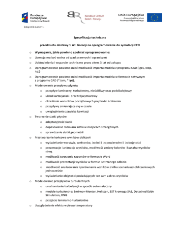 Załącznik numer 1. Specyfikacja techniczna przedmiotu dostawy 1 szt. licencji na oprogramowanie do symulacji CFD o Wymagania, jakie powinno spełniać oprogramowanie: o Licencja ma być wolna od wad prawnych i ograniczeń o Uaktualnienia i wsparcie techniczne przez okres 3 lat od zakupu o Oprogramowanie powinno mieć możliwość importu modelu z programu CAD (iges, step, itd.) o Oprogramowanie powinno mieć możliwość importu modelu w formacie natywnym z programu CAD (*.iam, *.ipt). o Modelowanie przepływu płynów o o o o o przepływ laminarny, turbulentny, nieściśliwy oraz poddźwiękowy o układ kartezjański oraz trójwymiarowy o określenie warunków początkowych prędkości i ciśnienia o przepływy zmieniające się w czasie o uwzględnienie zjawiska kawitacji Tworzenie siatki płynów o adaptacyjność siatki o dopasowanie rozmiaru siatki w miejscach szczególnych o sprawdzanie siatki geometrii Przetwarzanie końcowe wyników obliczeń o wyświetlanie warstwic, wektorów, izolinii i izopowierzchni i izobojętości o prezentacje i animacje wyników, możliwość zmiany kolorów i kształtu wyników strug o możliwość tworzenia raportów w formacie Word o możliwość prezentacji wyników w formie lustrzanego odbicia o możliwość analizowania i porównania wyników z kilku scenariuszy obliczeniowych jednocześnie o wyświetlanie objętości posiadających ten sam zakres wyników Modelowanie przepływów turbulentnych o uruchamianie turbulencji w sposób automatyczny o modele turbulentne: Smirnov-Menter, Hellsten, SST k-omega SAS, Detached Eddy Simulation, RNG o przejście laminarno-turbulentne Uwzględnienie efektu wpływu temperatury Załącznik numer 1. o Możliwość analizowania zewnętrznego przepływu wokół skomplikowanych geometrii traktowanych jako elementy powierzchniowe o Możliwości pracy nad projektem (środowisko pracy) o możliwość rozbudowy bazy materiałów o 2 solvery obliczeniowe o sprawdzanie poprawności geometrii modelu, moduł do automatycznej naprawy importowanej geometrii i szczelin o możliwość pracy niezależnie od środowiska CAD o budowa modułowa pozwalająca na możliwość dokupienia drugiego środowiska graficznego i wysyłania wyników do tego samego jądra obliczeniowego o tworzenie niestandardowych funkcjonalności za pomocą jednego z nowoczesnych języków programowania (preferowany Python) o Możliwość modelowania przepływów otwartych o Rodzaje ruchu płynów o Liniowy i kątowy o Połączenia liniowe i kątowe, a także orbitalne i kątowe o Możliwość zasymulowania osadzania się cząstek zanieczyszczających na przegrodzie filtracyjnej. o Dodatkowy program do modelowania 3D z możliwością natywnego importu geometrii oraz eksportu do aktualnego formatu DWG o Całkowitą integrację z systemem PDM Autodesk Vault Professional umożliwiającą pracę zarówno na plikach przechowywanych w repozytorium Autodesk Vault jaki i wyników symulacji CFD bezpośrednio z poziomu programu CFD (pobieranie plików / pobieranie praw do edycji / aktualizację plików na serwerze) łącznie ze wszystkimi zależnościami pomiędzy modelami CAD a wynikami symulacji.
